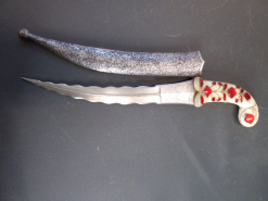 ![]() Alter Indischer Dolch mit Metallscheide gewellte Klinge Damast/Wootz? Griff weiße JadeeGun-ID: 20120922