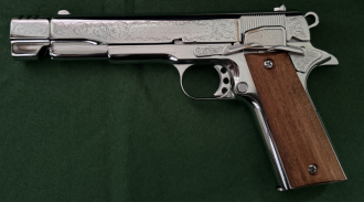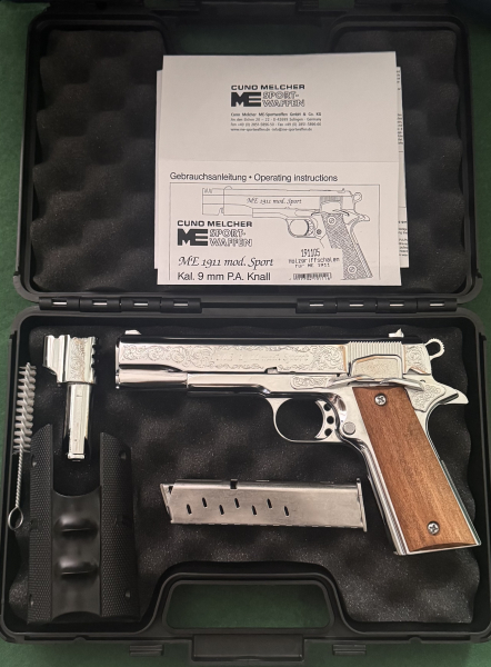 Me 1911 mod. Sport cal. 9mm P.A. Knall, PTB 930 !!! Handgraviert, verchromt, HolzgriffeeGun-ID: 20127656