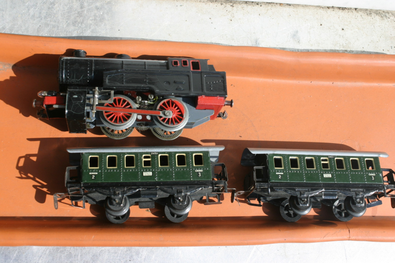 Aufziehlok mit 2 zeitgemäßen Personenwaggons aus den 50ern - BlechspielzeugeGun-ID: 20129586