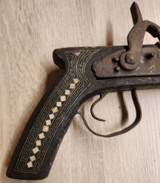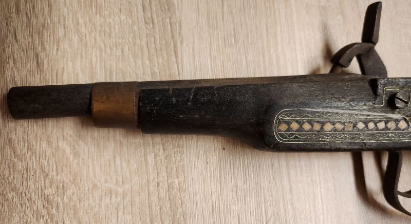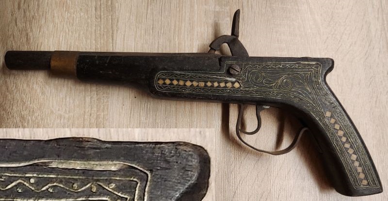 Alte Dekorations Pistole, mit Perlmutt und Metallbänder eingearbeiteteGun-ID: 20134604