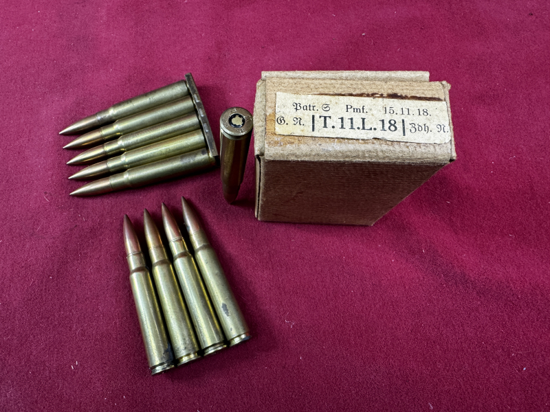 Patronen von 1915 mit Schachtel von 1918eGun-ID: 20190546 - Artikel-Nr des Verk.: Patronen 1918mSchach