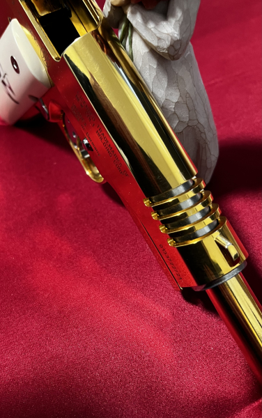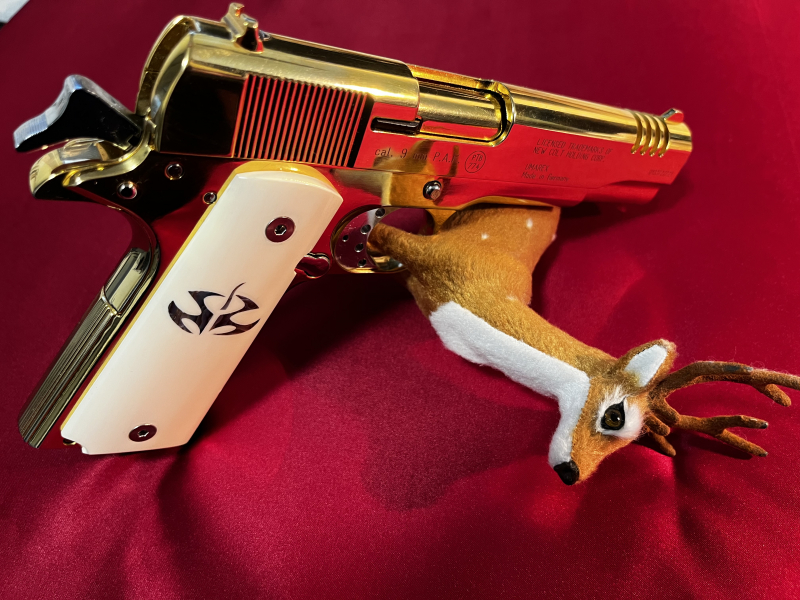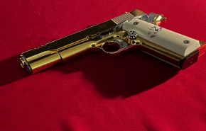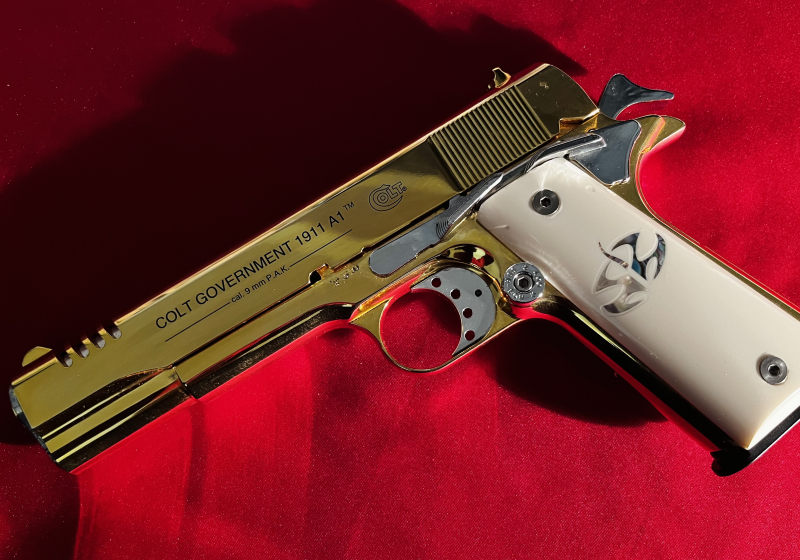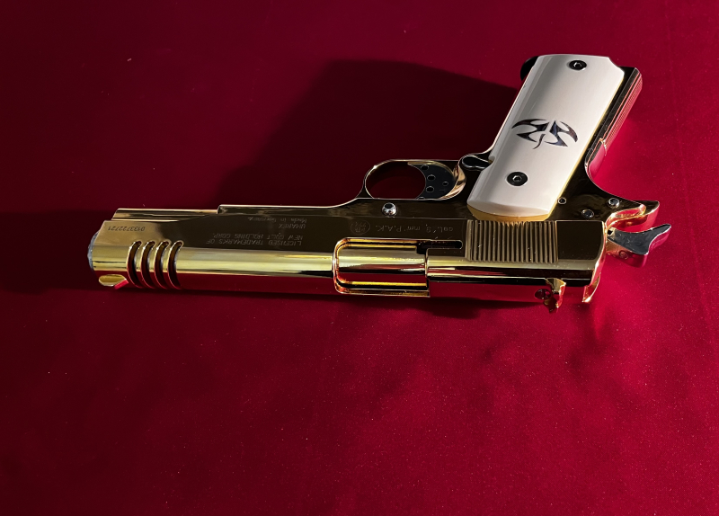 Veredelte Colt 1911 Gold, verchromte Bedienteilen, weiße Griffschalen, exklusives SammlerstückeGun-ID: 20210370