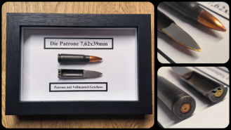 DIE PATRONE 7,62x39mm AK47 Schaukasten mit Schnittmodell kein wk2 Vitrine GESCHENKeGun-ID: 20210632