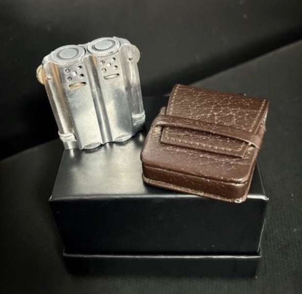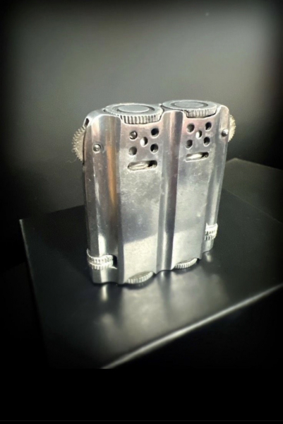 Sammlerwaffen/-munition > Sonstige Rares Doppel-Docht-Benzinfeuerzeug unabhängige Zündmechanik, Frühe Ingenieurskonstruk ca. 1945 PATeGun-ID: 20221705