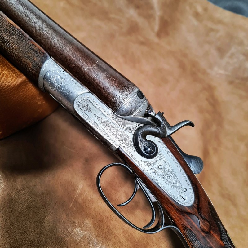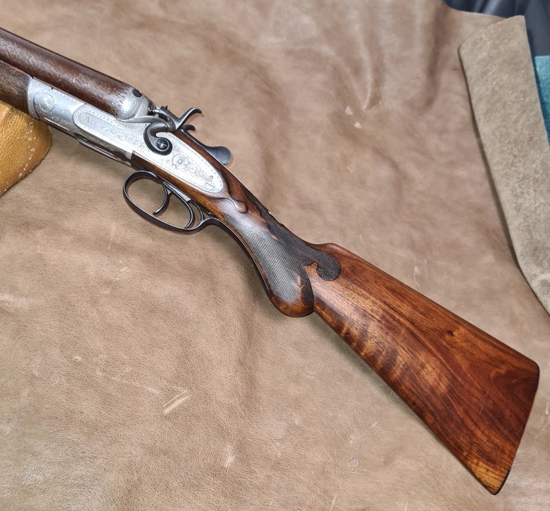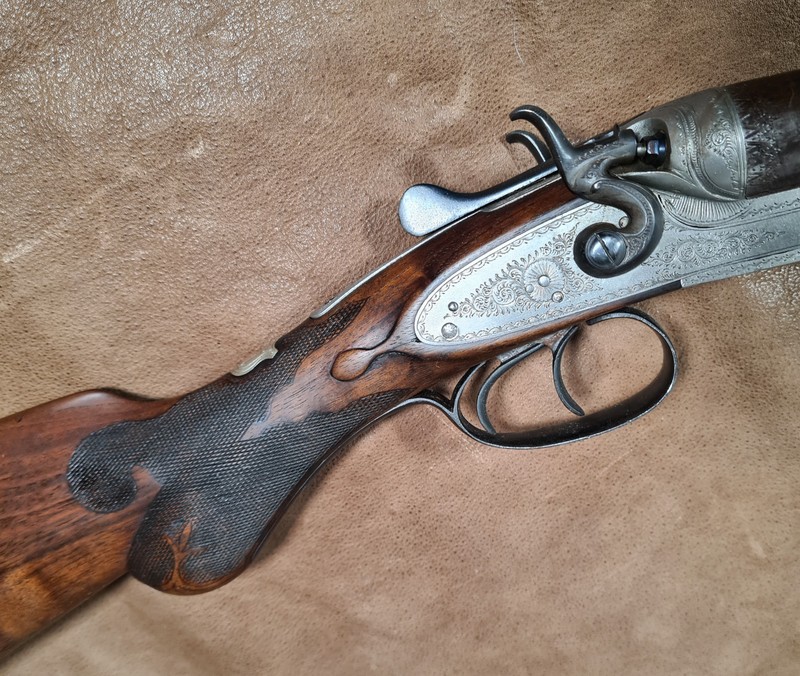 Sammlerwaffen/-munition > Gewehre > 1900 - 1945 Englische Hahnflinte: Damastläufe mit Nitrobeschuss 12/70eGun-ID: 20224250