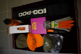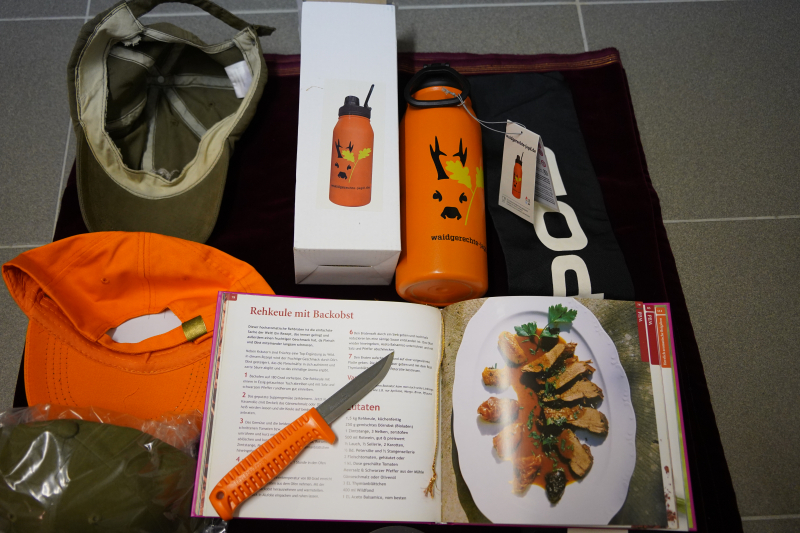 Jagdliches Konvolut: Messer, Caps, Flasche, Wildkochbuch, Futteral, tlw. neu, siehe Fotos!!eGun-ID: 20224330