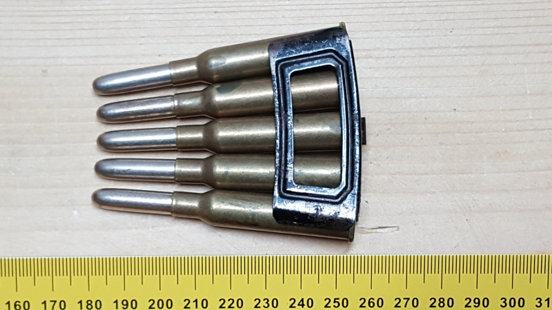 Sammlermunition: 5 Dekopatronen 6,5mm. Holland Mannlicher auf Ladestreifen.eGun-ID: 20233111 - Artikel-Nr des Verk.: 6