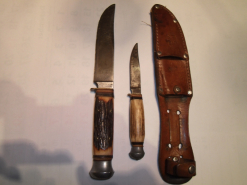 E. Knecht & Co., Solingen, Großes Jagdmesser mit Hirschhorngriff und LederscheideeGun-ID: 20241928 - Artikel-Nr des Verk.: 2