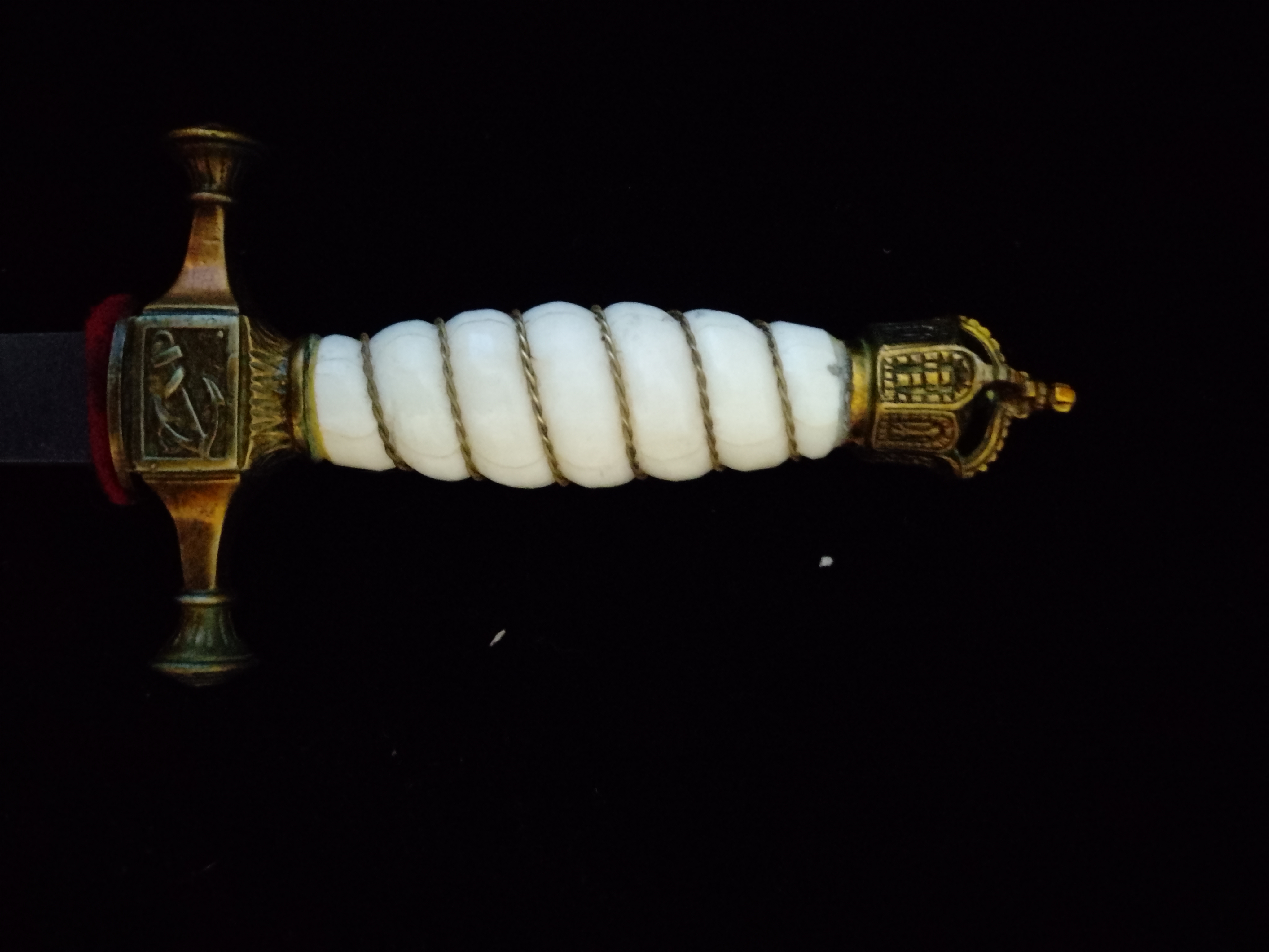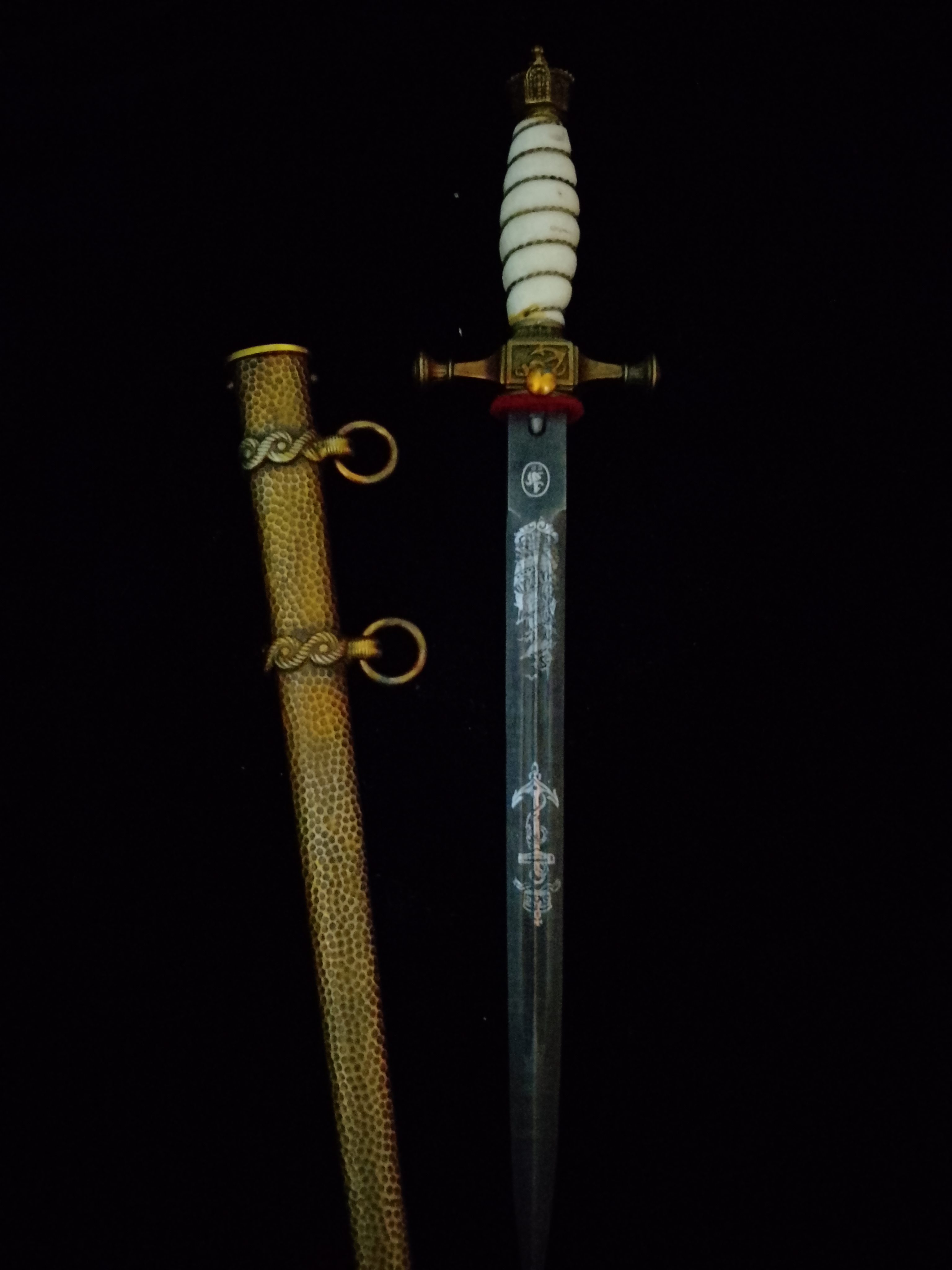 Deutscher Marine Dolch mit gehämmerter Scheide Bein Griff und ÄtzdamastklingeeGun-ID: 20292105