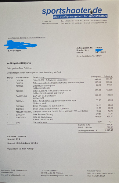 Dillon XL750 +Bulletfeeder +Hülsenzufuhr wie NeueGun-ID: 20294744