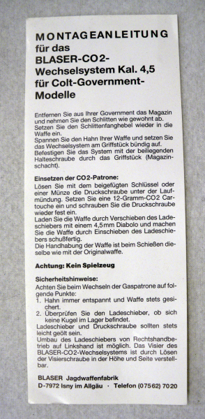 Grosskaliber Kurzwaffen > Sportpistolen > Colt Blaser CO2-Wechselsystem Kal. 4,5 für Colt Government Modelle - für SammlereGun-ID: 20300685