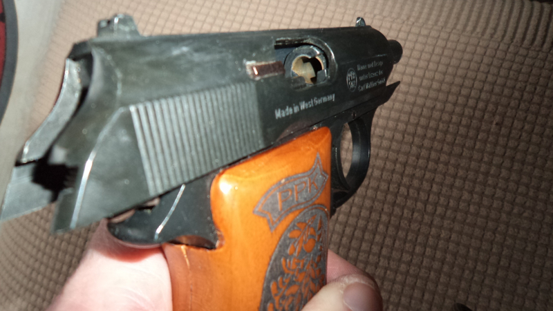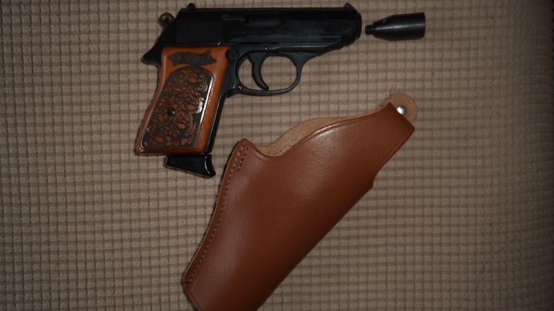 Walther PPK Kal. 8mm Knall mit Holzgriffschalen und LederholstereGun-ID: 20309011 - Artikel-Nr des Verk.: 14