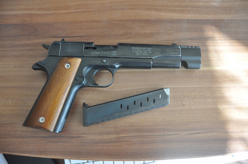 1911 Colt Gouverment A1, mit Diffuser und Holzgriffschalen, schwarz usedloopkeGun-ID: 20314992