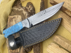 Handgefertigtes Damast-Bowiemesser. Jagdmesser. Survivalmesser. Outdoormesser. Mit Scheide.eGun-ID: 20321219 - Artikel-Nr des Verk.: FA997