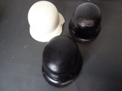 Konvolut von drei Feuerwehr Helme, zwei aus Kunststoff, einer aus Metall alle mit InnenfuttereGun-ID: 20323882