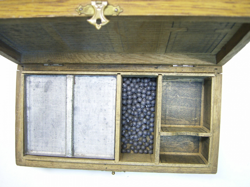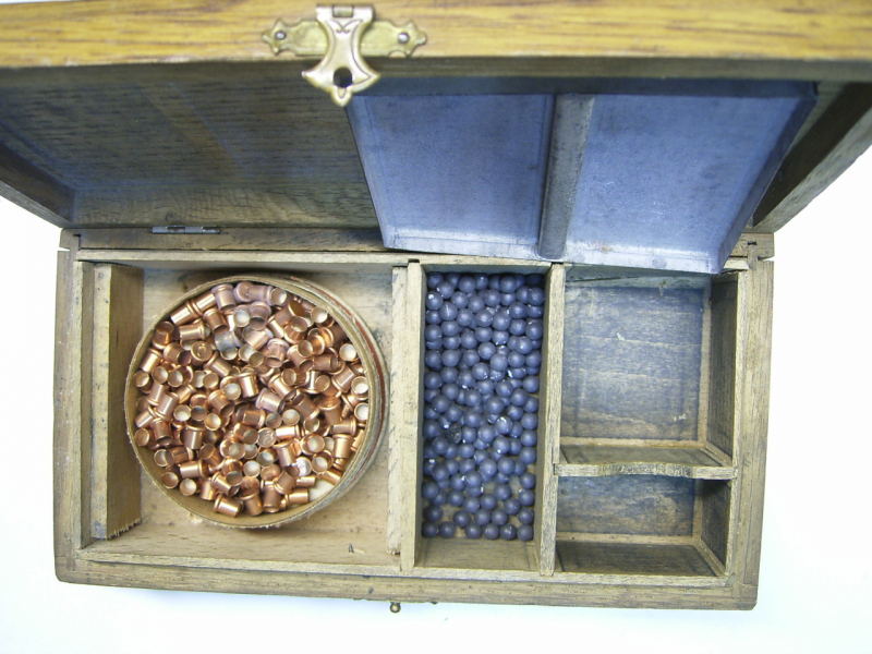 Antikes Kästchen für Schützenzubehör mit Zündhütchen und KugelneGun-ID: 20345520