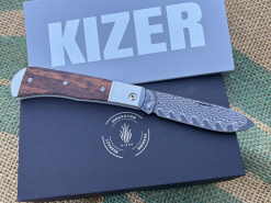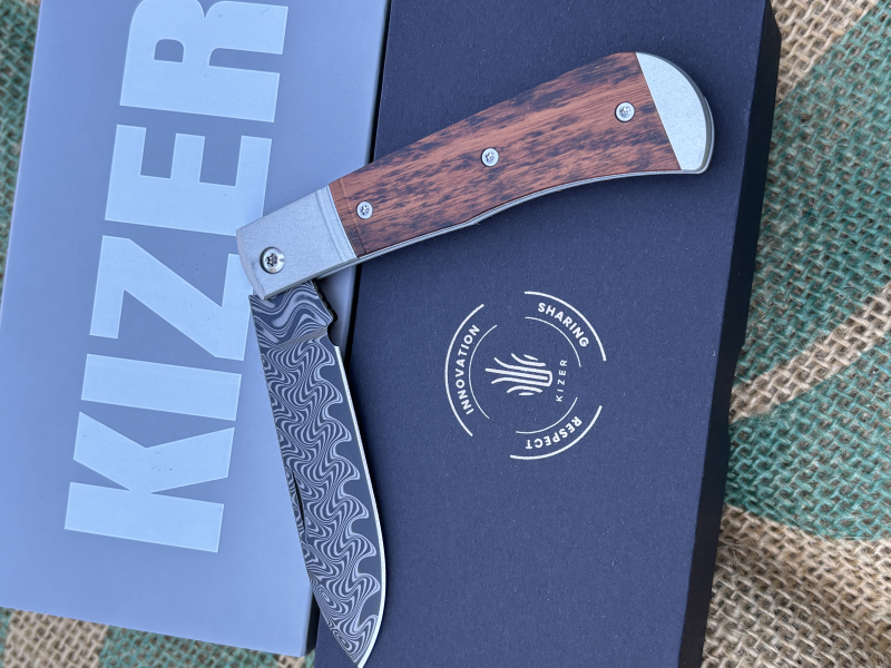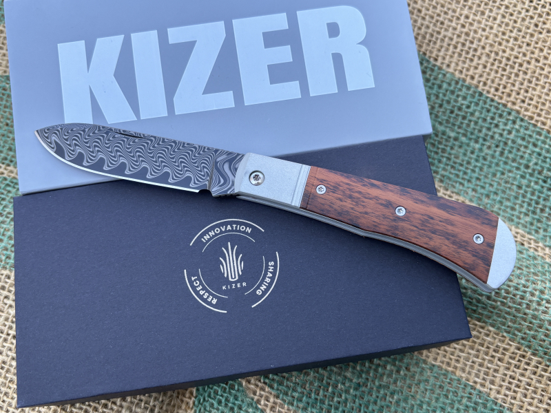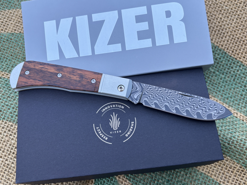 Kizer Trestle D Damascus Aluminum & Leopard Wood ZweihandtaschenmessereGun-ID: 20347346
