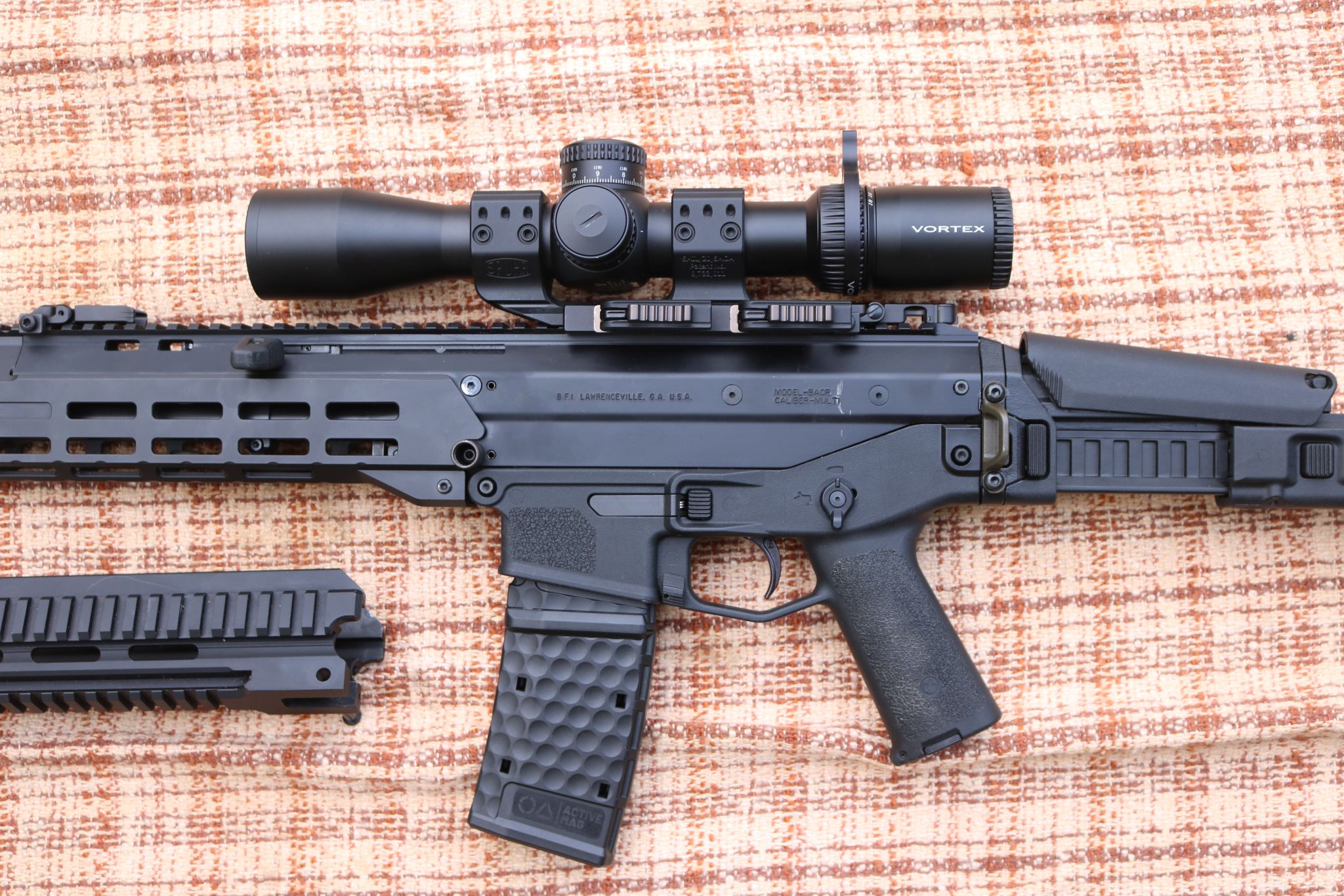 In der Waffe ist bereits ein Geissele Super ACR Trigger verbaut, außerdem ist im Angebot ein Midwest Industries M-LOK Handguard enthalten, dessen Produktion von Midwest Industries seit langem eingestellt worden ist!