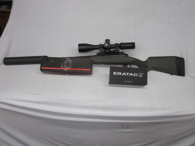 Komplettwaffe mit Zielfernrohr, Hawke, Sidewinder 3-12x50, Mil Dot, die ERATAC (Recknagel) Montage und einem, originalen A-Tec CarbonSchalldämpfer.