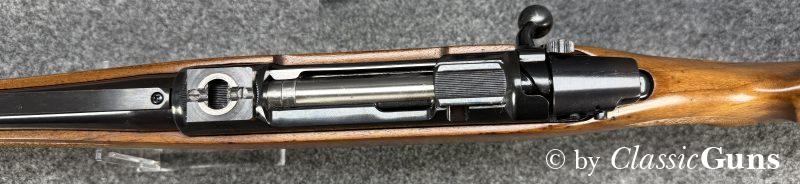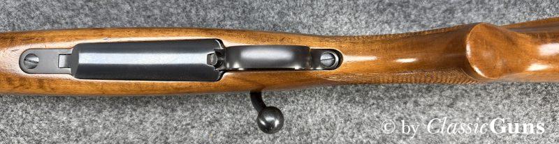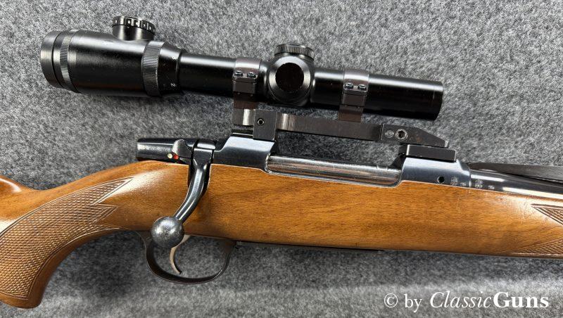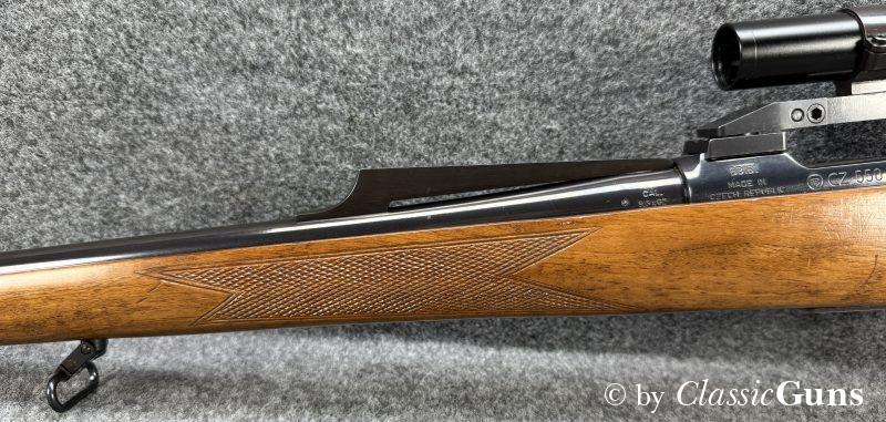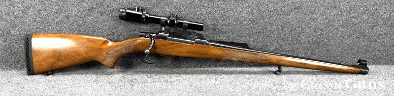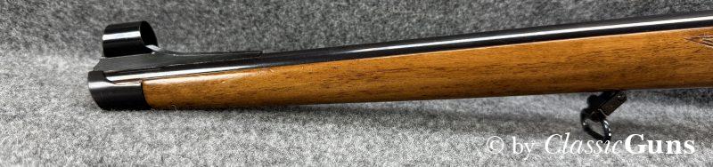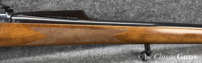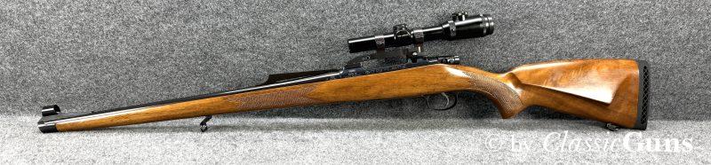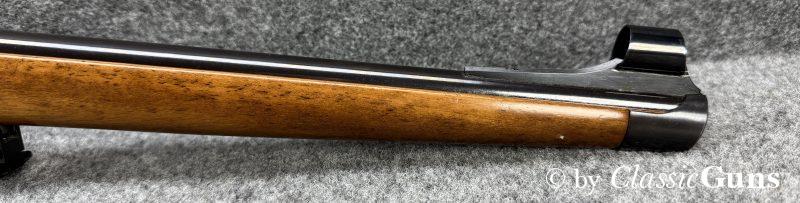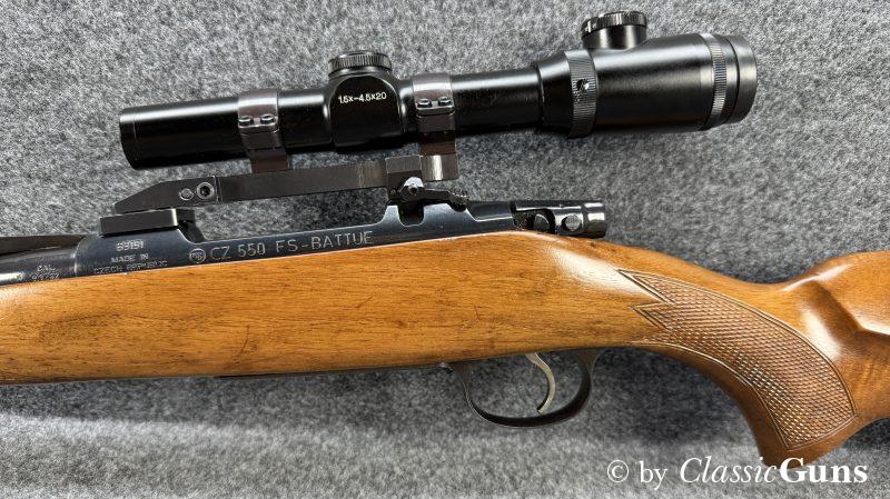 CZ 550 FS Battute Stutzen9,3x62Erstklassig erhaltener Stutzen aus bewährter und qualitativ hochwertiger tschechischer Fertigung, in unserer Büchsenmacherwerkstatt sorgfältig gereinigt und geprüft. 520 mm langer Lauf mit neuwertigem Zug-/ Feldprofil. Sehr gut erhaltene Brünierung. Schöner Nussbaum Vollschaft mit Bayrischer Backe und nur minimalen Gebrauchsspuren. Praxistauglicher und trocken stehender Direktabzug, Mittelschaftmagazin mit Klappdeckel und einer Kapazität von fünf Patronen. Gesamtlänge 1.050 mm, Schaftlänge 370 mm, Gewicht ohne Optik 3,52 kg. Tschechischer CIP-Beschuss 1996, S/N B3151. Das mittels Brückenschwenkmontage aufgesetzte MICRO DOT 1,5-4,5x20 (Abs. 4) wurde von uns geprüft und befindet sich in gebrauchstüchtigem Zustand, wird von uns aber gratis mit zur Waffe dazu gegeben (darauf also keine Garantie oder Gewährleistung!). |