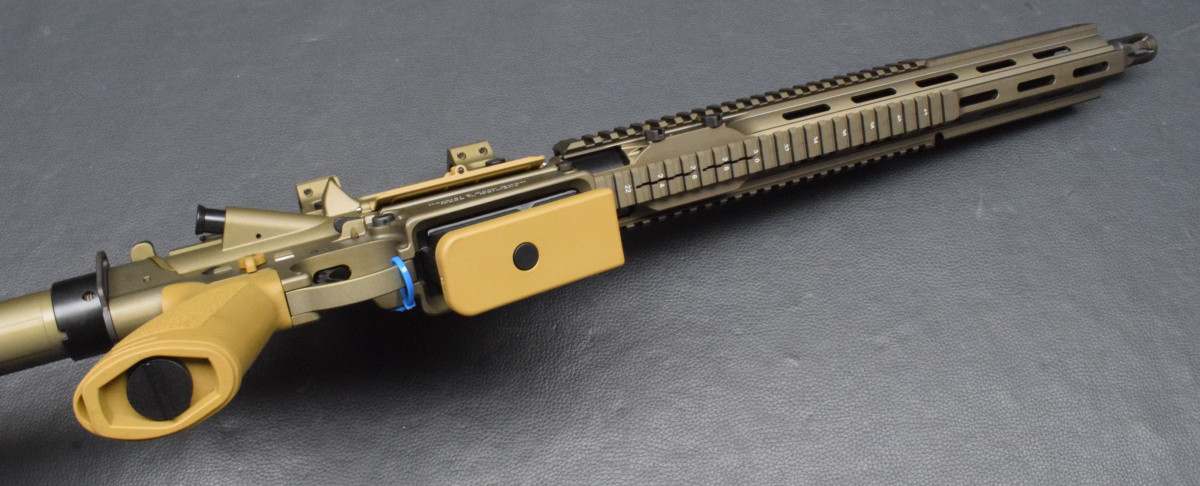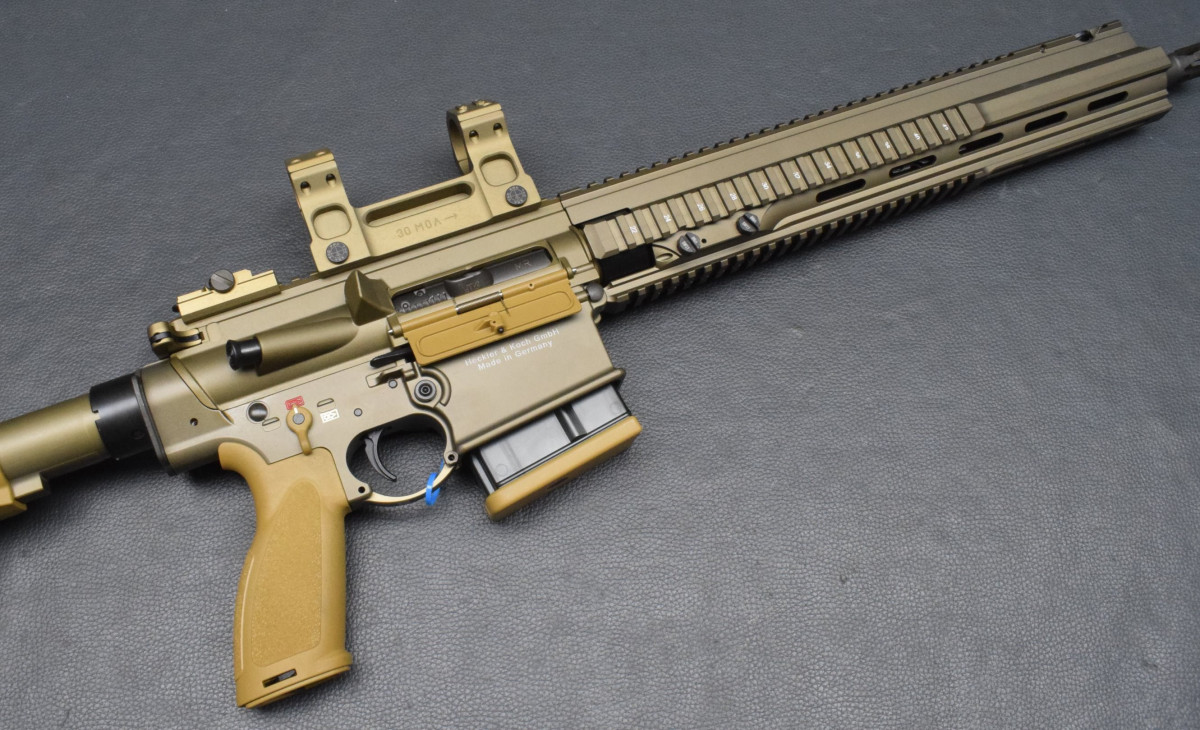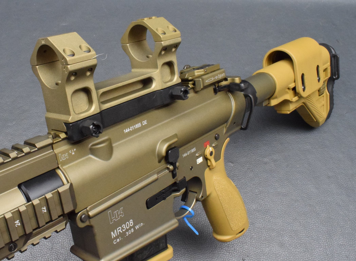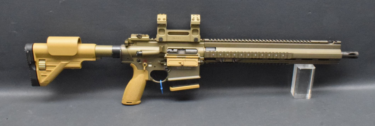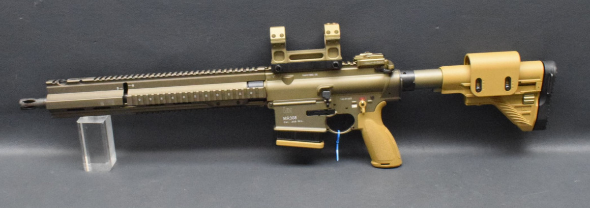 Heckler & Koch MR308 A3-28, Kaliber 308 WinchesterDie halbautomatische Büchse MR308 A3 als G28 DMR LOOK & FEEL von Heckler & Koch hat Entdecken Sie die Zukunft des Schiessens mit der führigen Semi-Auto Büchse von HK. Präzision trifft auf Innovation. Egal ob Sie Links- oder Rechtshänder sind, die beidseitigen Verschlussfanghebel und Magazinlösehebel Die wichtigsten Merkmale dieser sportlichen SL-Büchse auf einen Blick: Typ: Halbautomatische Büchse Kaliber: .308 Winchester G28 Aluminium Handschutz, lang STANAG-4694-Profil auf 12 Uhr + MIL-STD-1913 Picatinny auf 3, 6 und 9 Uhr Beidseitige Verschlussfanghebel Beidseitiger Magazinlösehebel Klappvisier, verstellbar (Korn im Handschutz integriert) Längenverstellbare G28 Schulterstütze mit verstellbarer Wangenauflage Farbe: RAL8000/Sand, Farbton den Handschutz kann abweichen, sieht bei unterschiedlichen Chargen von HK immer wieder mal ein bisschen anders aus. Hartverchromtes Rohr Inkl. Feuerdämpfer Lauflänge: 16,5" oder 20" Mündungsgewinde: M15x1 Mit Lauf sehr gut, Beschichtung 98%, |