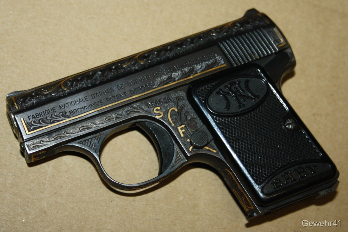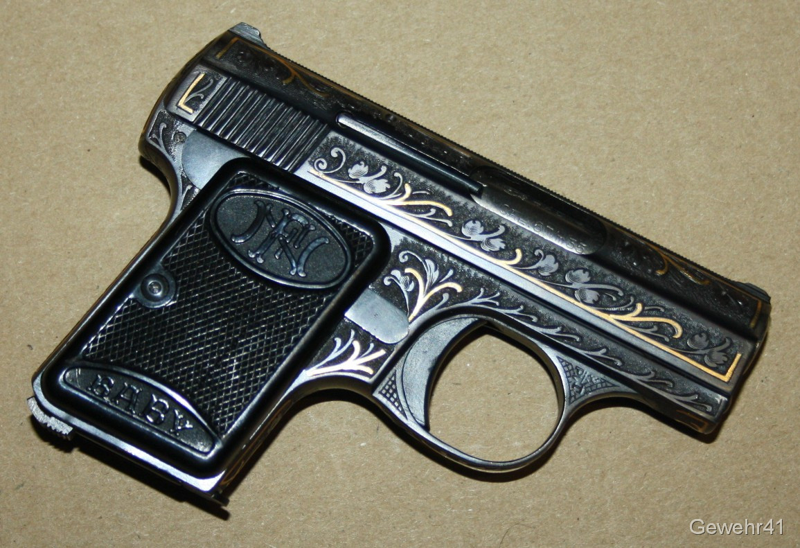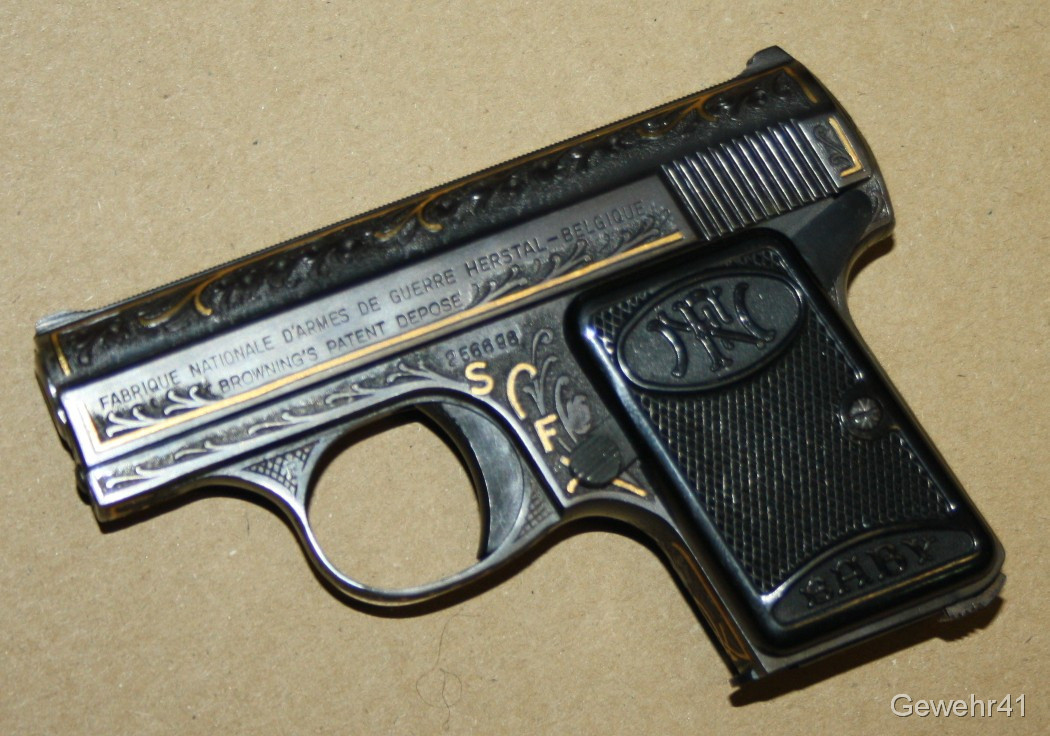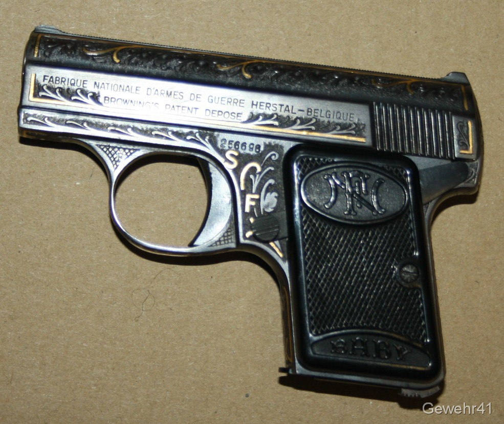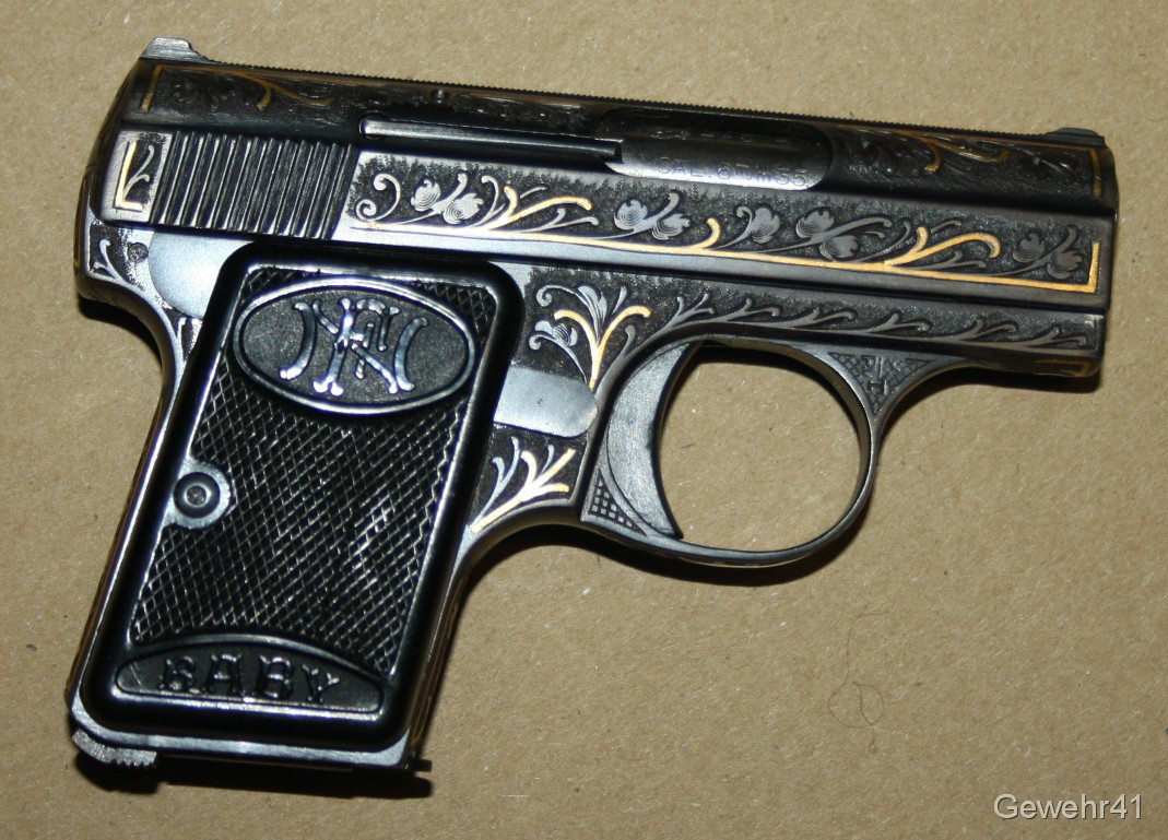 Sie bieten auf diese seltene voll graviert und mit Goldeinlagen verzierte FN Baby im Kal. 6,35mmBr. Die Pistole ist im absolut neuwertigen Zustand, Lauf und Funktion einwandfrei.