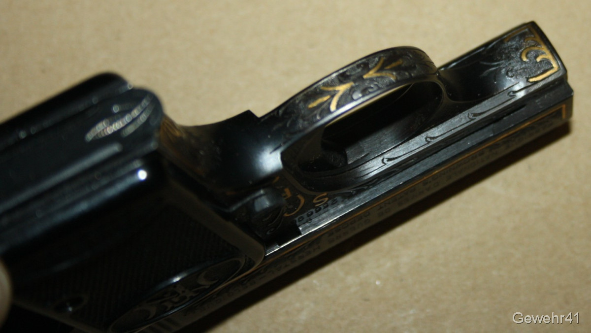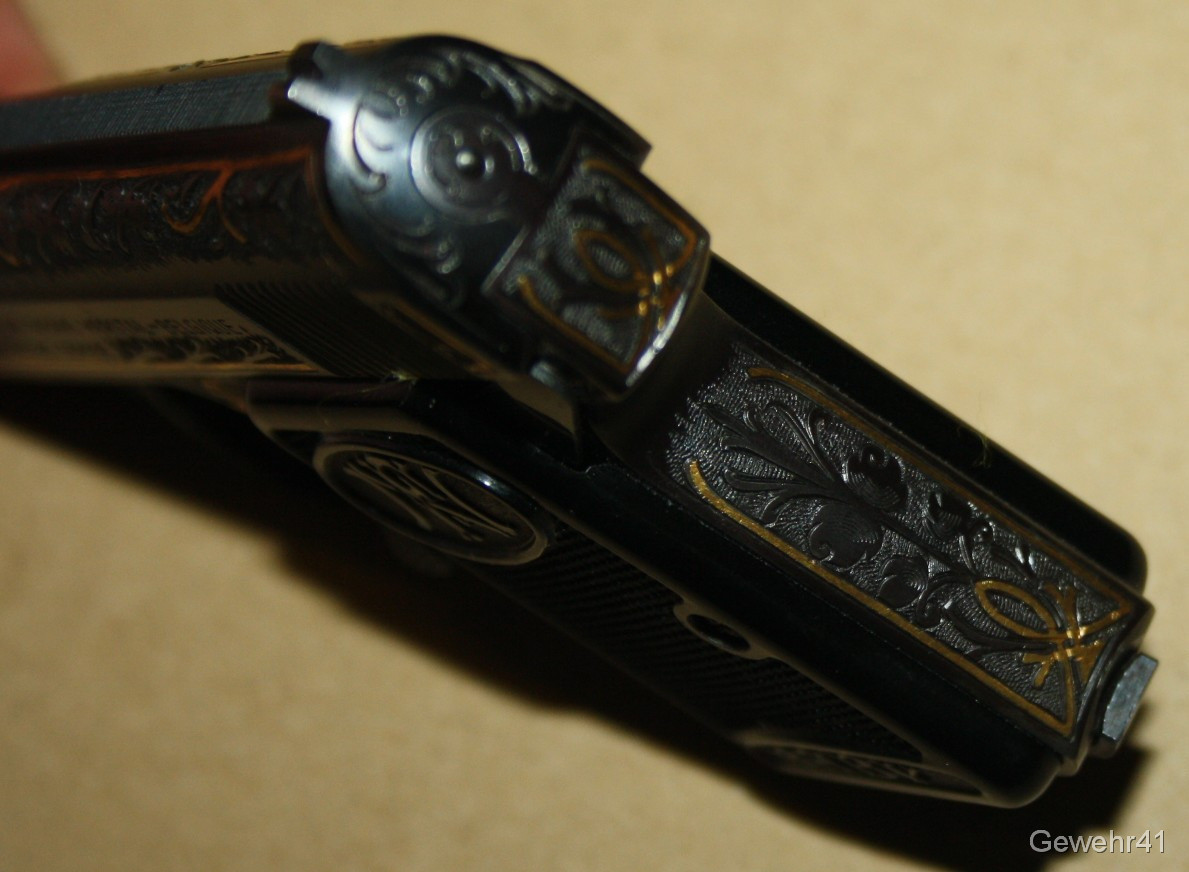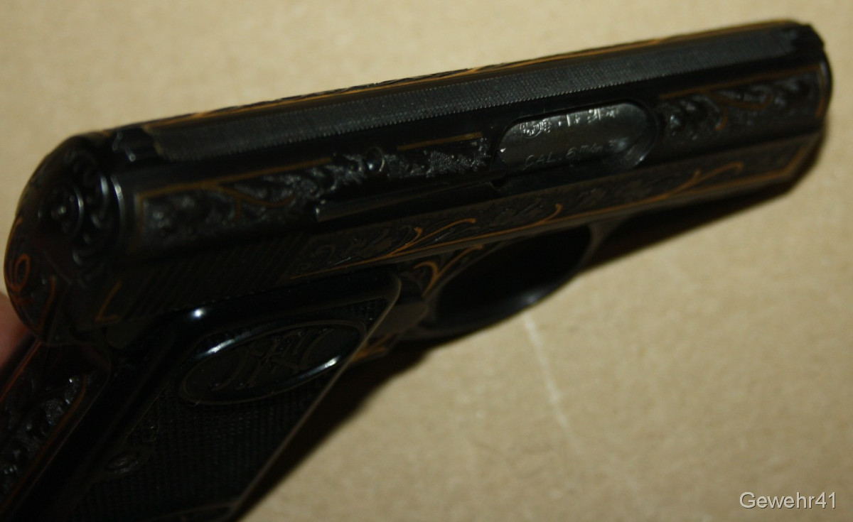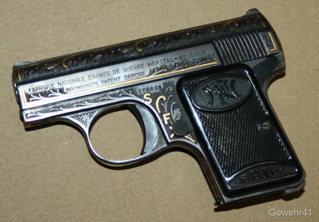 Sie bieten auf diese seltene voll graviert und mit Goldeinlagen verzierte FN Baby im Kal. 6,35mmBr. Die Pistole ist im absolut neuwertigen Zustand, Lauf und Funktion einwandfrei.