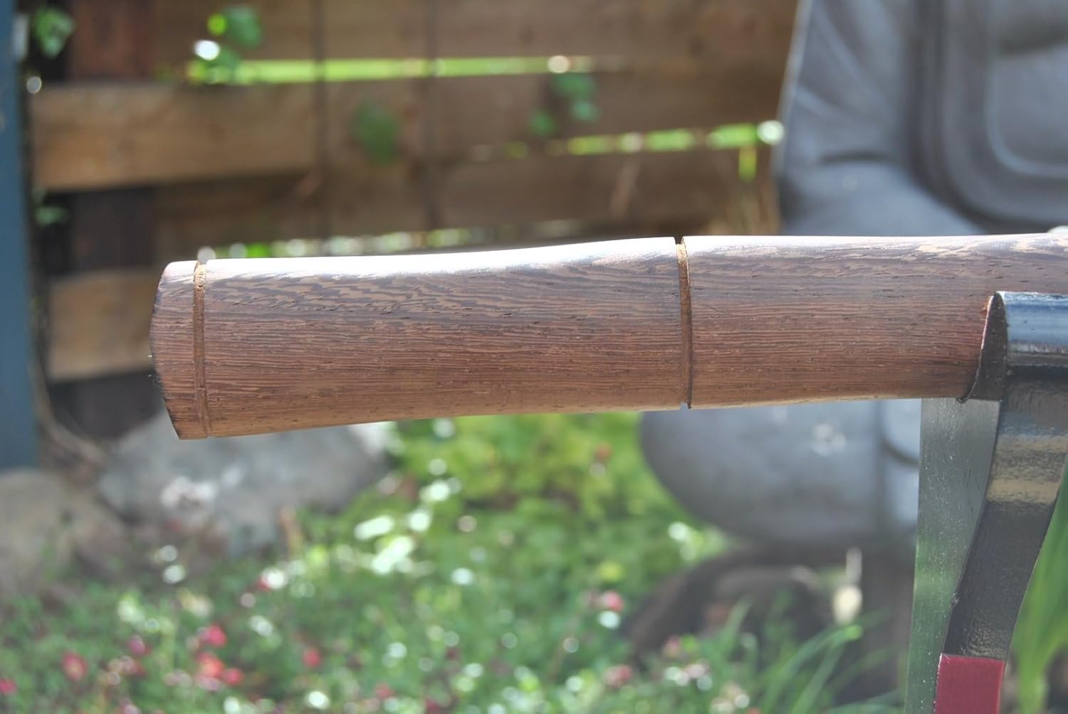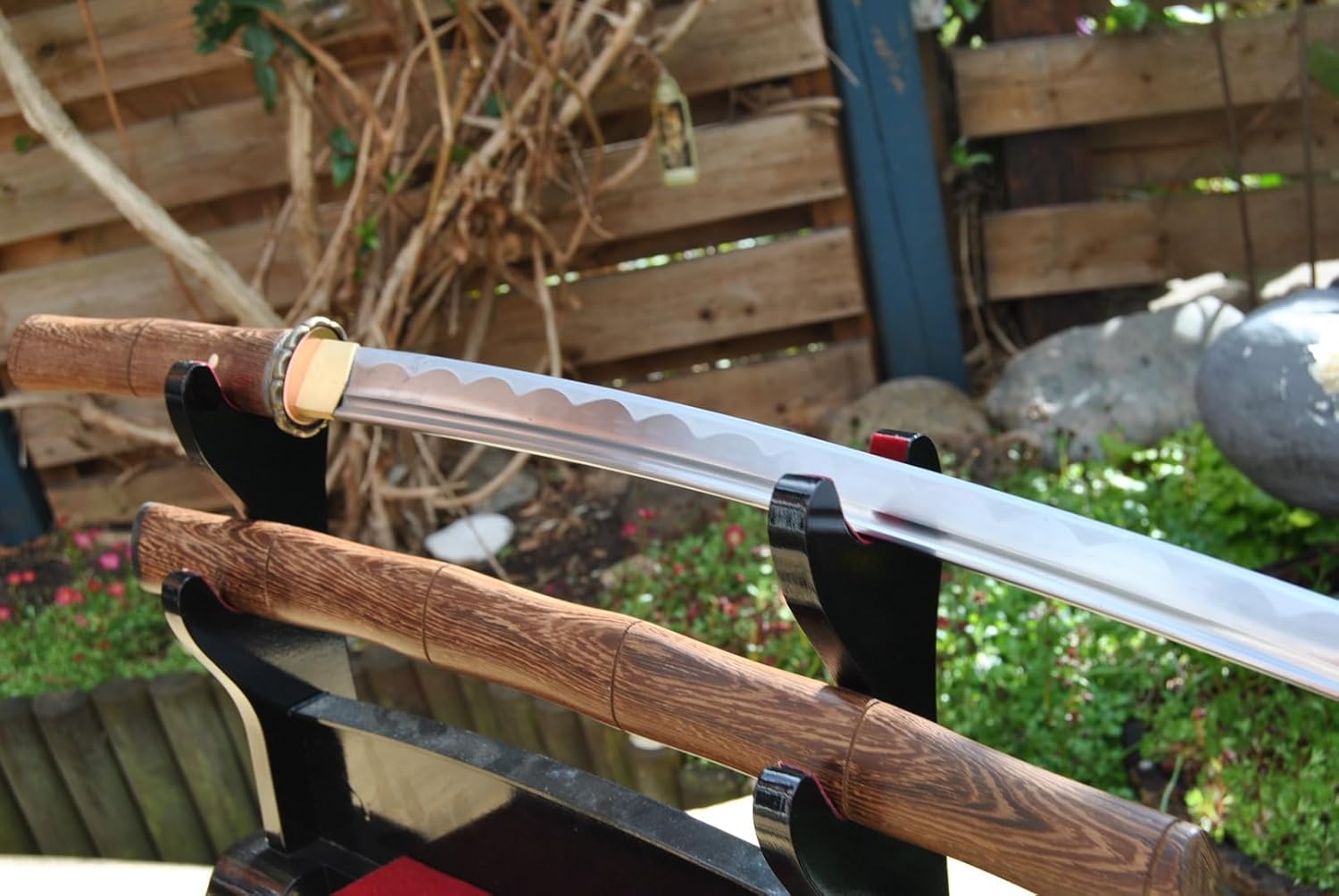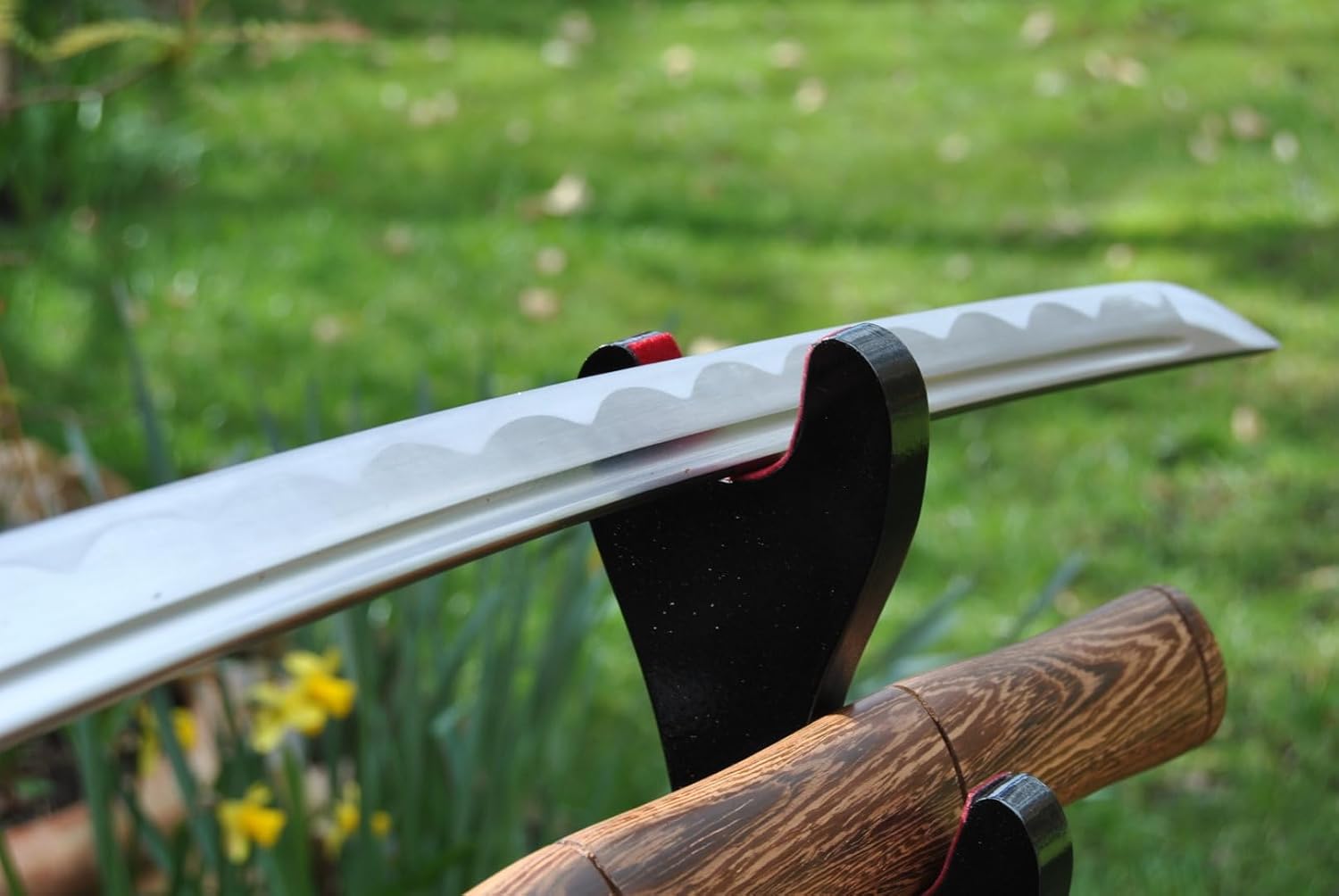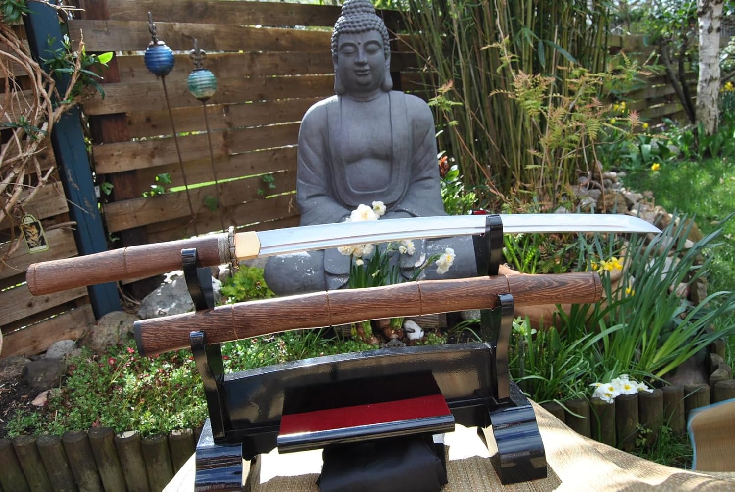 Wunderschönes handgeschmiedetes Wakizashi Schwert. Die Klinge im Shinogi-Zukuri-Stil besitzt eine Hohlkehle (Bo-Hi) und ist aus handgeschmiedetem 1045 Kohlenstoffstahl. Sie ist scharf geschliffen und hat eine eingearbeitete Hamon-Linie für eine besonders authentische Optik. Die Scheide des Schwertes ist aus Wenge-Holz gefertigt. Die lange Angel ist mit 1 Bambusstiften (Mekugi) im Griff fixiert. Das Schwert ist somit voll zerlegbar. Die Klingenzwinge (Habaki) und Unterlegscheiben (Seppa) sind aus Messing. Die Lieferung erfolgt mit Schutzhülle. Grifflänge 23 cm Klingenlänge 52cm Gesamtlänge (ohne Scheide) 1060 cm Gewicht (ohne Scheide) 800gr . Ohne Ständer
