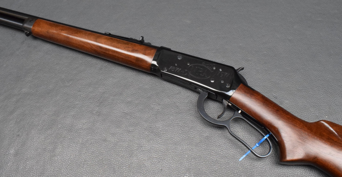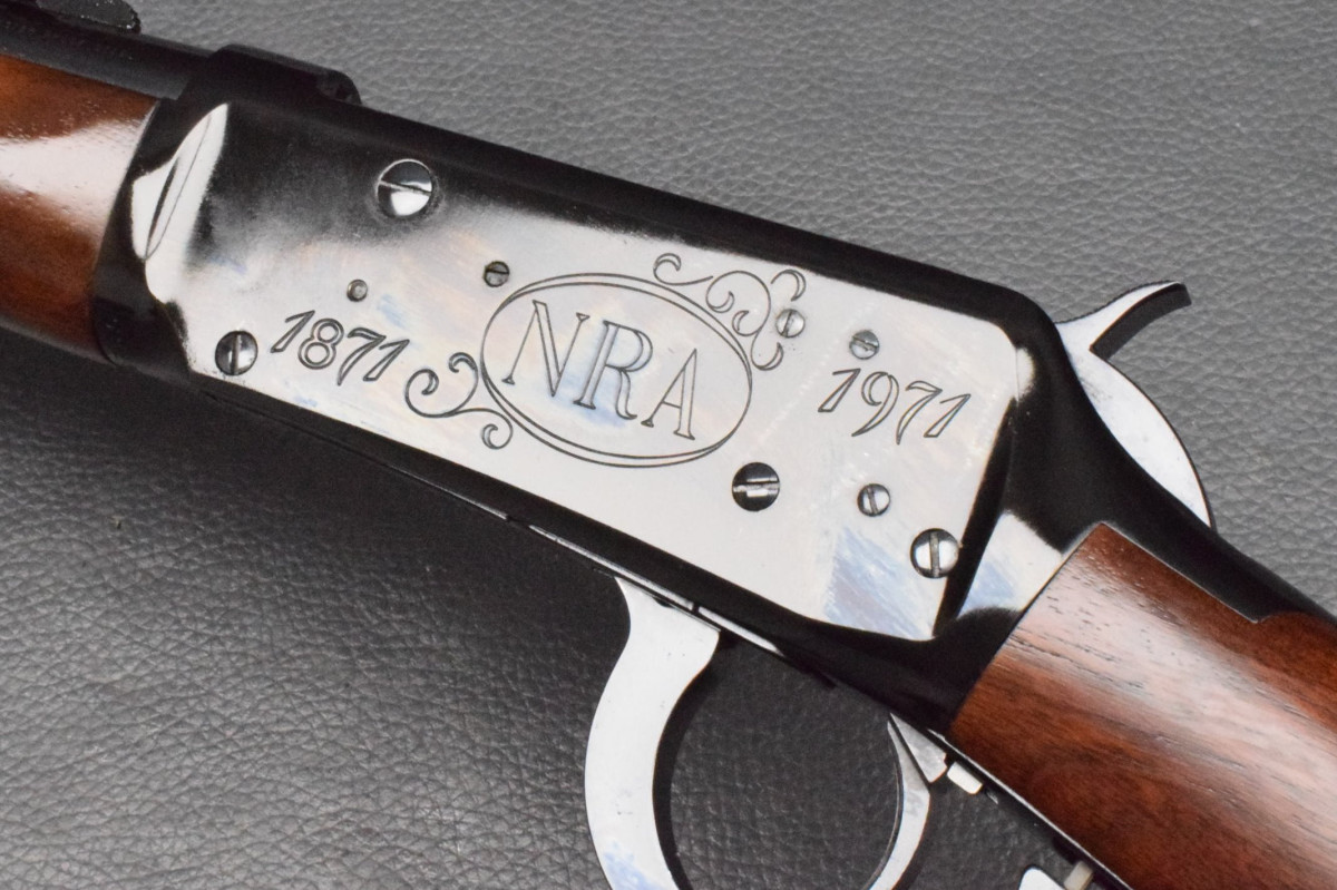 die linke Systemkastenseite mit der Beschriftung: '1871 NRA 1971', Modellbezeichnung im Lauf