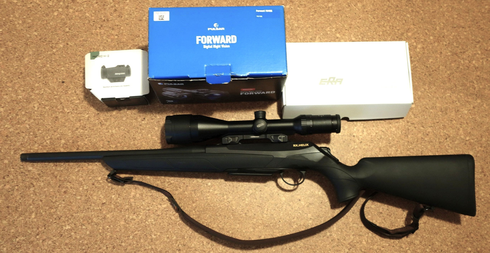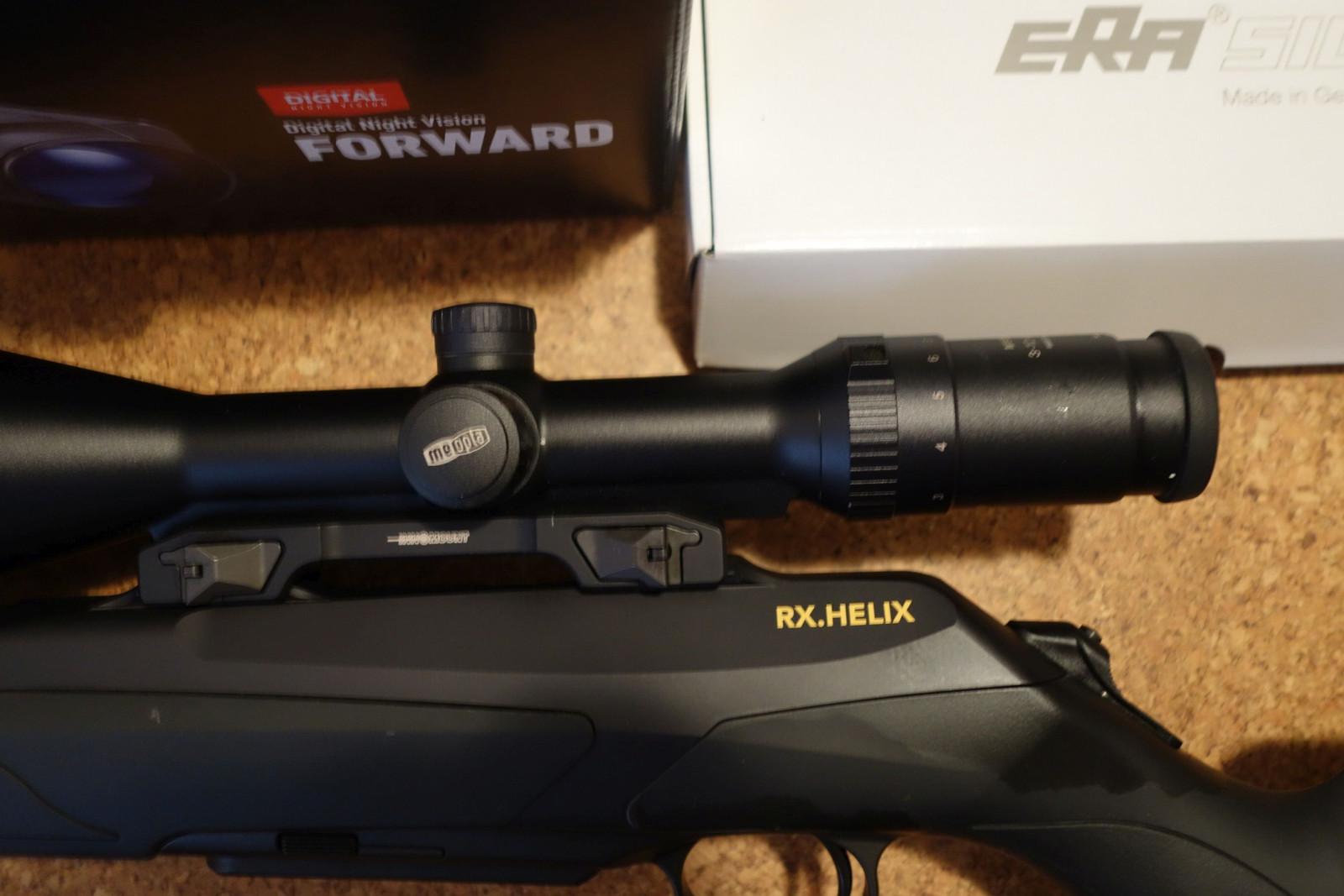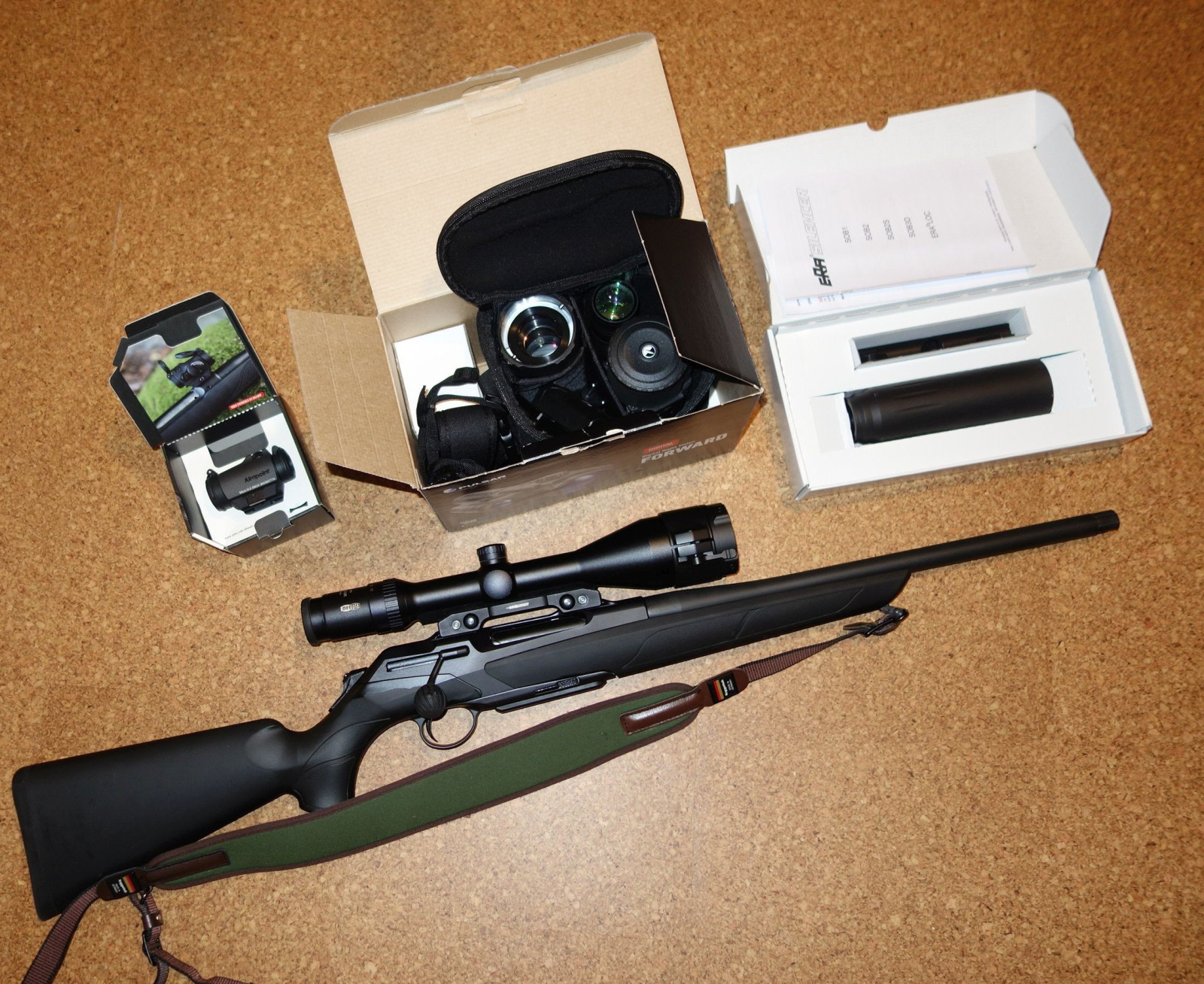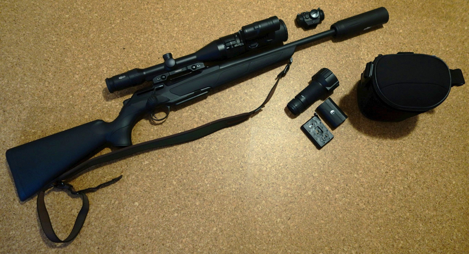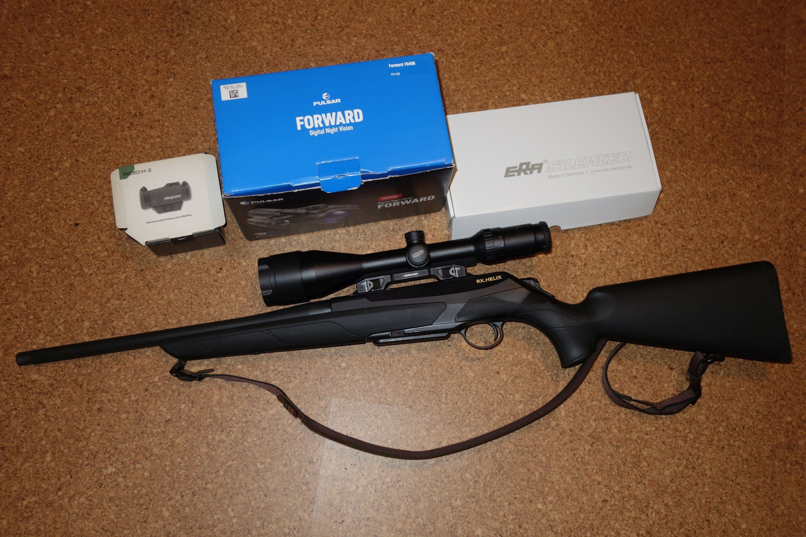 Geradezugrepetierer Merkel RX Helix im Kaliber .308 zusammen mit Zielfernrohr, Montage, Schalldämpfer, Nachtsichtvorsatz inkl. Adapter und Leuchtpunktvisier.