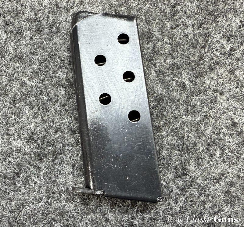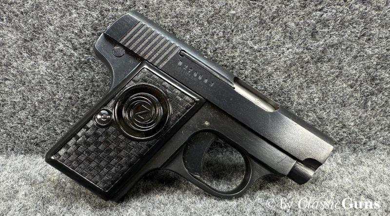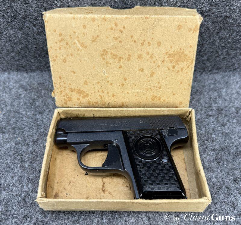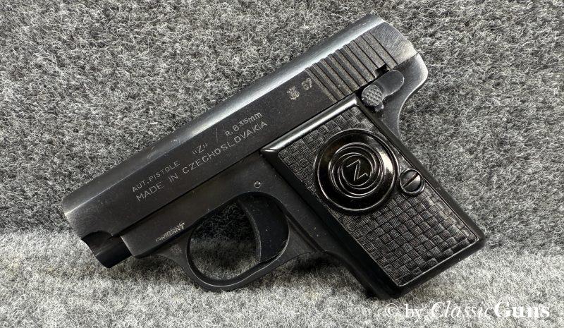 CZ Uhersky Brod Mod. Z6,35 mm BrowningNahezu neuwertig erhaltene, bewährte 6,35er Taschenpistole aus der Zeit des Kalten Krieges, in unserer Büchsenmacherwerkstatt fachmännisch gereinigt und verantwortungsbewusst geprüft. Lauf mit neuwertigem Zug-/ Feldprofil, erstklassig erhaltene Brünierung, unbeschädigte Kunststoffgriffschalen und ein neuwertiges Magazin für sechs Patronen. Die Lieferung erfolgt in der originalen Pappschachtel, ohne weiteres Zubehör. Tschechischer CIP-Beschuss 1967, S/N B275593. |