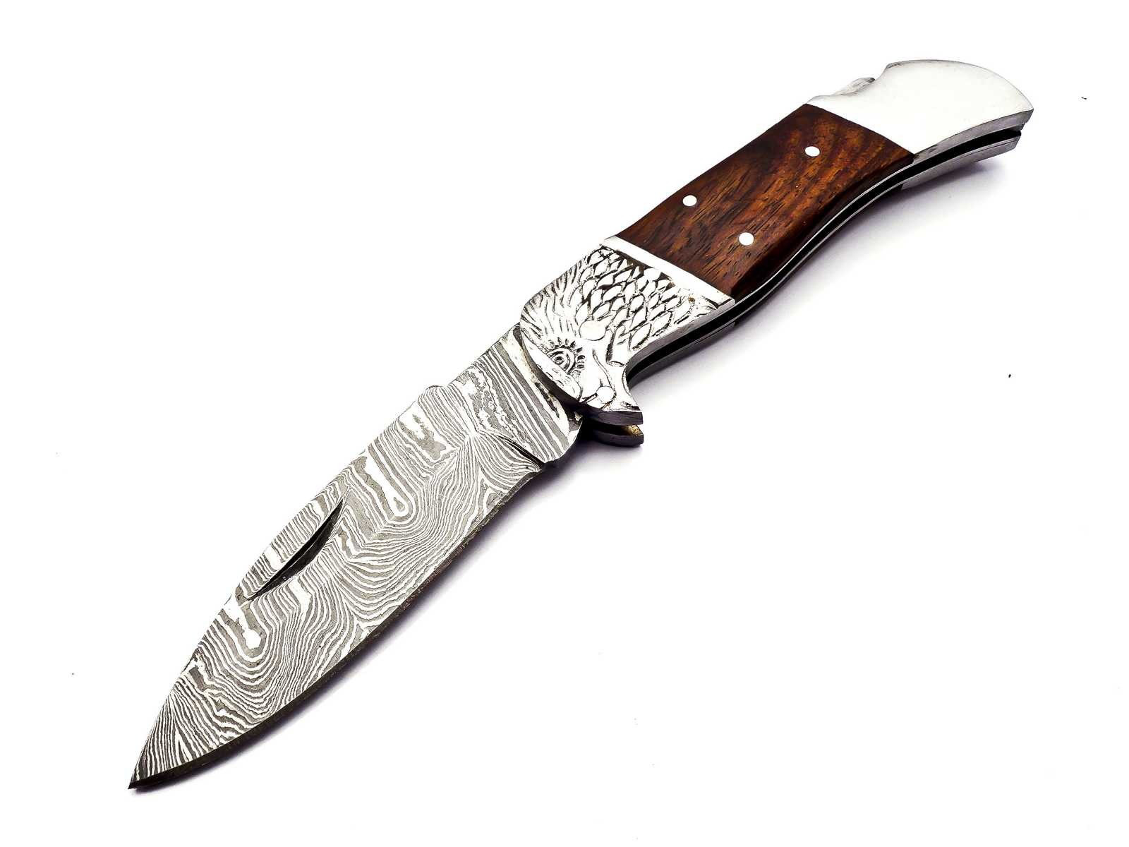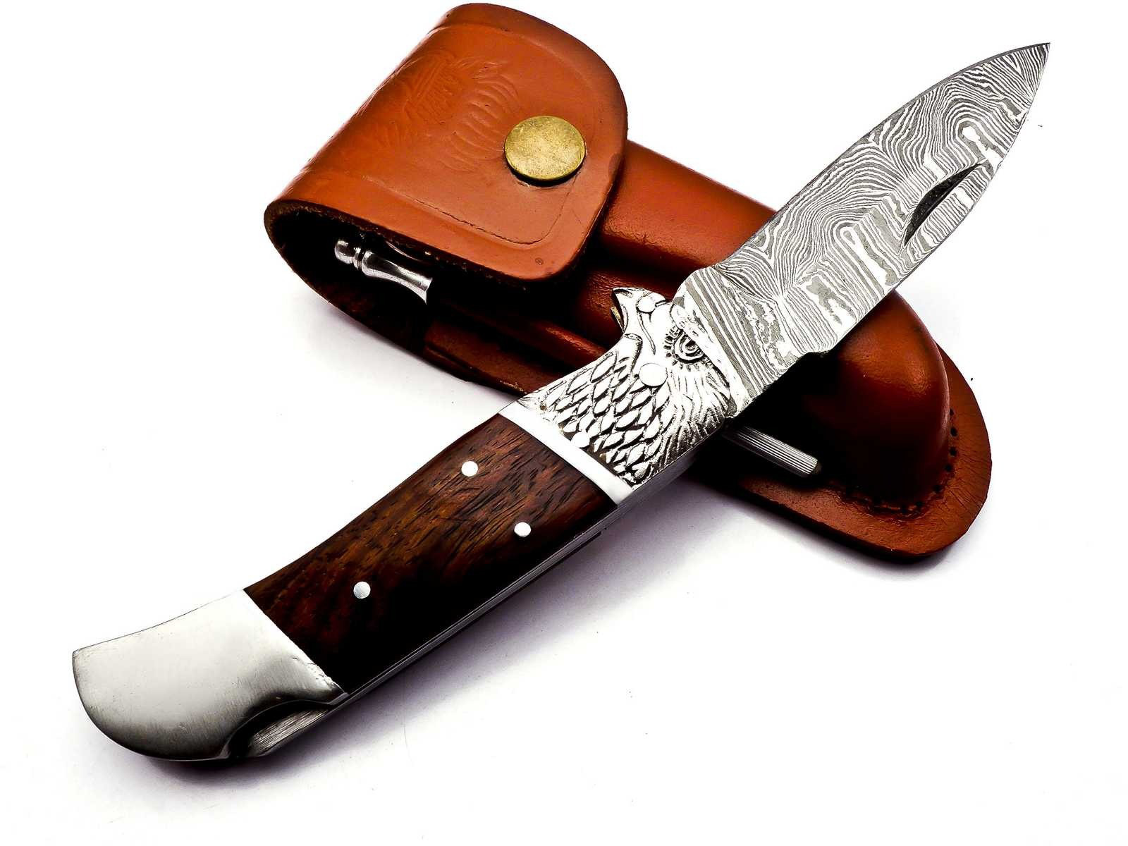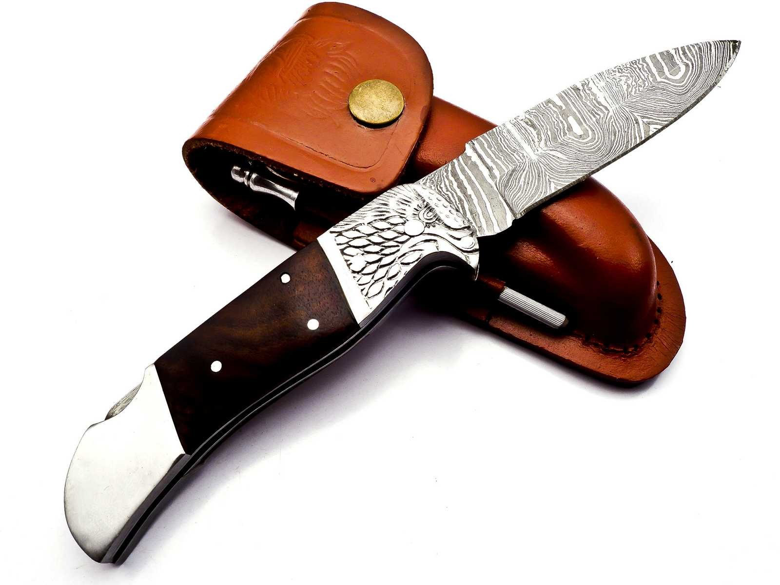 Hier erhalten Sie ansprechendes Hand geschmiedetes Damast Taschenmesser in reizvollem Damast Torsion Muster. Die ebenfalls Hand gefertigte Leder Scheide besteht aus hochwertigem Rind Leder.