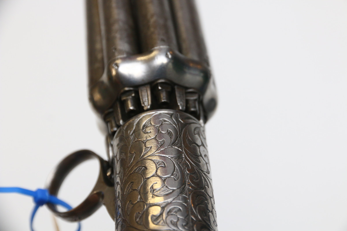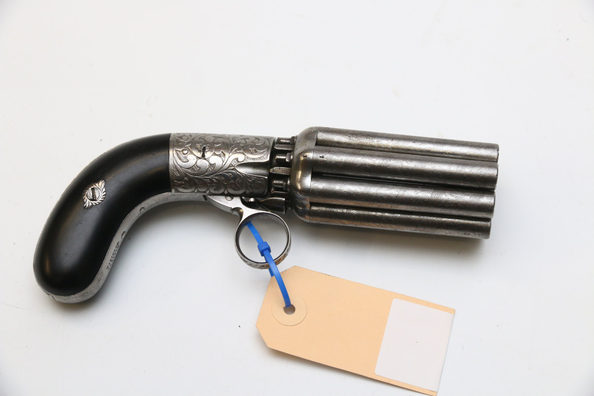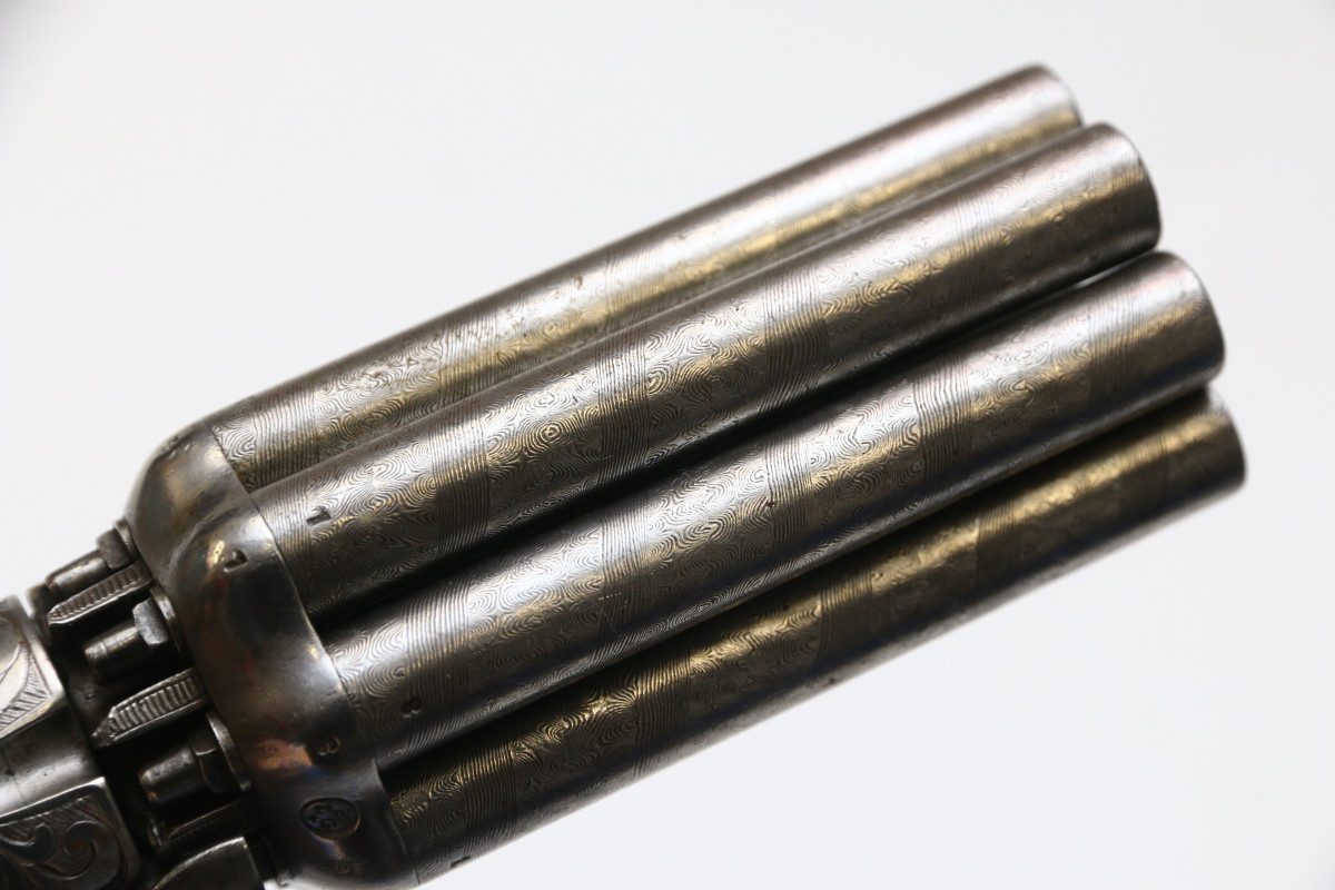 Bündelrevolver Mariette Brevete ca 1820 Pepperbox mit 8 Läufen aus Damaststahl, genaues Kaliber unbekannt Perkussionszündung, Double Action, belgischer Beschuss Läufe aus Damastastahl altersgemäß guter Zustand, Mechanik funktionstüchtig ca. 78 mm langer Lauf, Gesamtlänge ca. 195mm
