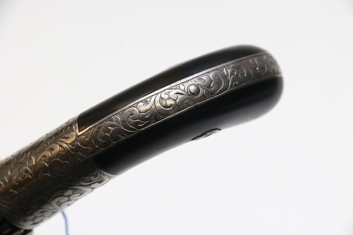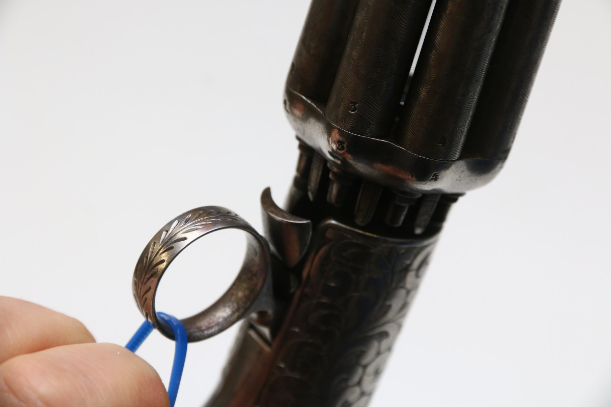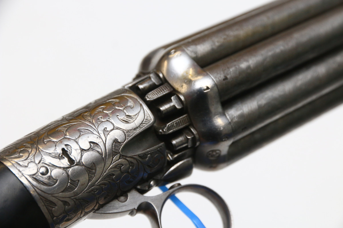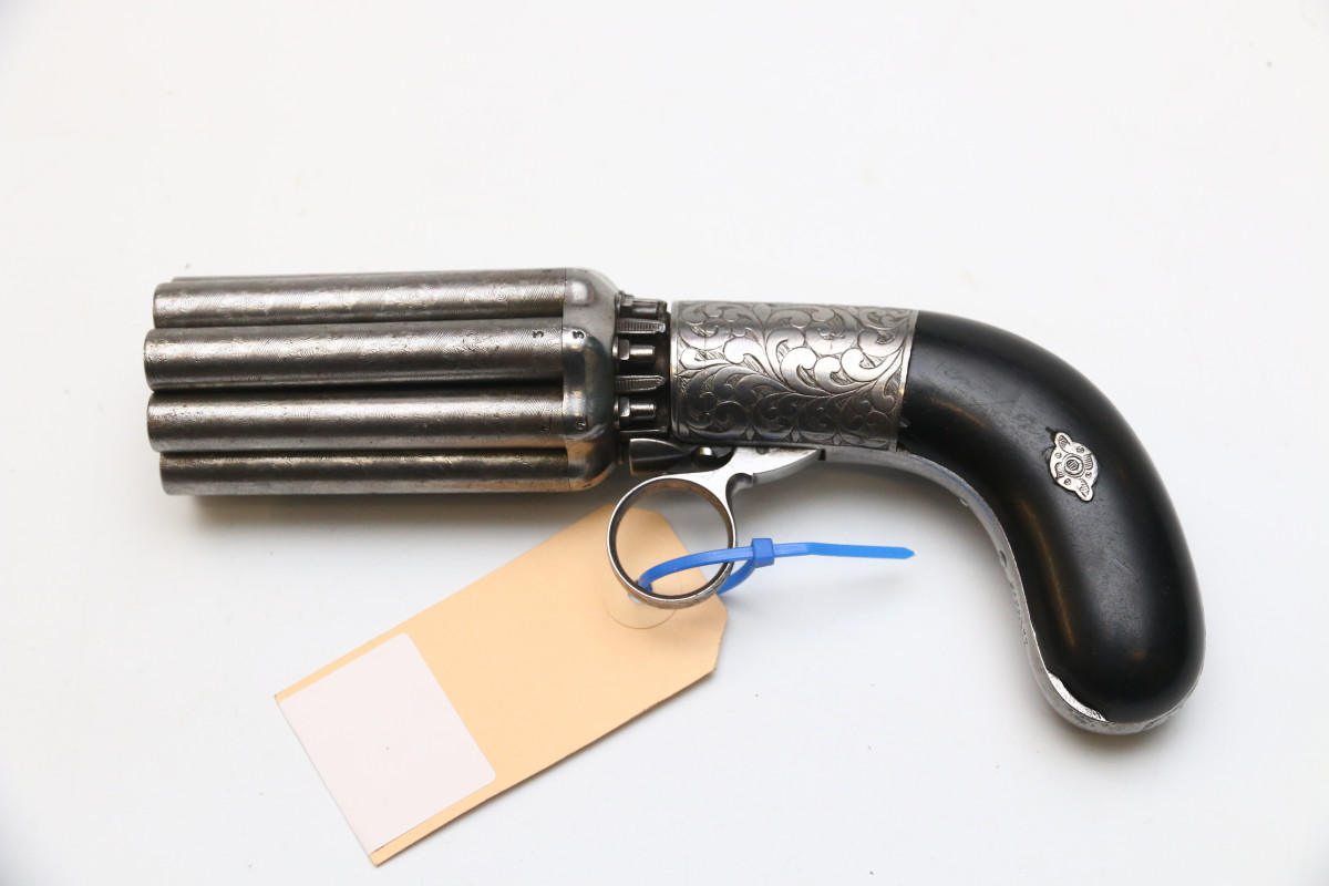 Bündelrevolver Mariette Brevete ca 1820 Pepperbox mit 8 Läufen aus Damaststahl, genaues Kaliber unbekannt Perkussionszündung, Double Action, belgischer Beschuss Läufe aus Damastastahl altersgemäß guter Zustand, Mechanik funktionstüchtig ca. 78 mm langer Lauf, Gesamtlänge ca. 195mm