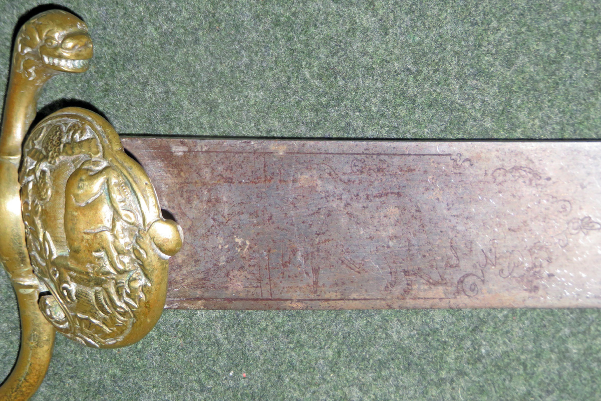 Auf der breiten Klinge ist beidseitig eine jagdliche Ätzung zu erkennen, wobei eine Seite stark abgenutzt ist.