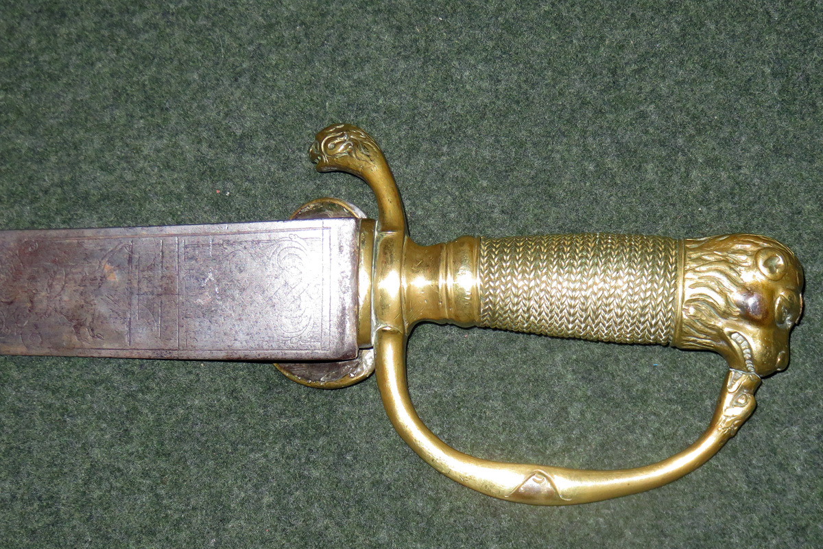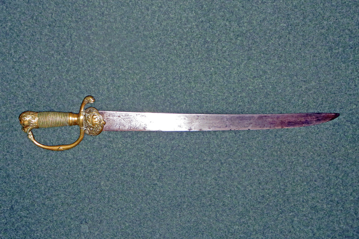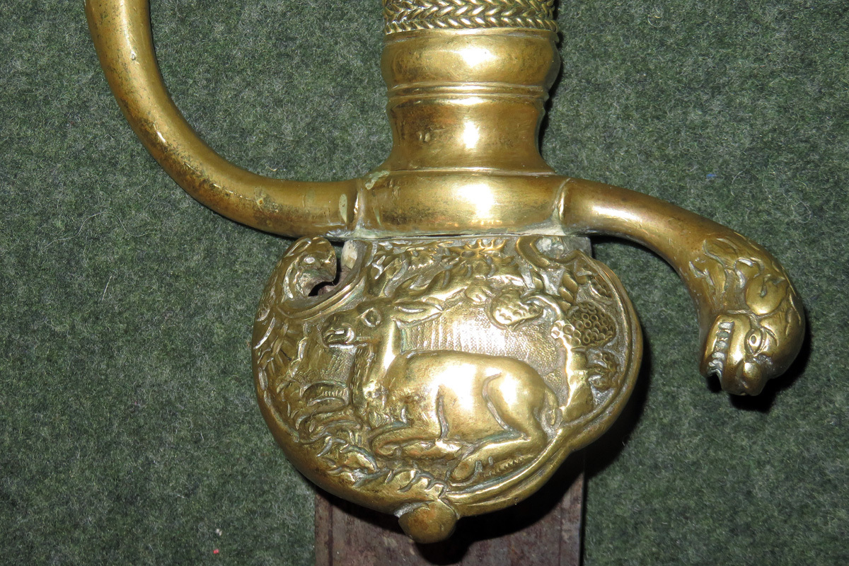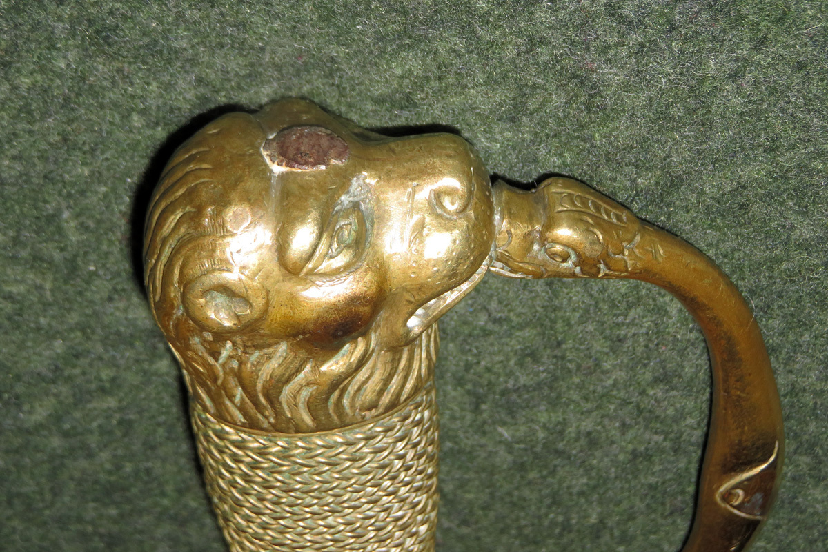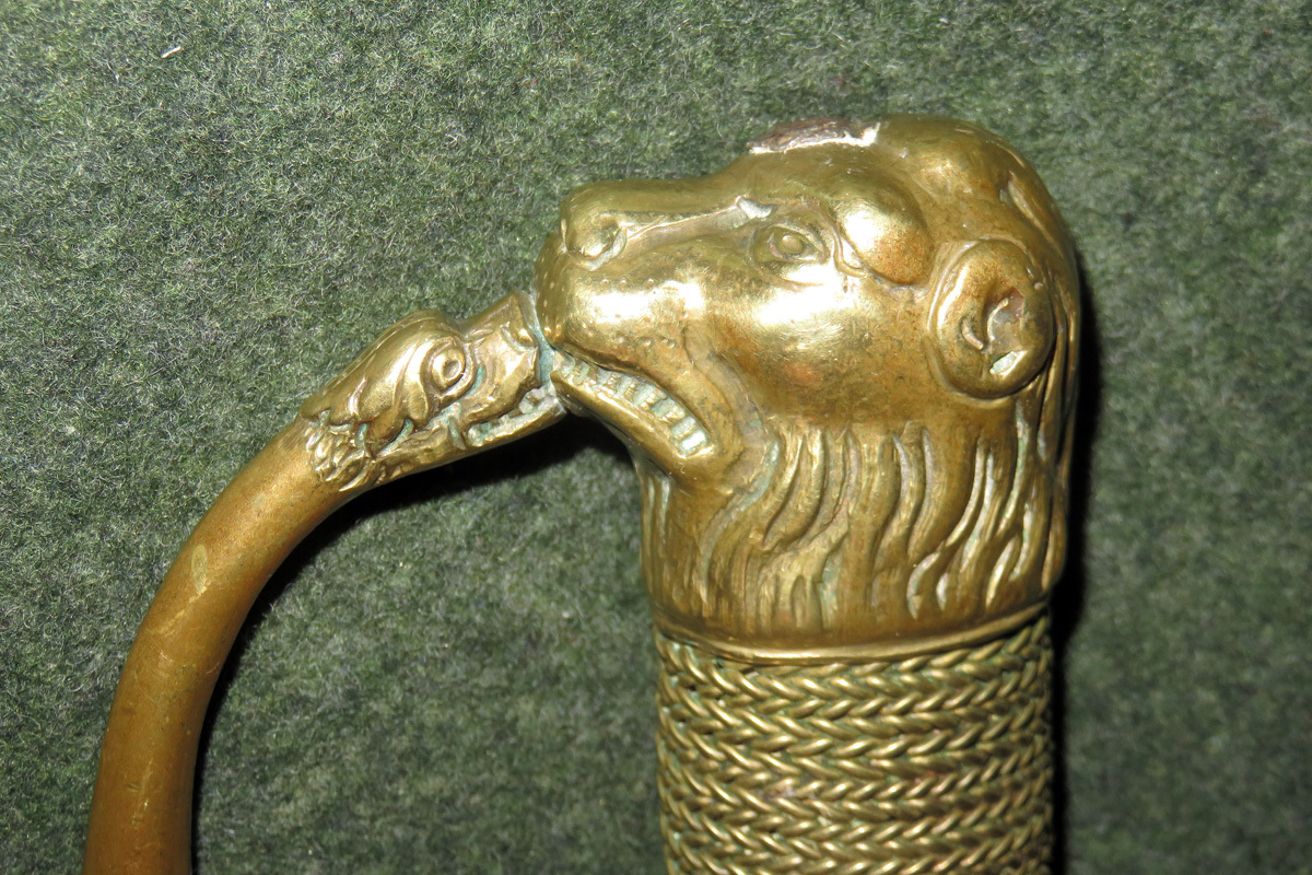 Bei dieser schweren Jagdplaute ist der Griff in Messing gegossen, hat einen mit Messingdraht umwickelten Griff und als Abschluss einen Tierkopf.