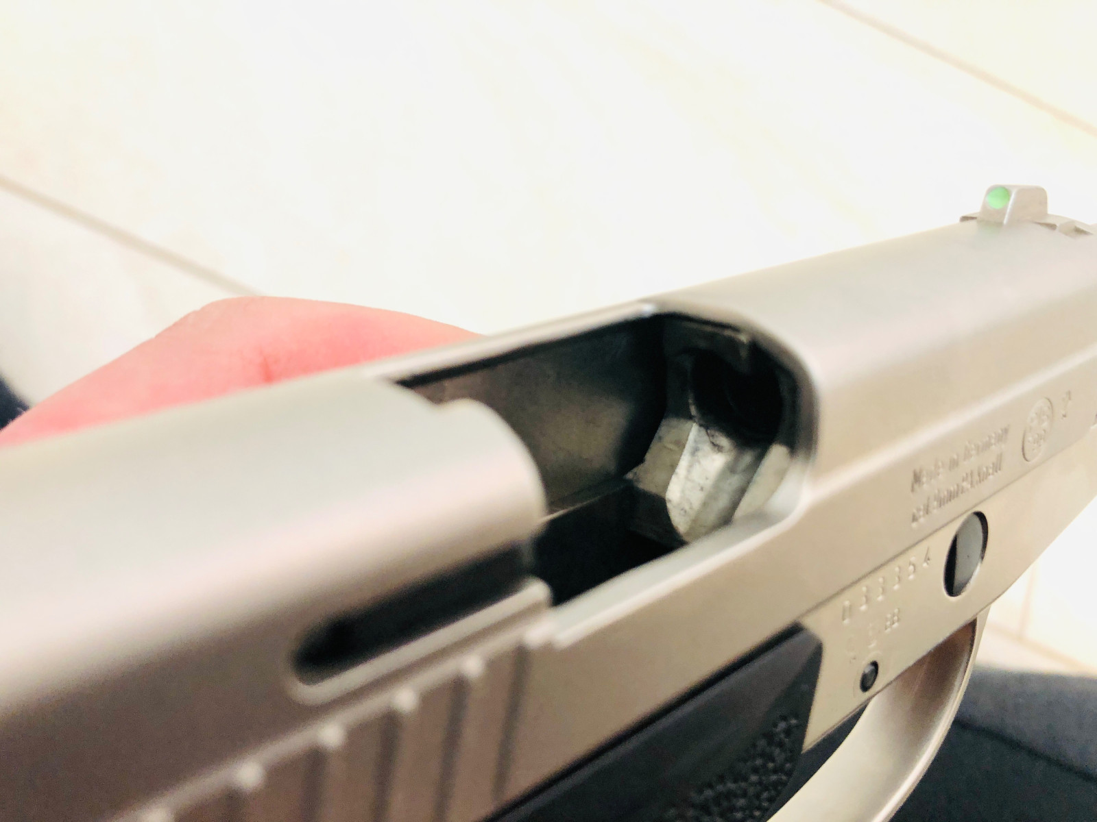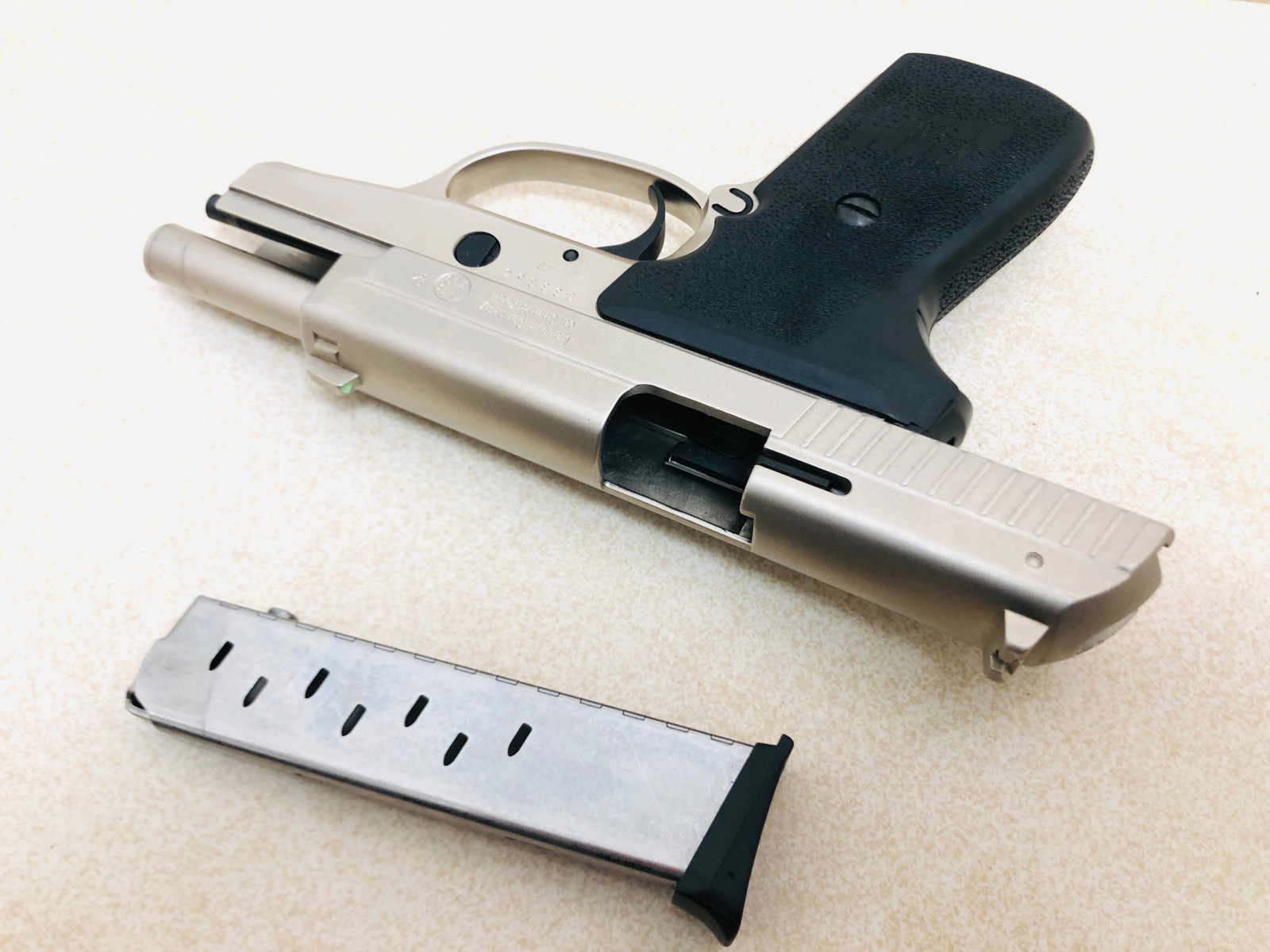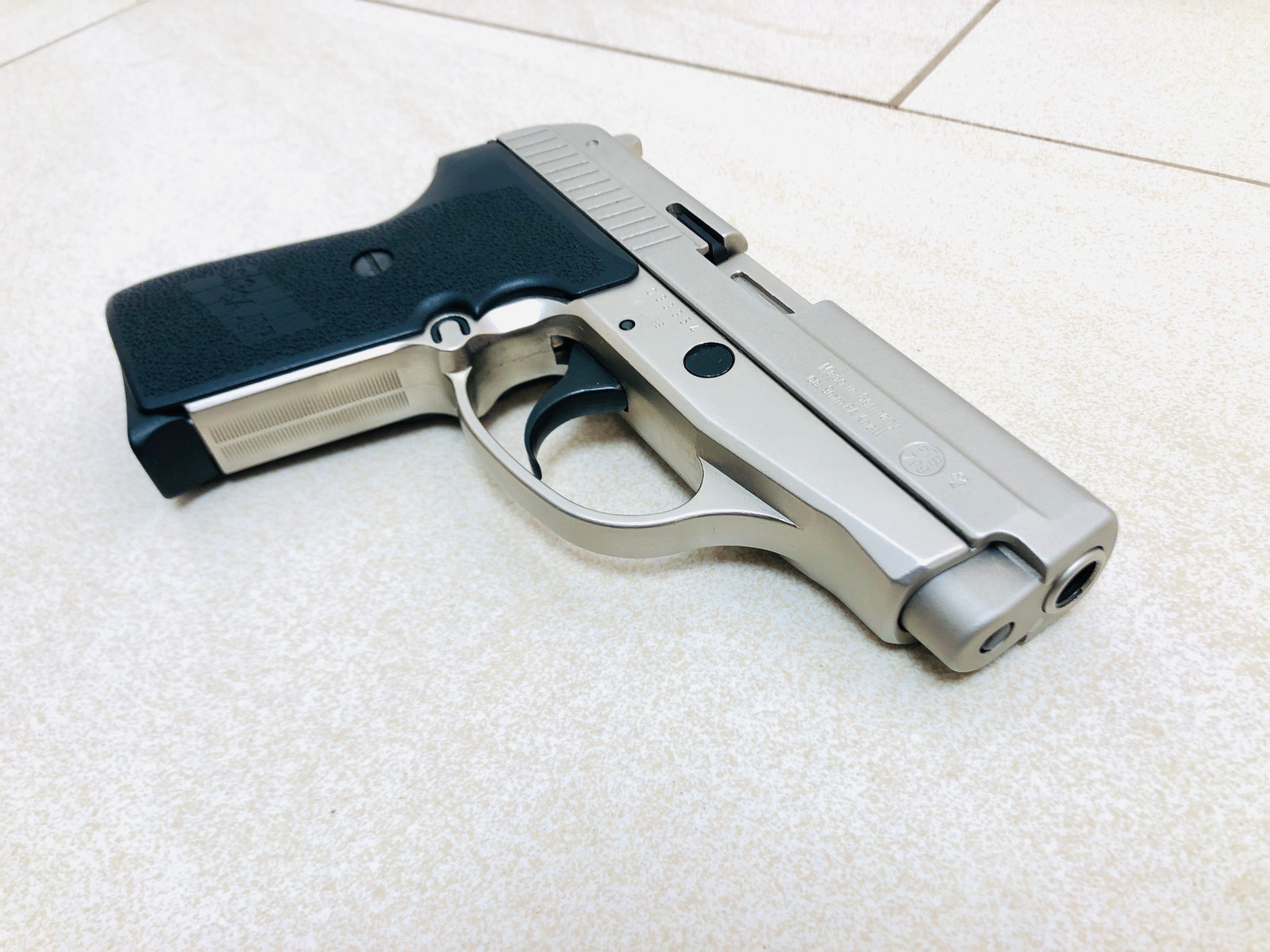 Die Waffe lag bei mir ausschließlich in der Vitrine. Sie kommt mit originalen Griffschalen und in der gewohnt hochwertigen Qualität älterer Schreckschusswaffen.