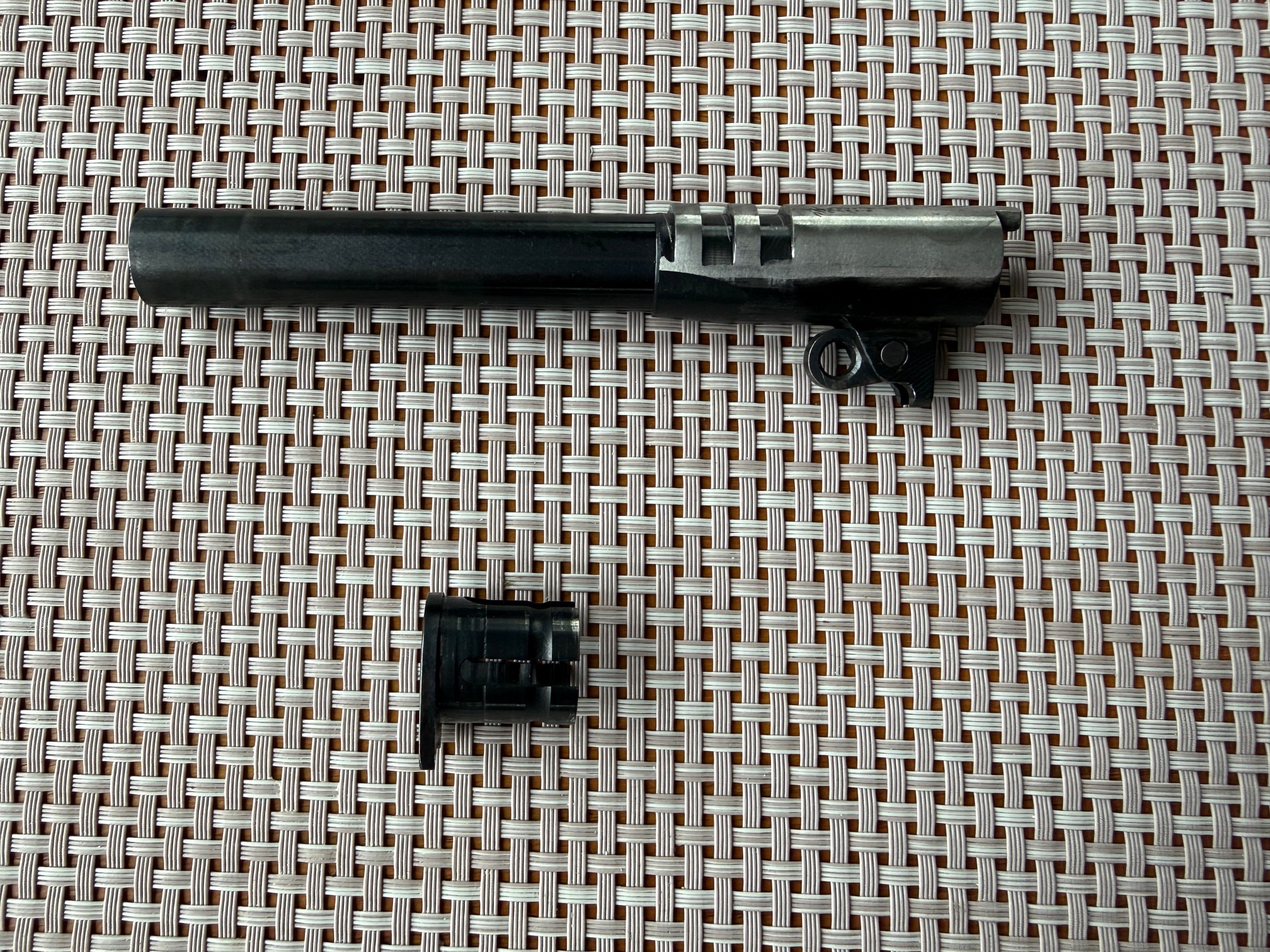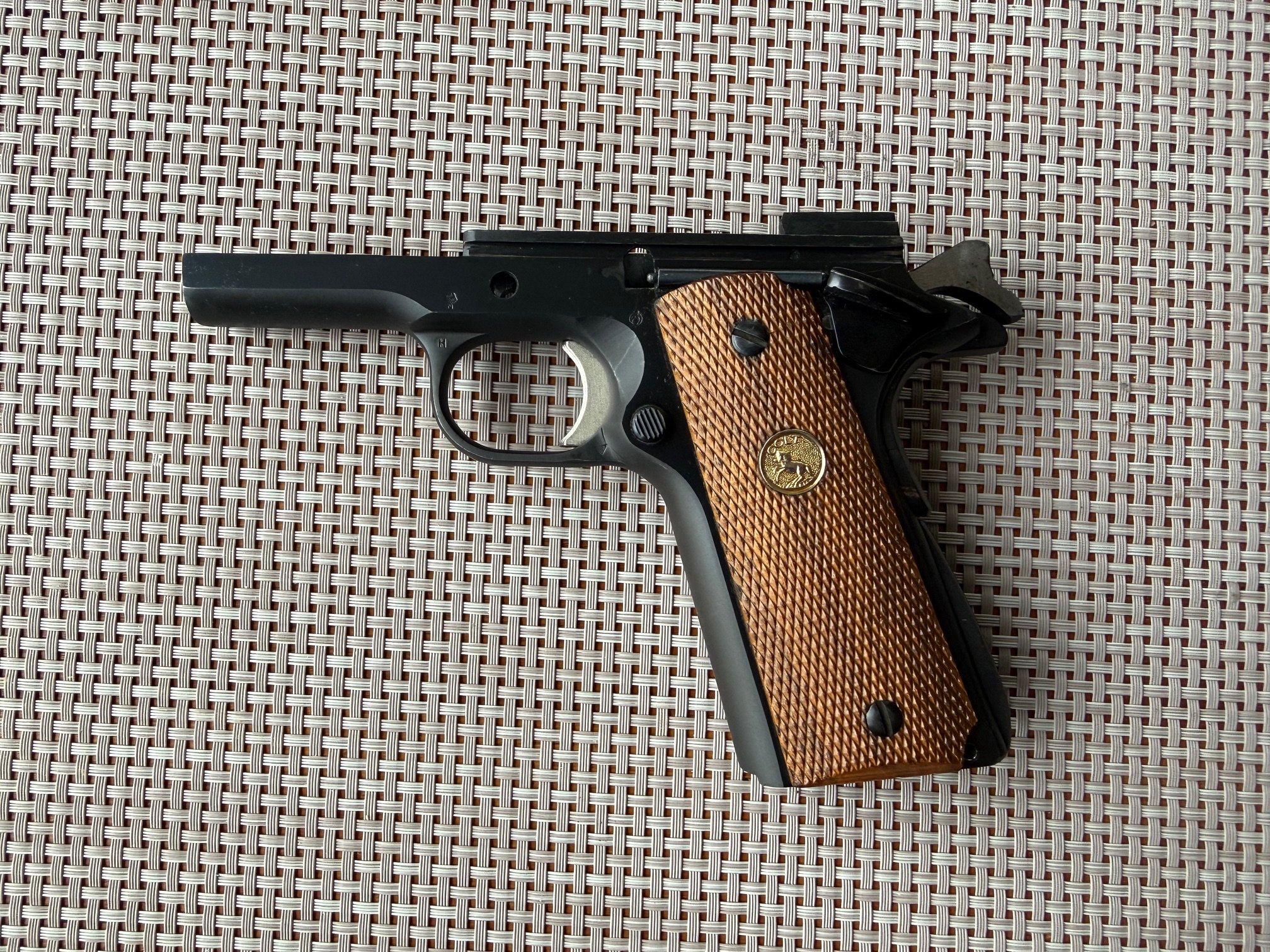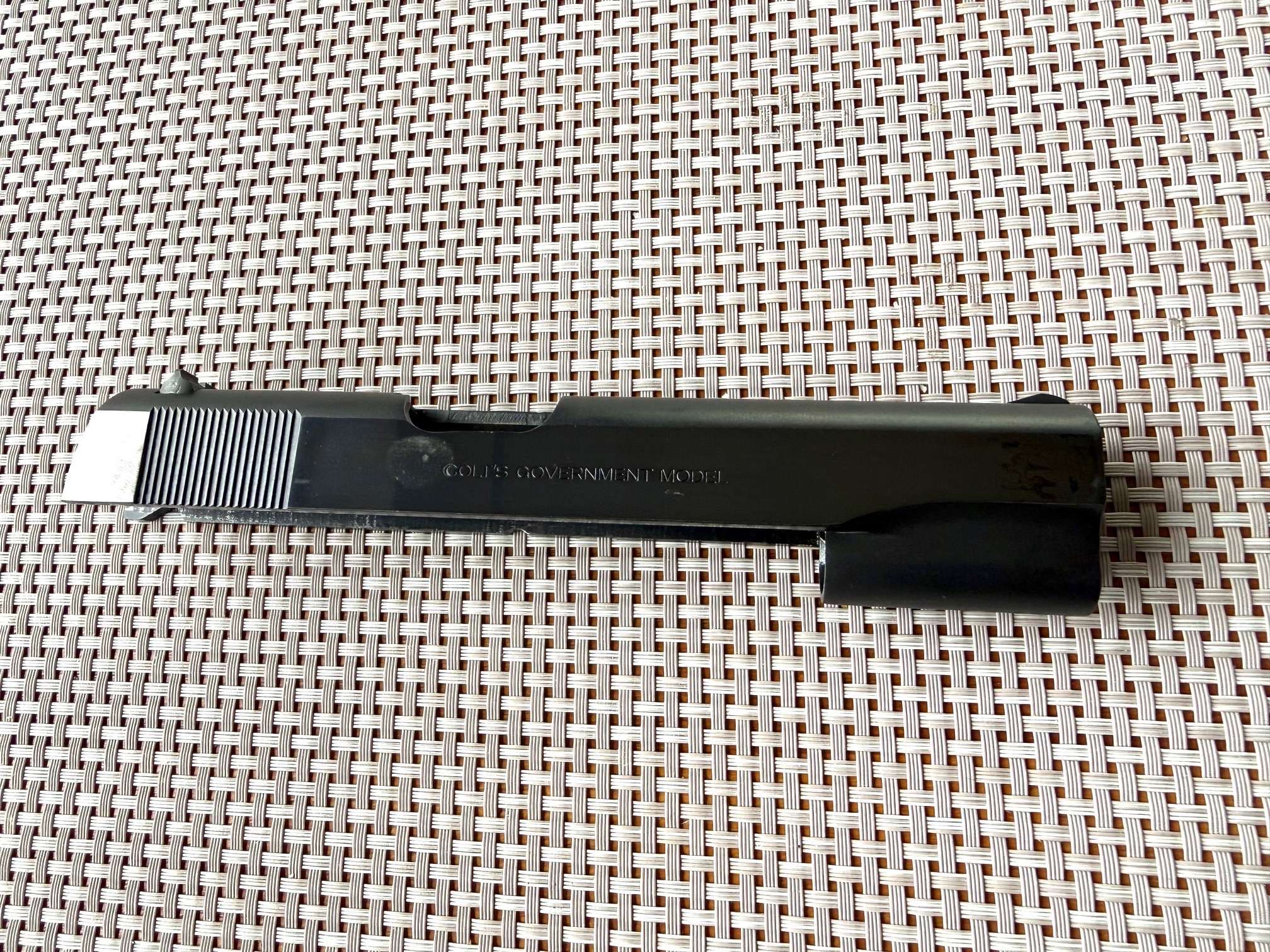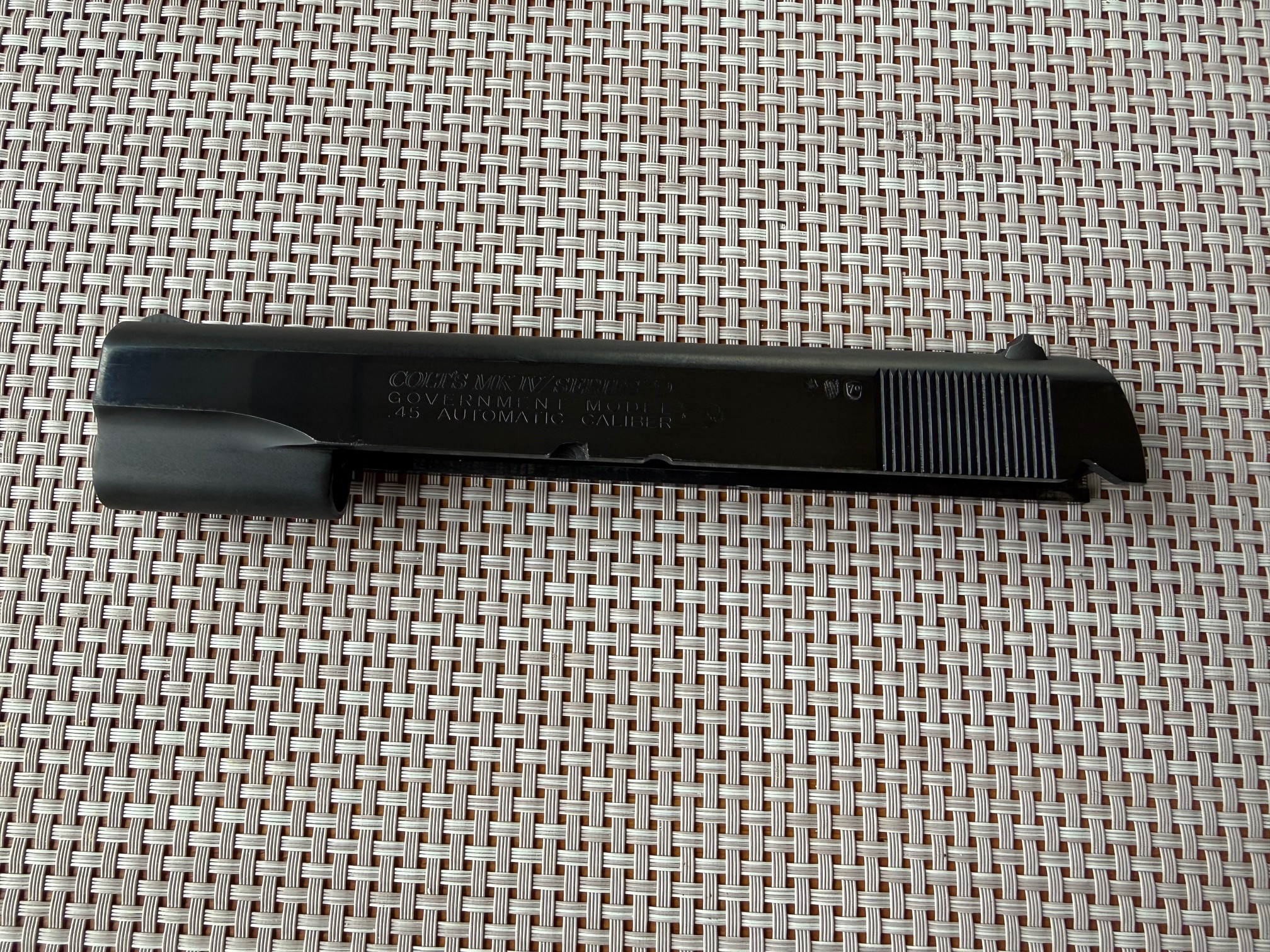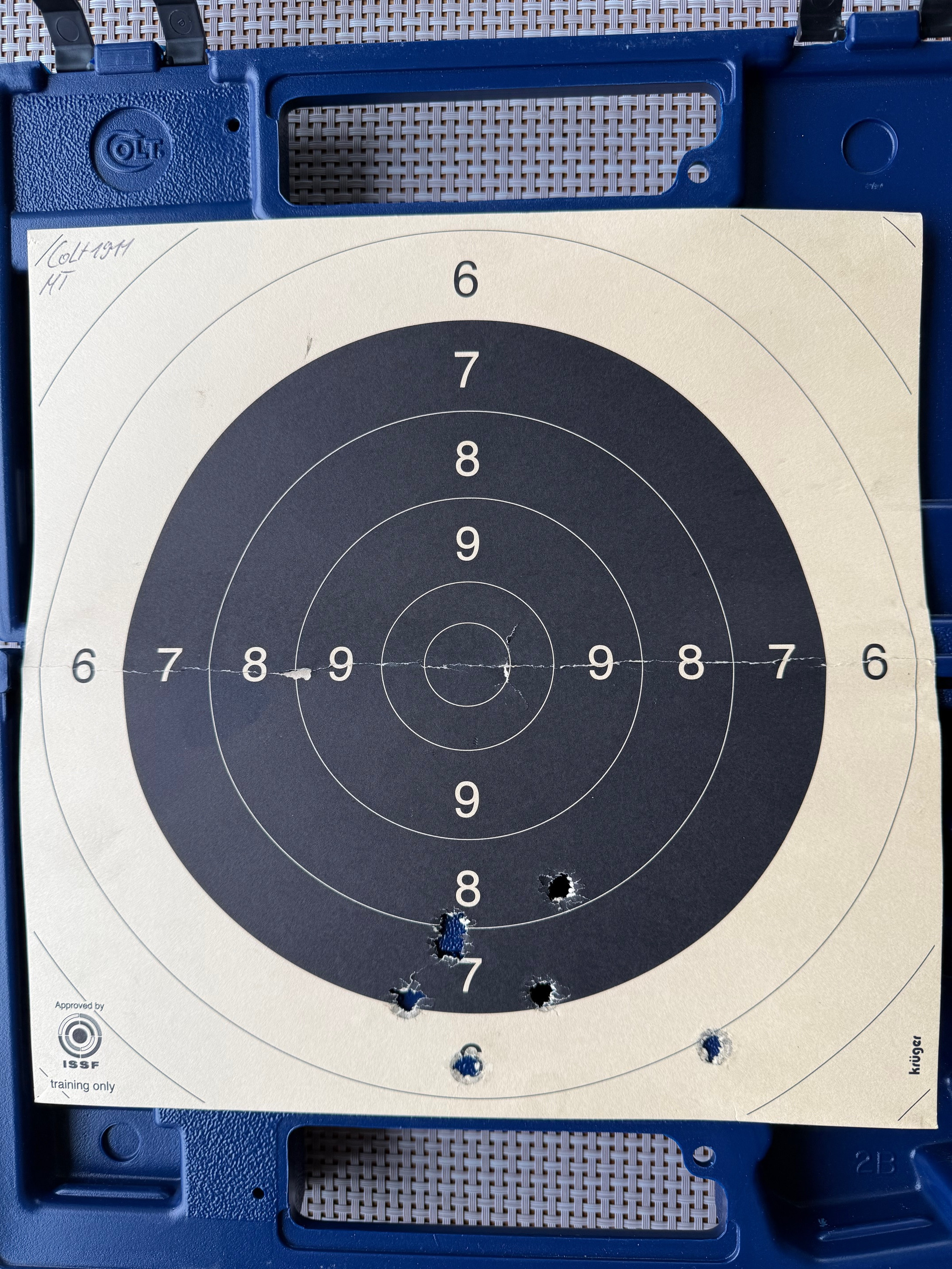Beim Colt MKIV S.70 handelt es sich um eine M1911A1 Variante mit verbessertem "Collet" Barrel Bushing. Dies sorgt für mehr Präzision und einen festen Sitz des Laufs im verriegelten Zustand. Bushing ist einwandfrei, ohne Schäden, wie ihr auf den Bildern sehen könnt. Generell habe ich keine 300 Schuss mit dem Colt gemacht und das nur mit sanfter Handladung mit 200 grain H&N Geschoss. Das Colt typische Bluing schimmert sehr schön und ist in gutem Zustand. Lediglich auf der rechten Seite sind am Schlitten ein paar Verfärbungen in der Brünierung sichtbar, siehe Bilder. Zug-/ Feldprofil ist scharf, Lauf spiegelblank. Insgesamt ist der Colt bis auf ein paar kleine, oberflächliche Kratzer in einem sehr schönen Zustand. Ich wollte ihn ursprünglich beim BDS verwenden, hab dafür dann jedoch kurzfristig eine P.08 bekommen. Die Waffe war 2016 beim Büchsenmacher und hat neue Original-Federn bekommen. Die Kimme wurde ganz leicht abgefräst, um eine perfekte "Fleck"-Trefferlage auf 25m zu erhalten. Siehe Anschussscheibe vom Büchsenmacher mit Magtech Fabrikmunition auf 25m anbei. Baujahr des schönen Oldtimers ist 1978, laut Colt Serial Number Lookup, und Beschuss in Deutschland war 1979. Selbstverständlich voll funktionsfähig und technisch einwandfrei.