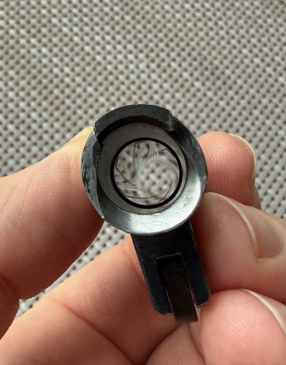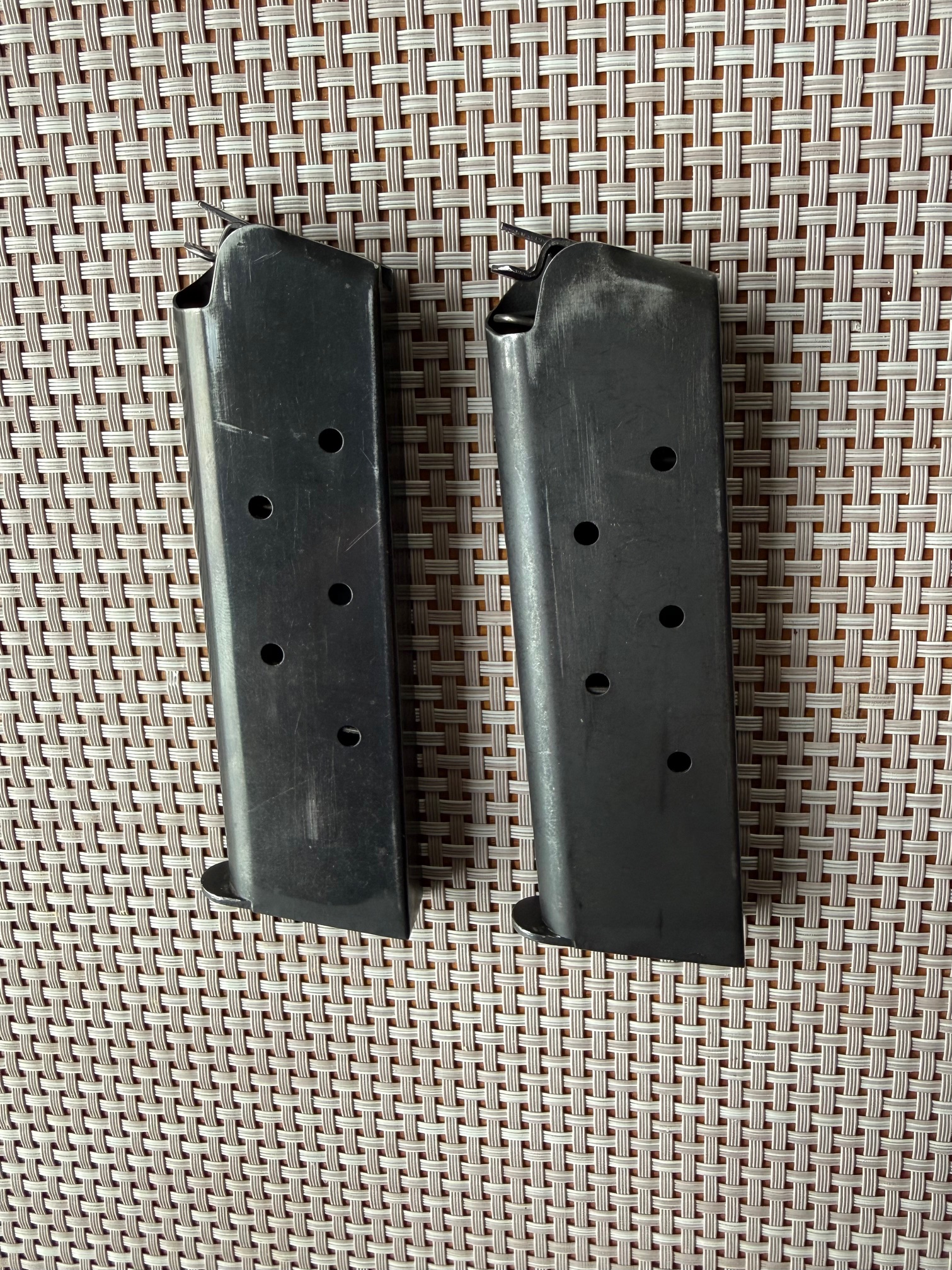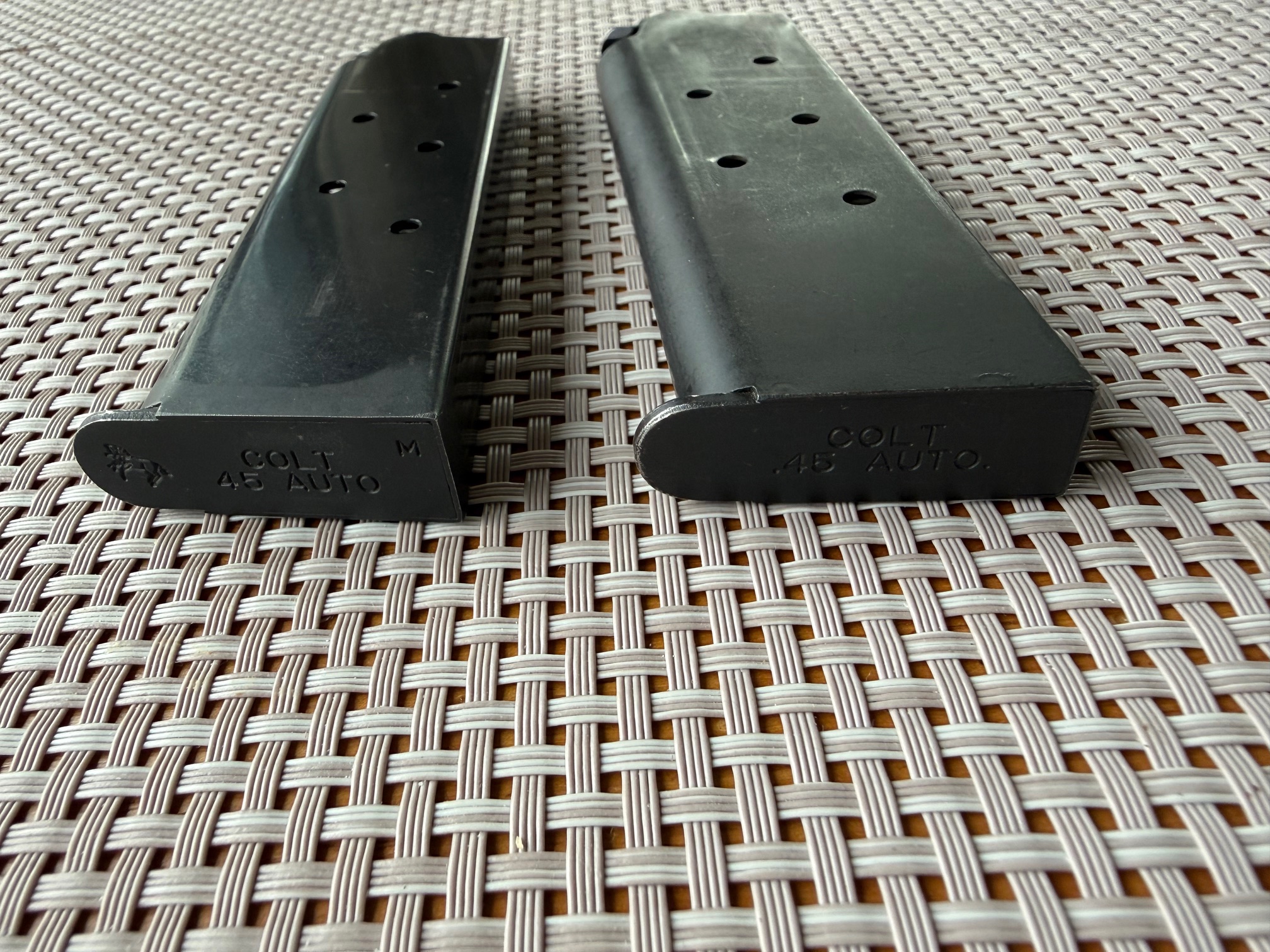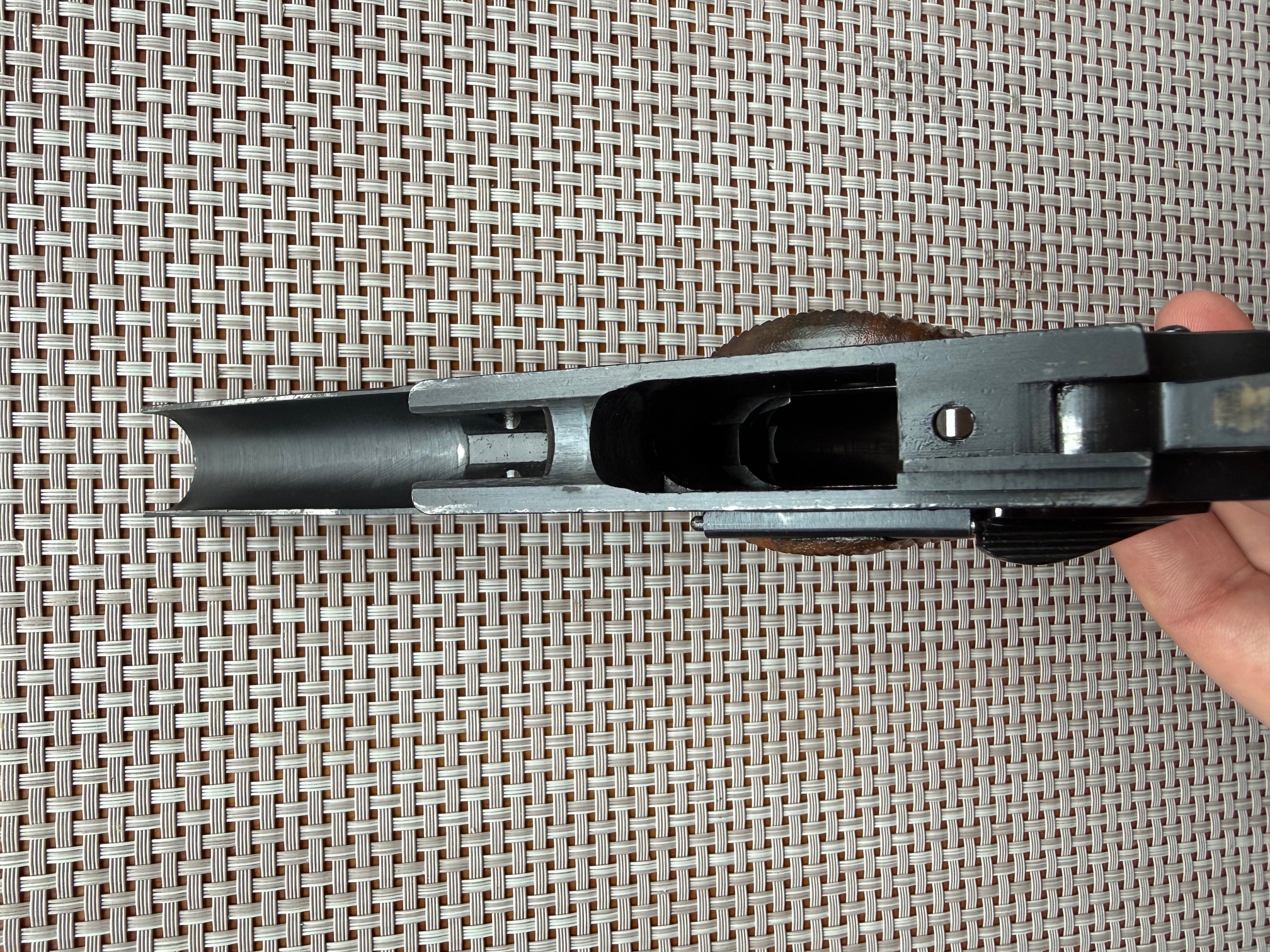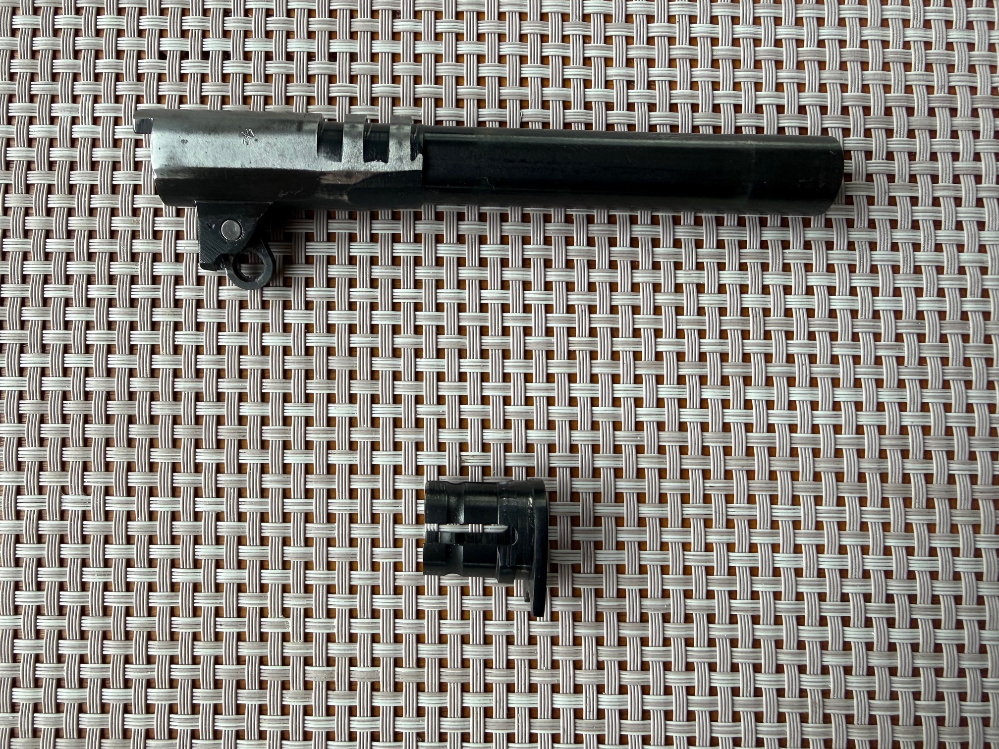 Beim Colt MKIV S.70 handelt es sich um eine M1911A1 Variante mit verbessertem "Collet" Barrel Bushing. Dies sorgt für mehr Präzision und einen festen Sitz des Laufs im verriegelten Zustand. Bushing ist einwandfrei, ohne Schäden, wie ihr auf den Bildern sehen könnt. Generell habe ich keine 300 Schuss mit dem Colt gemacht und das nur mit sanfter Handladung mit 200 grain H&N Geschoss. Das Colt typische Bluing schimmert sehr schön und ist in gutem Zustand. Lediglich auf der rechten Seite sind am Schlitten ein paar Verfärbungen in der Brünierung sichtbar, siehe Bilder. Zug-/ Feldprofil ist scharf, Lauf spiegelblank. Insgesamt ist der Colt bis auf ein paar kleine, oberflächliche Kratzer in einem sehr schönen Zustand. Ich wollte ihn ursprünglich beim BDS verwenden, hab dafür dann jedoch kurzfristig eine P.08 bekommen. Die Waffe war 2016 beim Büchsenmacher und hat neue Original-Federn bekommen. Die Kimme wurde ganz leicht abgefräst, um eine perfekte "Fleck"-Trefferlage auf 25m zu erhalten. Siehe Anschussscheibe vom Büchsenmacher mit Magtech Fabrikmunition auf 25m anbei. Baujahr des schönen Oldtimers ist 1978, laut Colt Serial Number Lookup, und Beschuss in Deutschland war 1979. Selbstverständlich voll funktionsfähig und technisch einwandfrei.