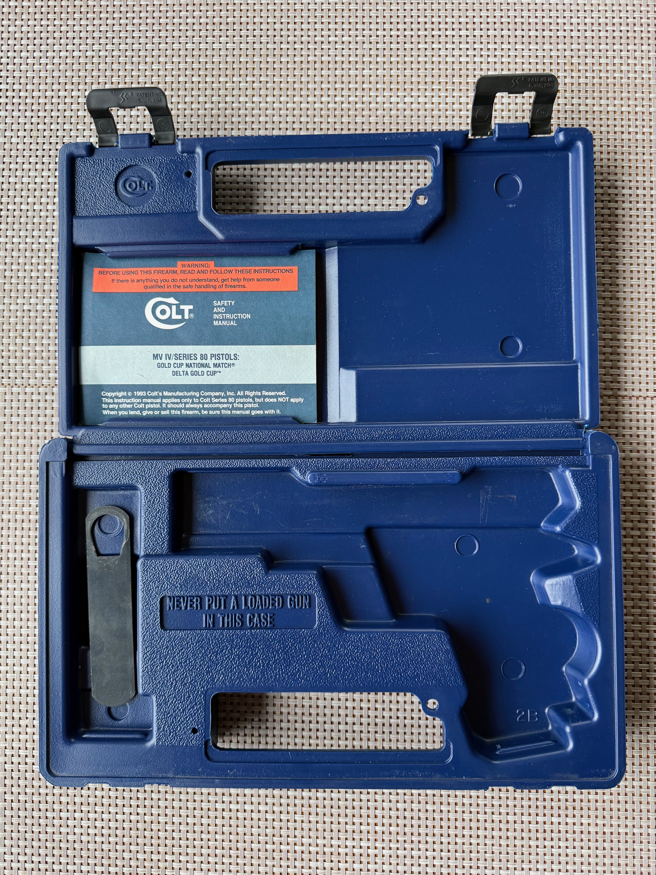 Der Colt kommt nicht in OVP, dafür aber im schönen Series 80 Koffer der 90er Jahre, zwei Original Colt Magazinen, Colt Series 80 Bedienungsanleitung und Colt Zerlegewerkzeug.
