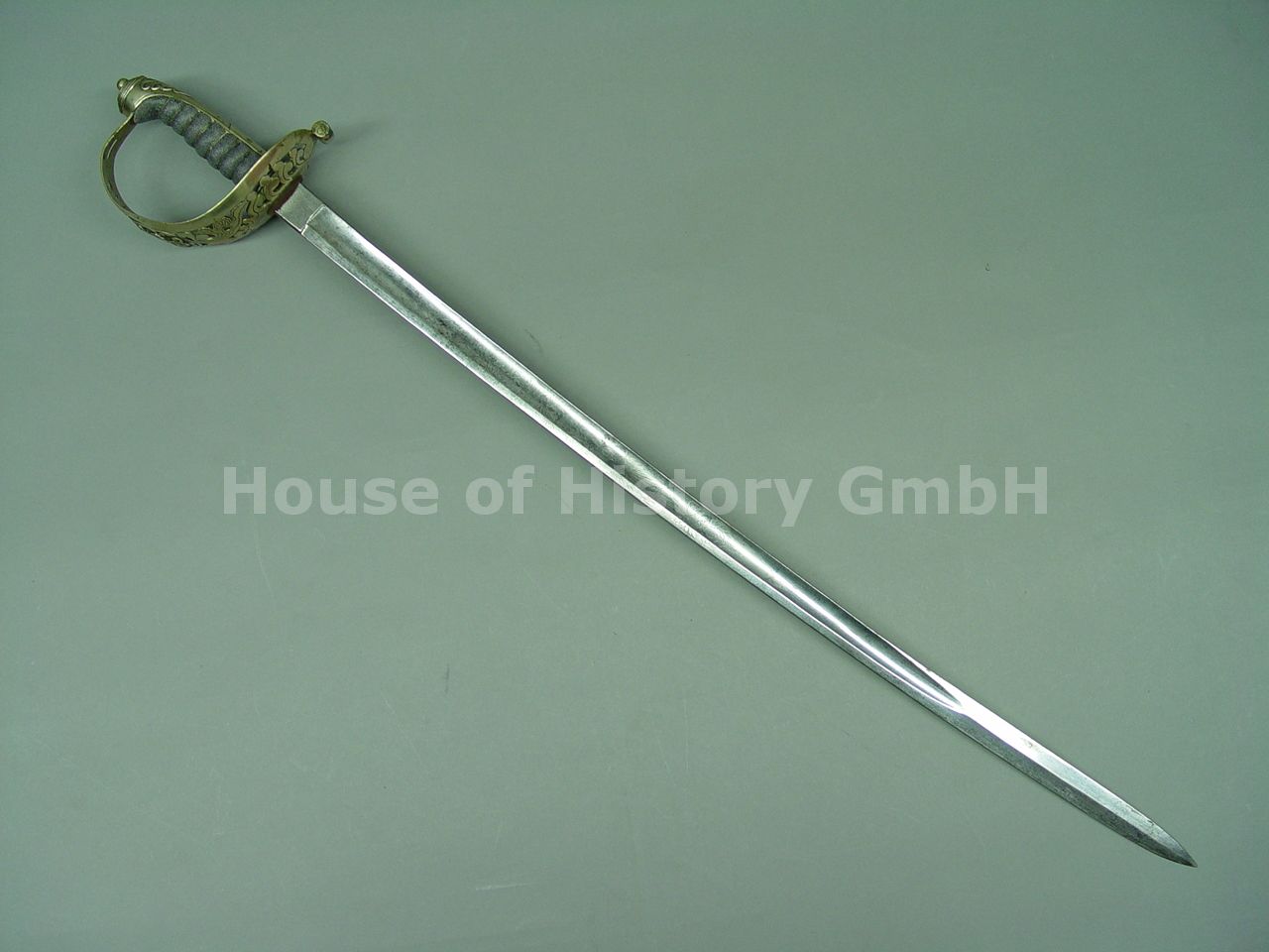 KÖNIGREICH HANNOVER Säbel Modell 1852 für Offiziere der Fußtruppen um 1860, Gefäß aus Neusilber, Korb durchbrochen gearbeitet mit floralen Mustern und zentral vorn das Herscherchiffre "GR V" unter Königskrone, oben mit Einstich für das Portepee, Rochenhautgriff mit fehlender Drahtwicklung, Fingerschlaufe entfernt, leicht geschwungene Klinge, an der Wurzel ca.29 mm breite und 81,5 cm lange Klinge, mit beidseitiger Hohlbahn, mittig beidseitig geätzt mit Rankenverzierung und dem Herrscherchiffre "GR V" unter Königskrone, terzseitig Marke nach englischem Vorbild, auf dem Rücken mit Marke "Eisenhauer", Klinge mit Hersteller "J.G.Rohden Solingen", saubere minimal gedunkelte Klinge, originale schwarz lackierte Stahlscheide mit zwei Ringbändern und zwei beweglichen Trageringen, am Mundblech fehlt eine der zwei Schrauben, Gesamtlänge 99,5 cm, ungereinigter sehr schöner Originalzustand, sehr seltener Säbel des extrem seltenen Hersteller J.G.Rohden aus Solingen