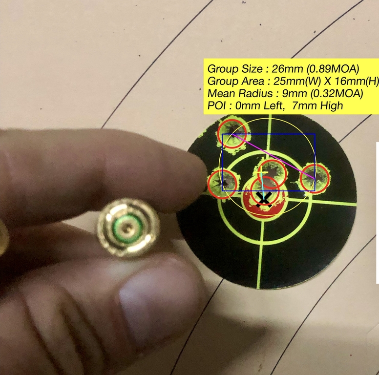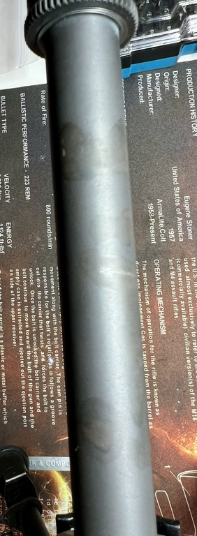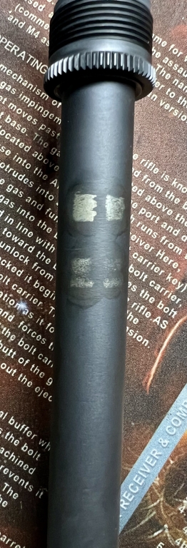 Das war vor ca. 4 Jahren, als ich eine andere Bremse lösen wollte und den Lauf falsch in den Schraubstock eingespannt hatte. Der Lauf hat sich dann im Schraubstock gedreht und die Beschichtung ist an den Stellen ab gegangen. Ich habe es dann mit „Ballistol Set Schnellbrünierung“ behandelt. Warum es nicht nachgedunkelt hat, kann ich nicht sagen, aber es hat definitiv eine Schutzschicht aufgebaut, da – wie klar zu erkennen – keine Korrosion stattgefunden hat. Die Präzision hat darunter auch nicht gelitten – die Schussbilder sind von NACH dem „Vorfall“.