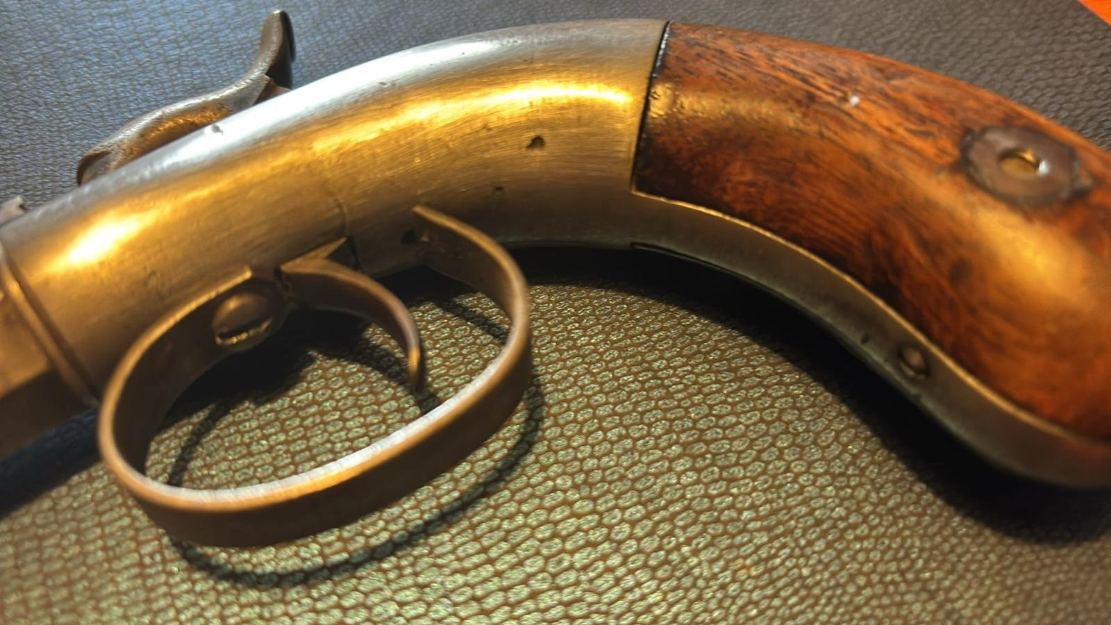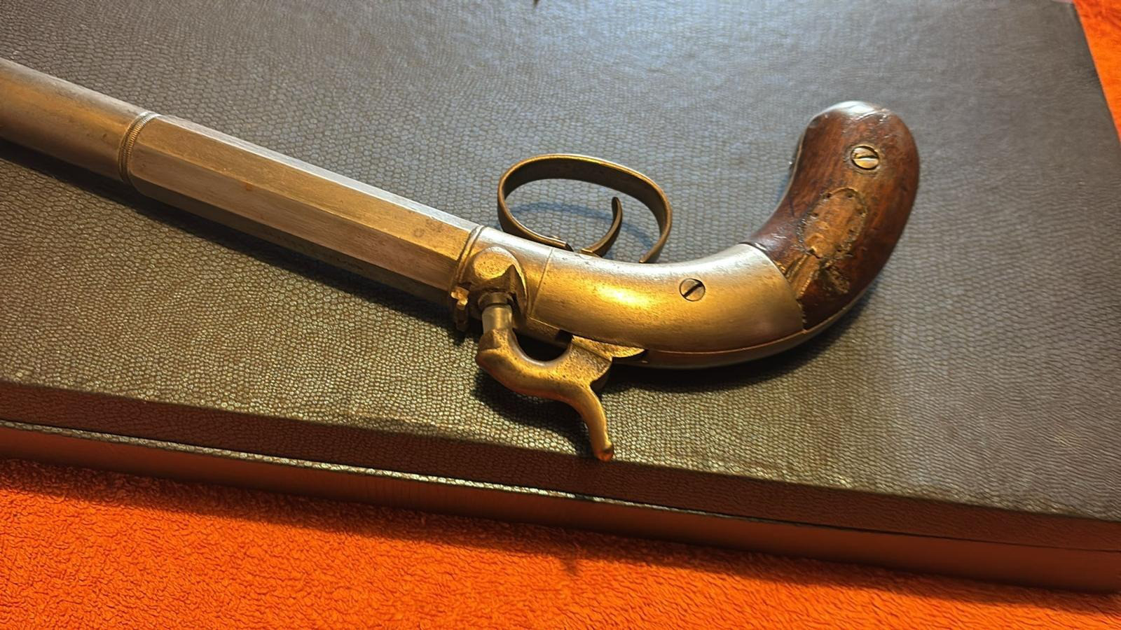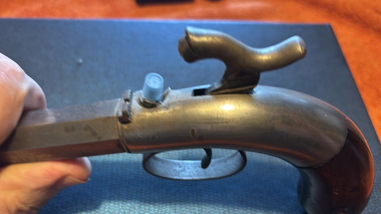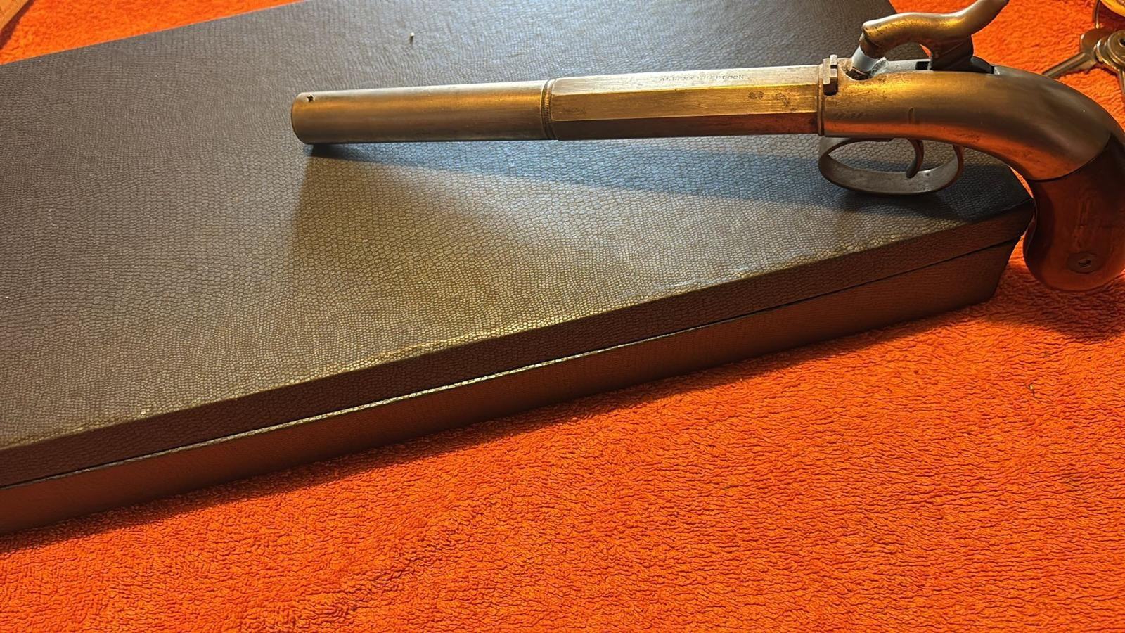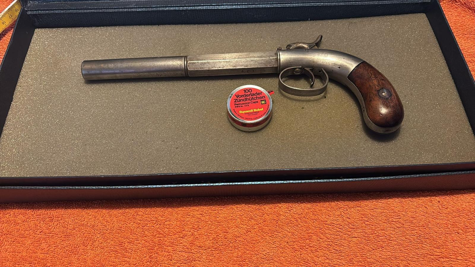 Diese alte Vorderlader Pistole - ALLEN & WHEELOCK - ist für mich im guten Zustand. Sie wird im Kasten und mit einer Dose Vorderlader Zündhütchen nach Ersteigerung versendet.