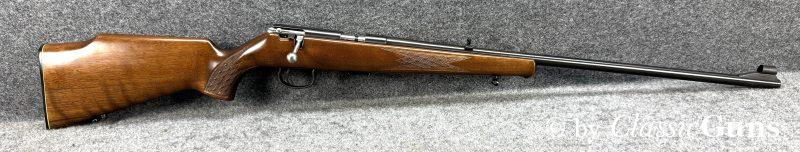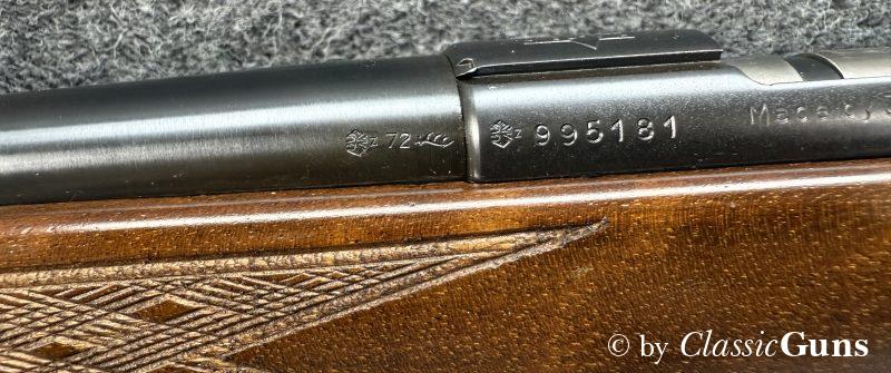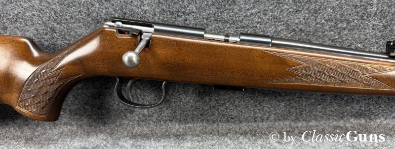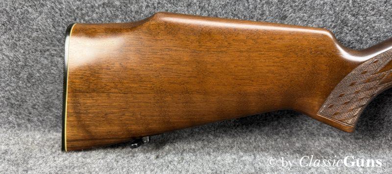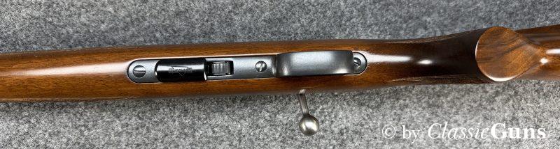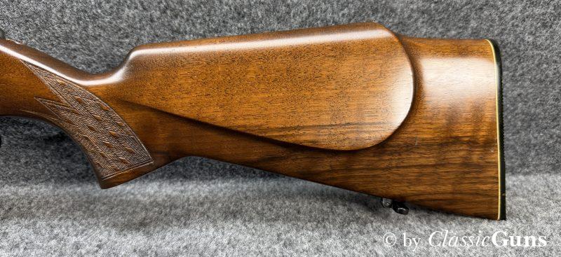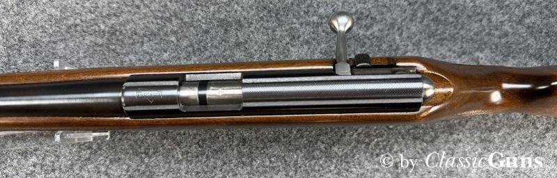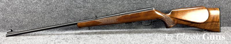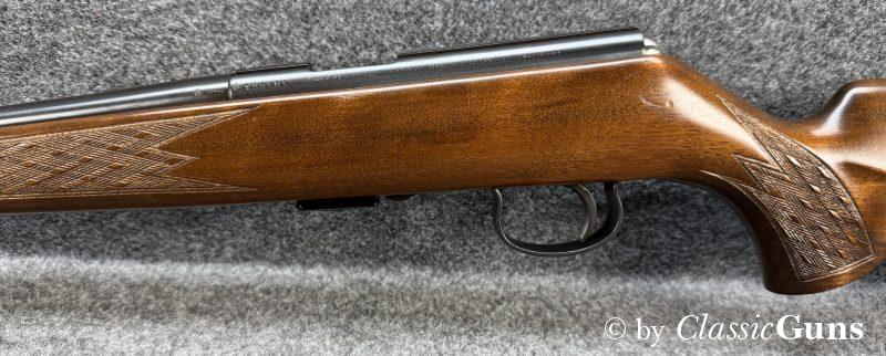 Anschütz Mod. 1415/16.22lrErstklassig erhaltene und qualitativ hochwertige KK-Büchse aus renommierter Fertigung, von unserem Büchsenmacher fachmännisch gereinigt und verantwortungsbewusst geprüft. 600 mm langer Lauf mit neuwertigem Zug-/ Feldprofil. Erstklassig erhaltene Brünierung und ebenfalls erstklassig erhaltener Schaft aus ansprechend gemasertem Nussbaum und mit Schottischer Fischhaut. 11 mm Prismenschiene, Druckpunktabzug, seitlich Schiebesicherung und Stahl Magazin für fünf Patronen. Gesamtlänge 1.070 mm, Schaftlänge 350 mm, Gewicht 2,48 kg. Deutscher CIP-Beschuss 1972, S/N 995181. |