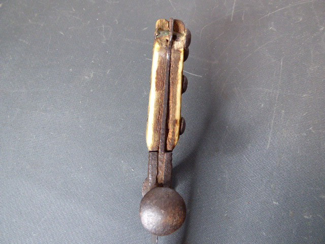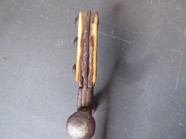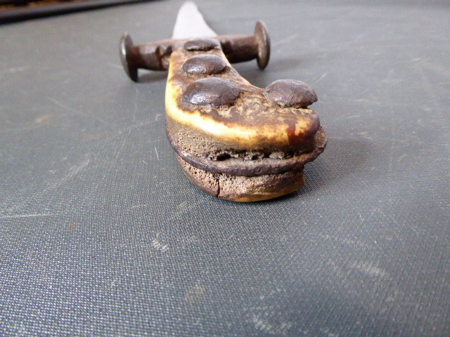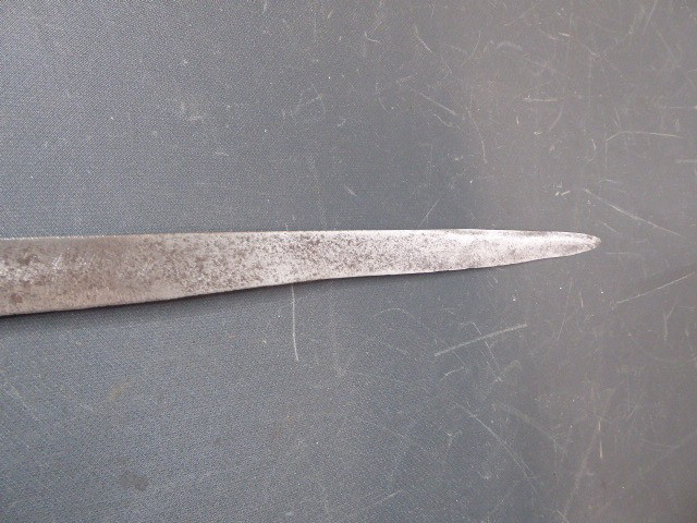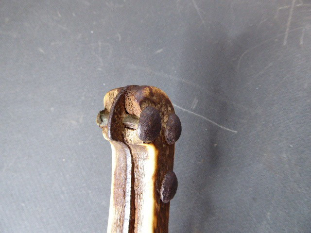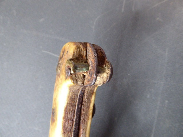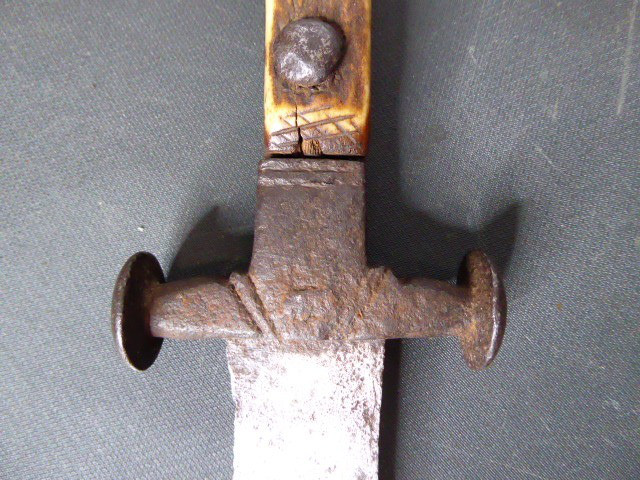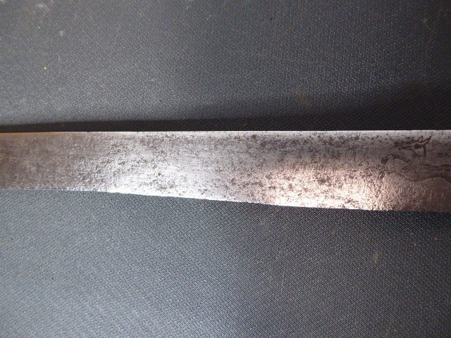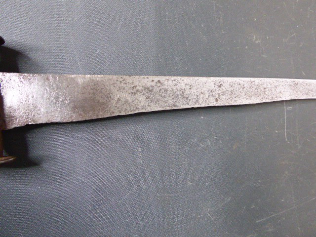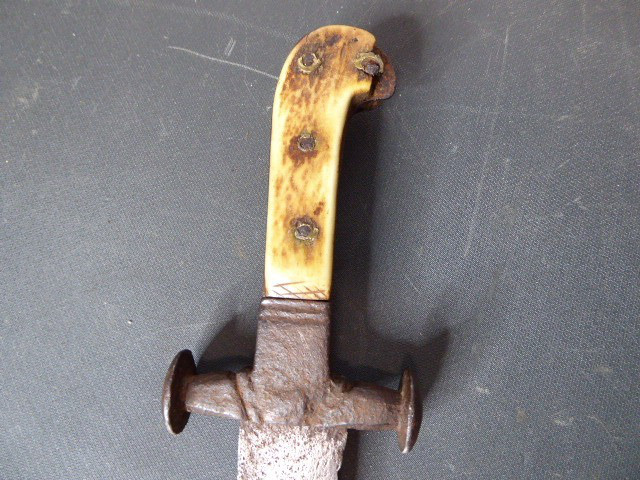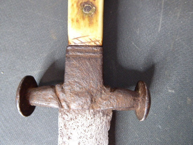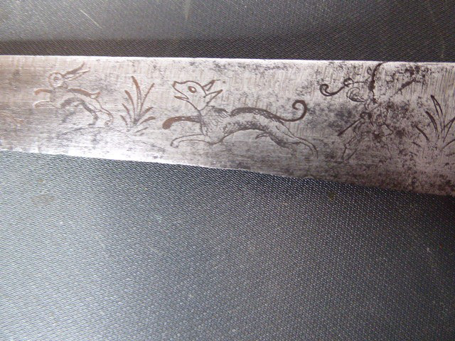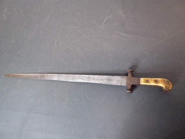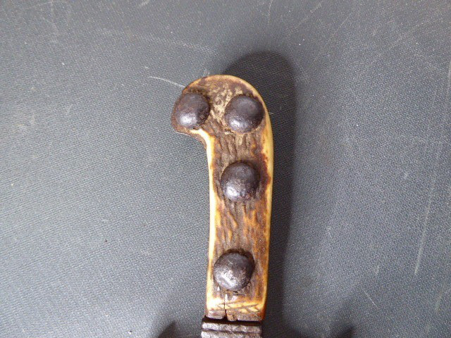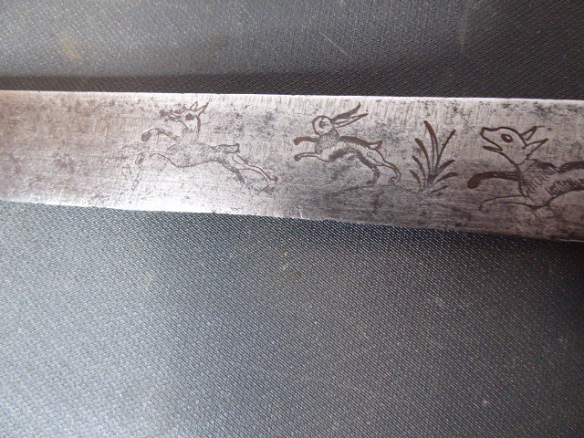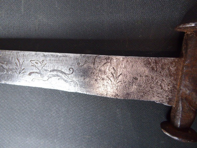 Aus meiner Sammlung gebe ich, ein sehr alten Hirschfänger ca.1650 Jhd. ohne Scheide ab. Griff Hirschhornschalen, einseitig 4 Eiserne Nieten. Parierung aus Eisen. Stabile stark gebrauchte einschneidige Klinge, einseitig mit Jagdlichem Motiven in Eisenschnitt. Kenner werden es sicherlich wissen wo das Teil herstammt und getragen wurde. Das Teil ist im Guten Sammelwürdigen Zustand. Alles andere entnehmen Sie Bitte den Fotos. Gesamtlänge: 63 cm, Klingenlänge: 49,5 cm, Klingenbreite: 3,5 cm. Kann zu jederzeit bei mir besichtigt werden. Privatauktion keine Rücknahme und Garantie.