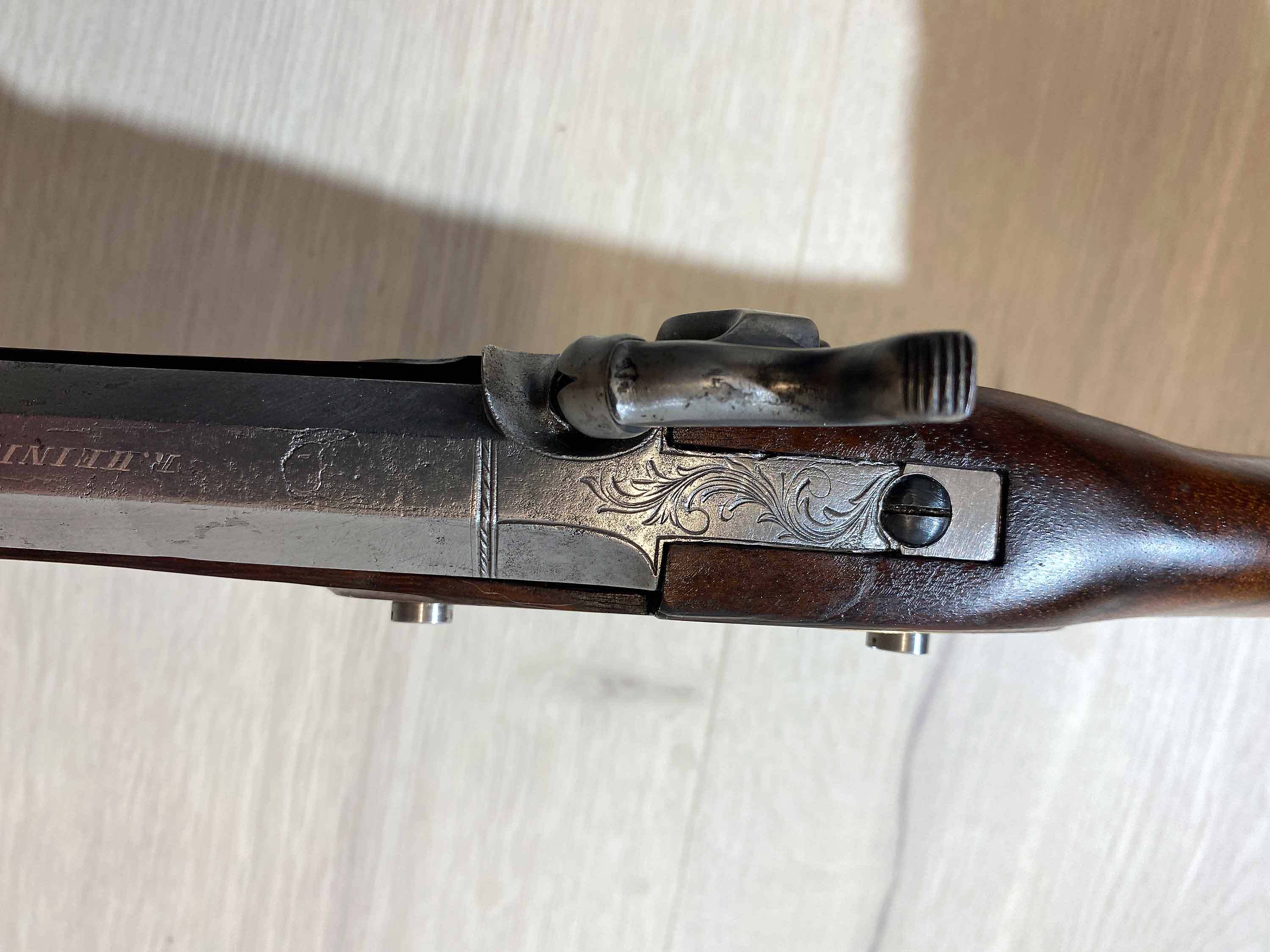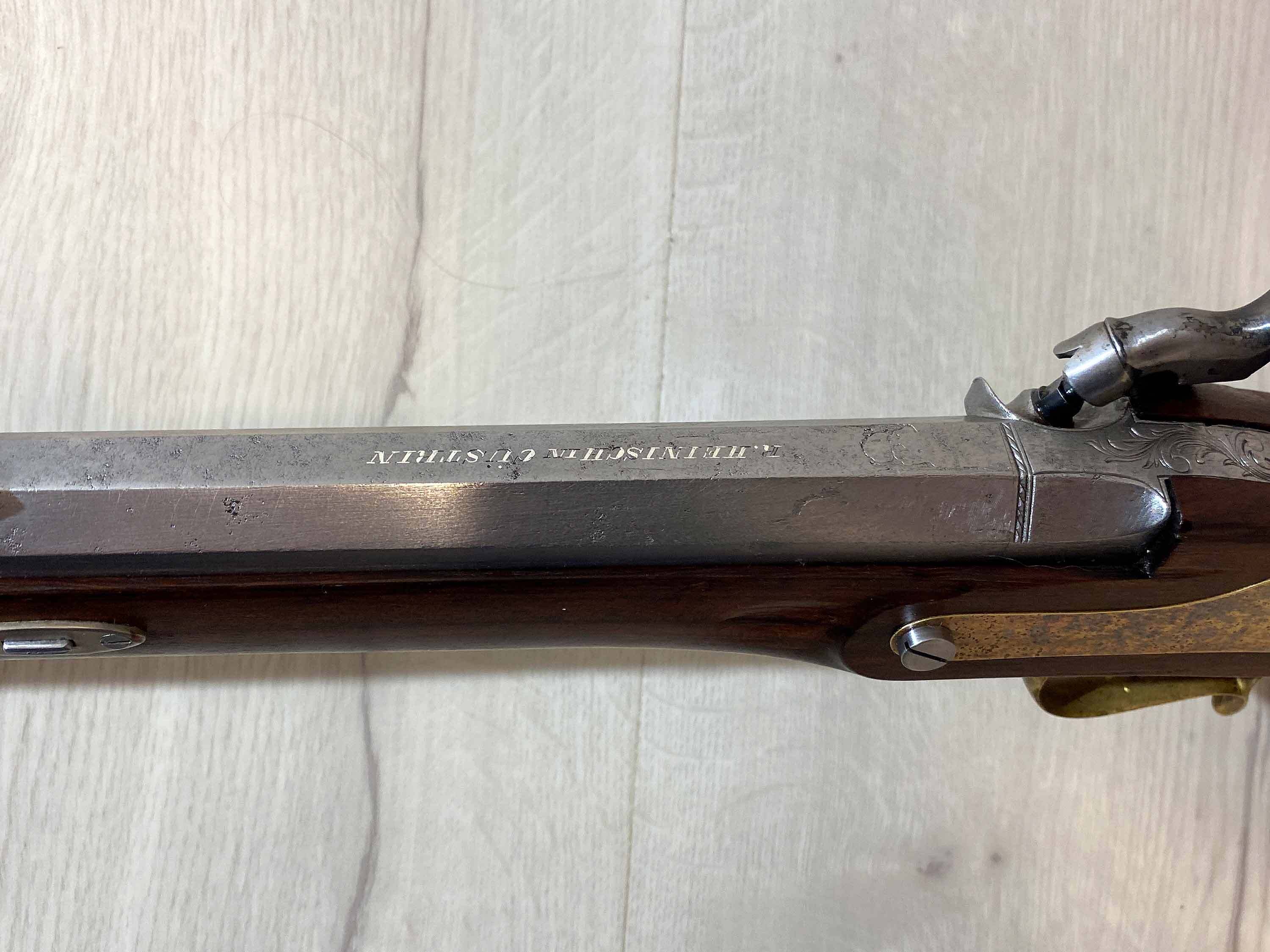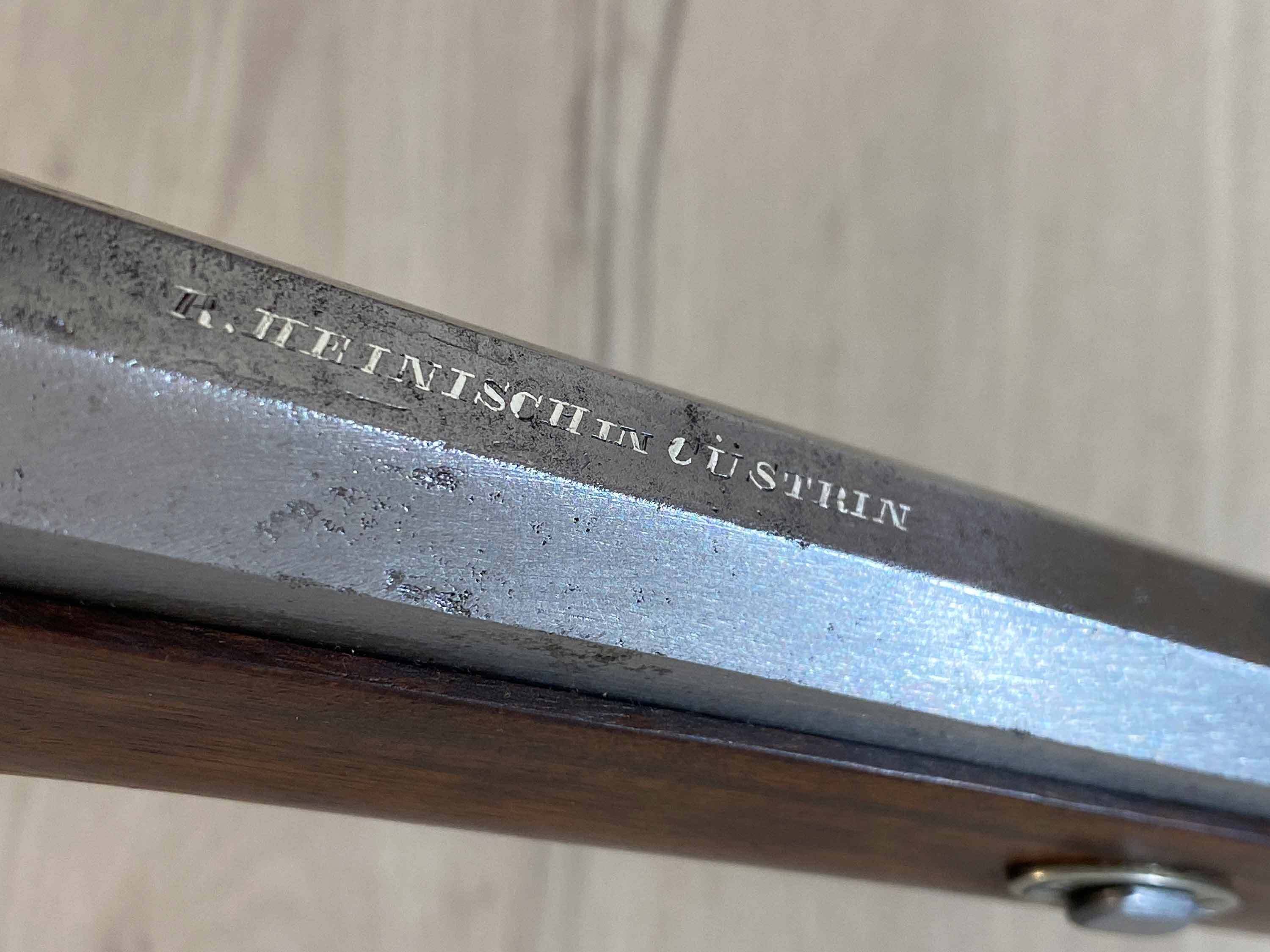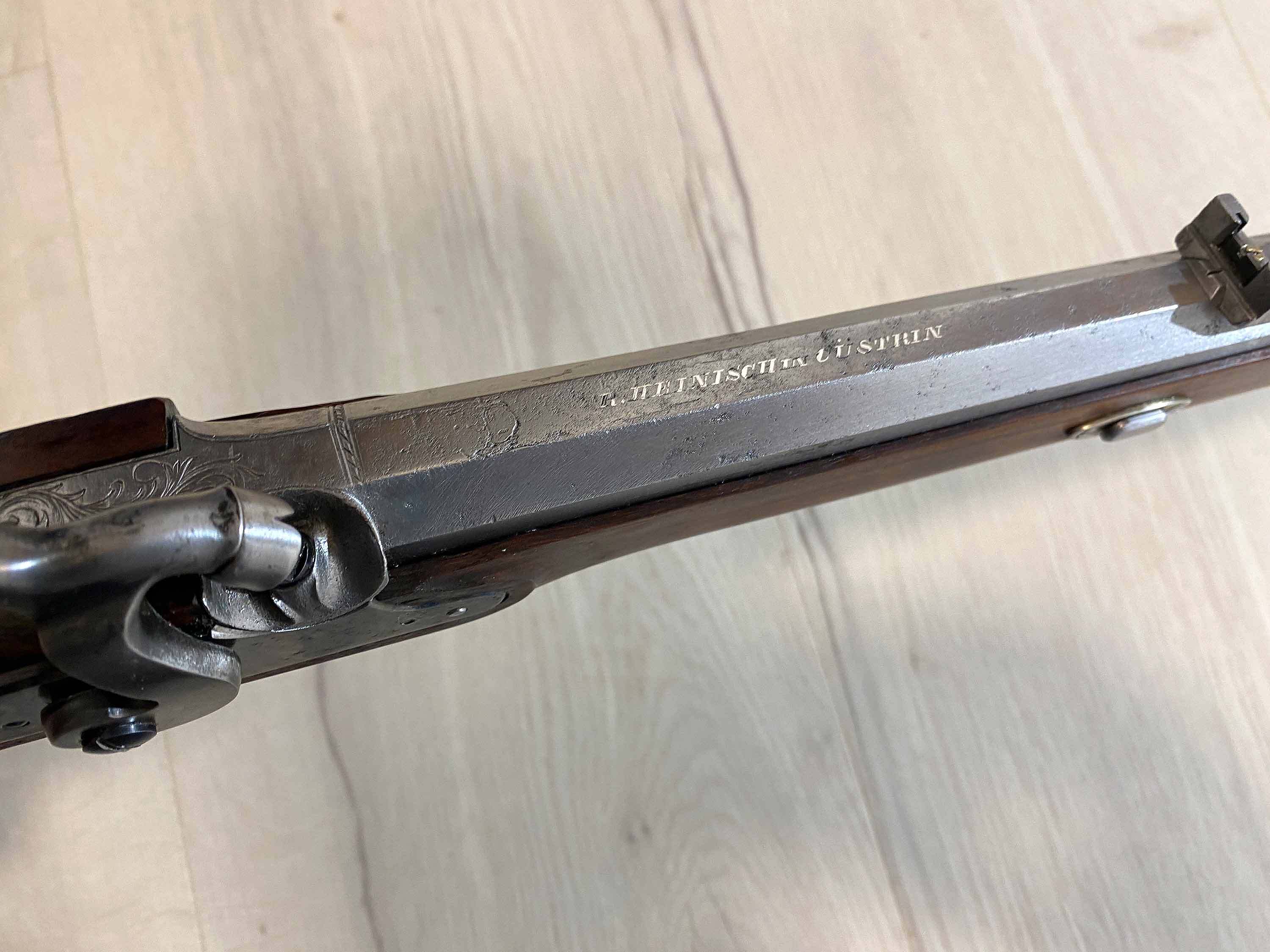 Der massive, achtkantige Lauf scheint ein historischer Lauf aus Preussen zu sein und trägt die in Silber eingefasste Beschriftung "R. Heinisch in Cüstrin". Der Lauf hat scharfe Züge, einige Verzierungen und typische Patina-Spuren.