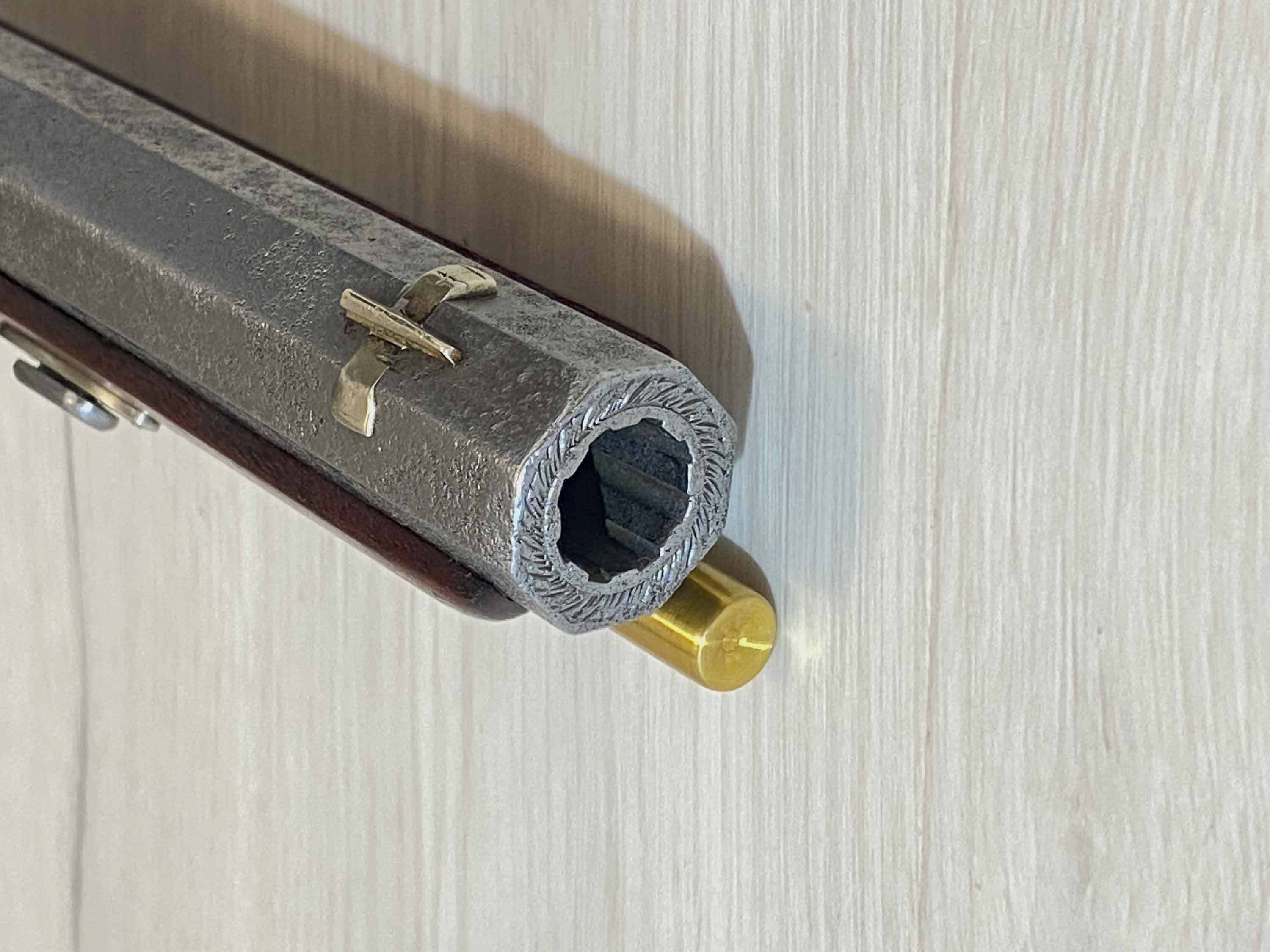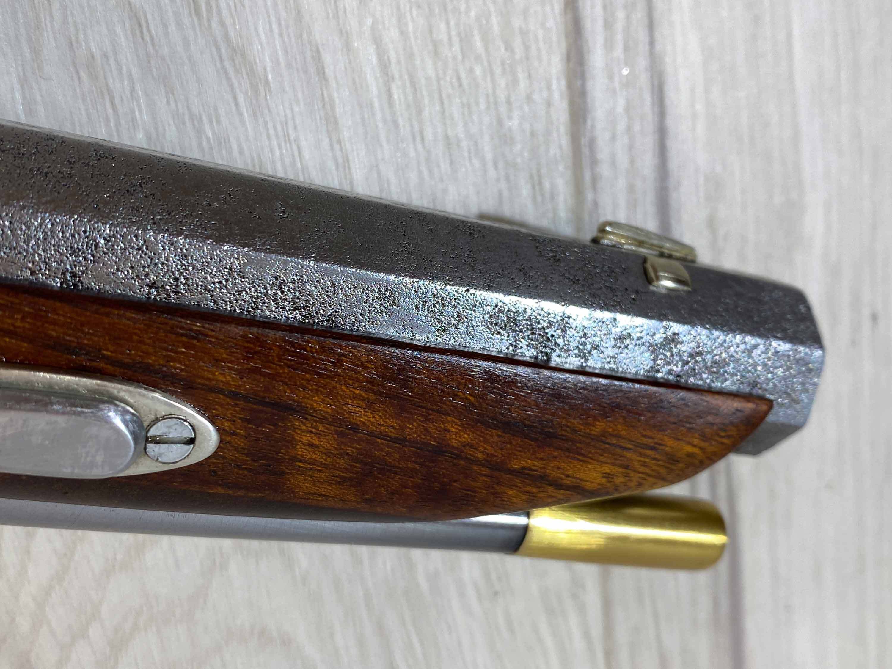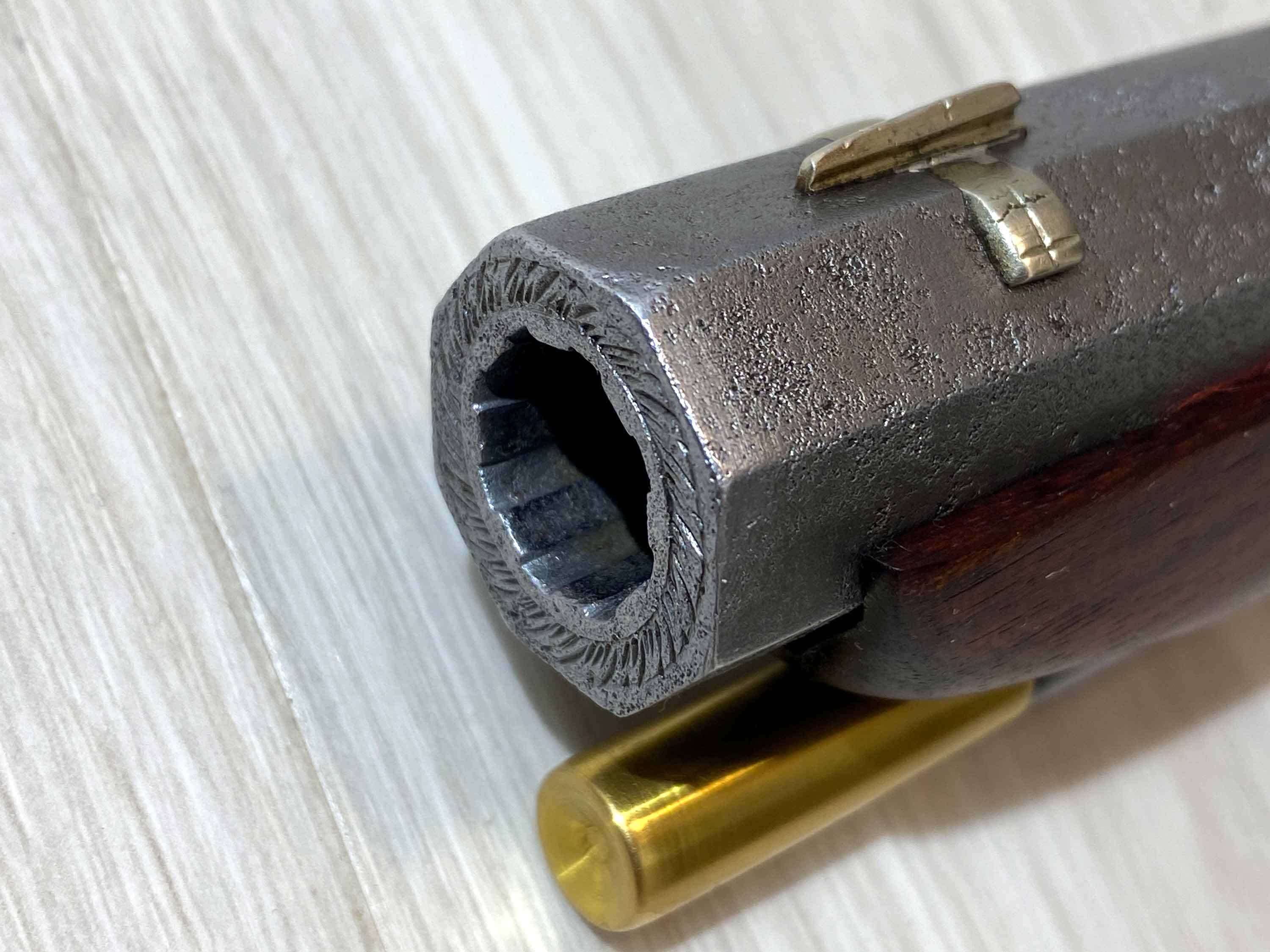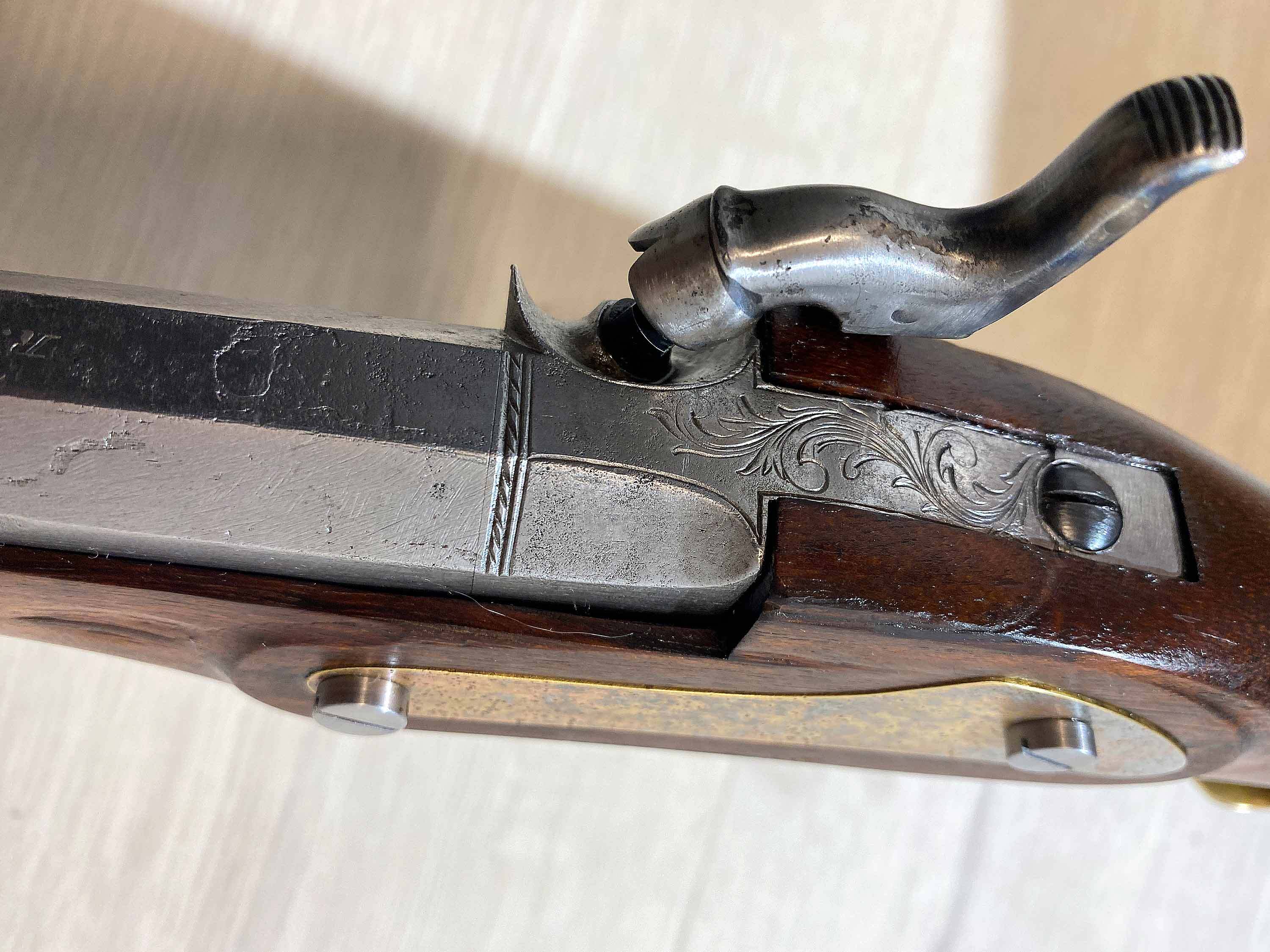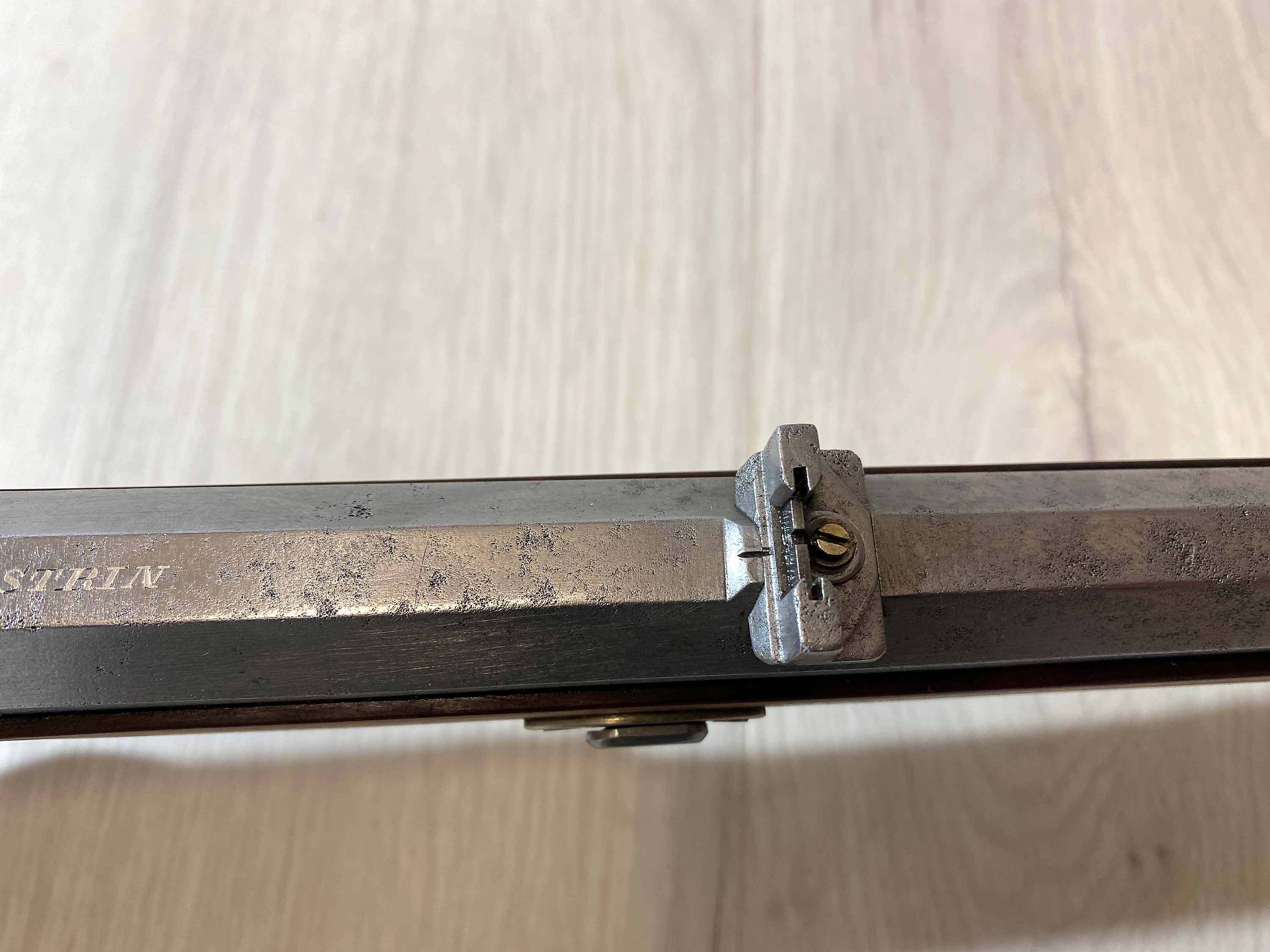 Der massive, achtkantige Lauf scheint ein historischer Lauf aus Preussen zu sein und trägt die in Silber eingefasste Beschriftung "R. Heinisch in Cüstrin". Der Lauf hat scharfe Züge, einige Verzierungen und typische Patina-Spuren.