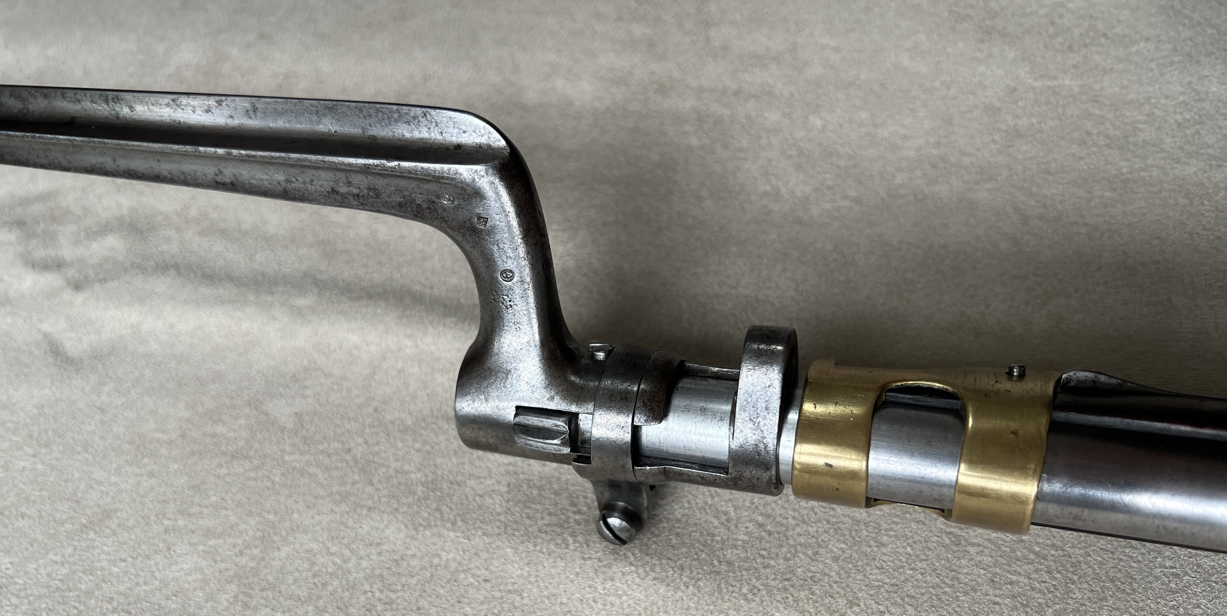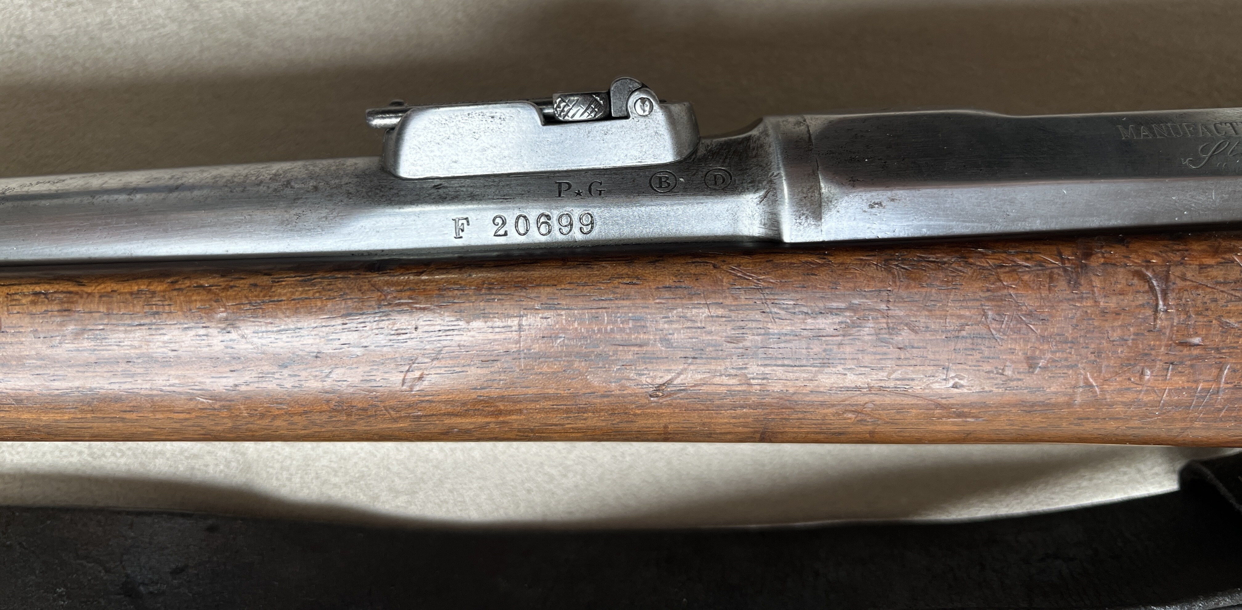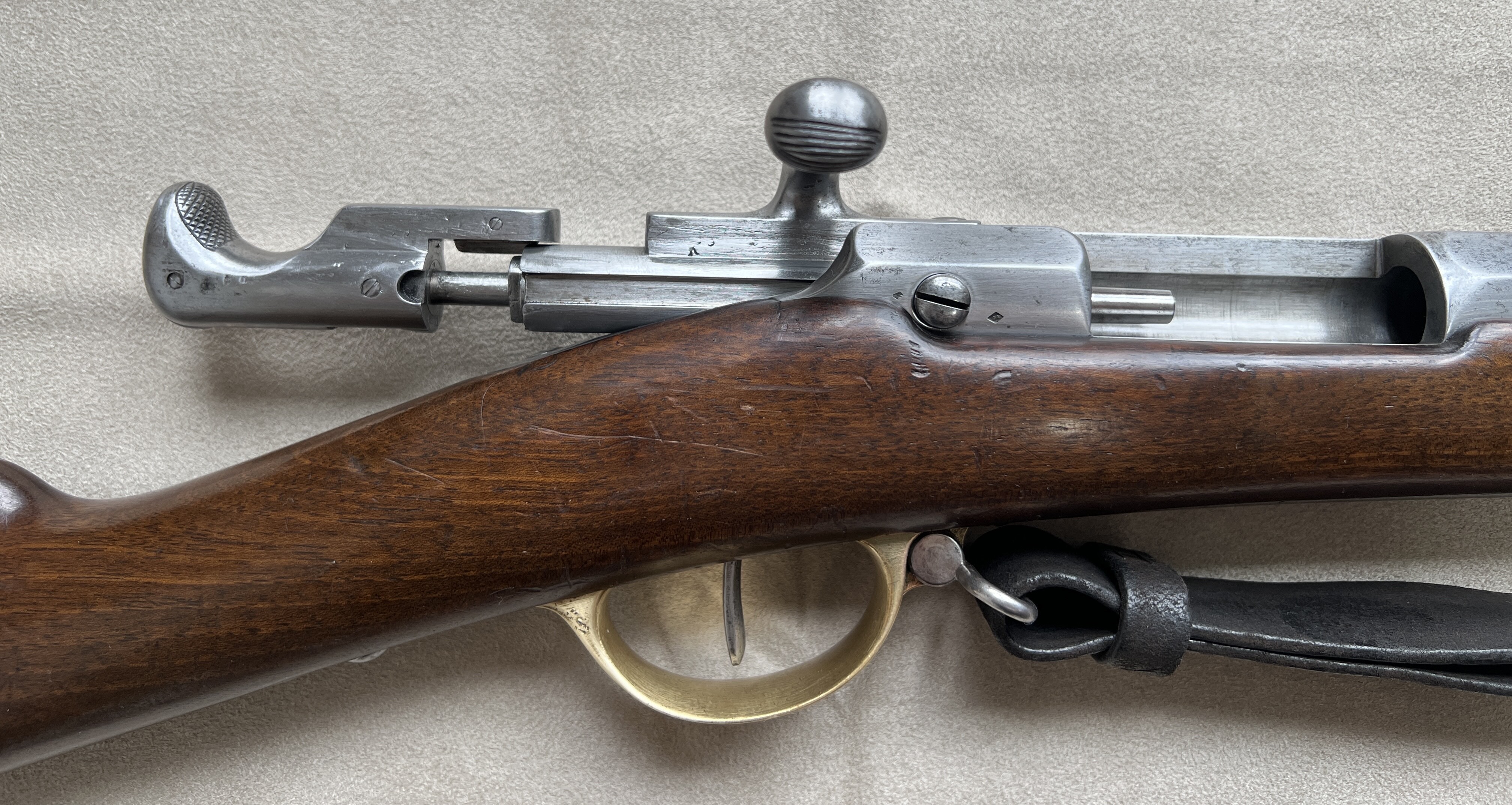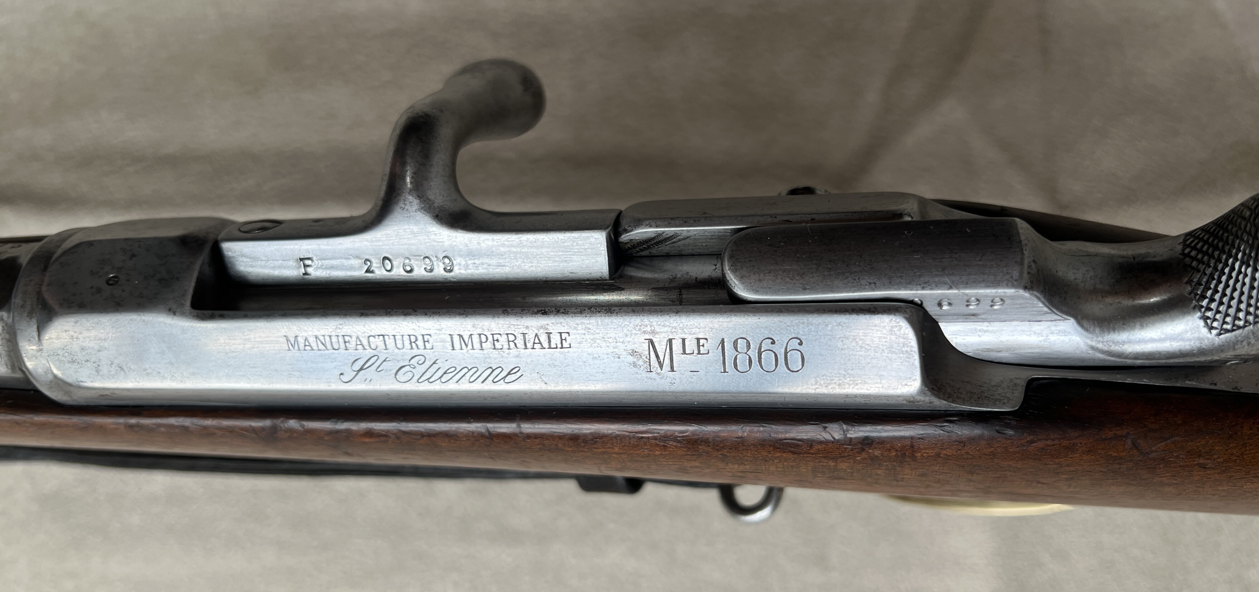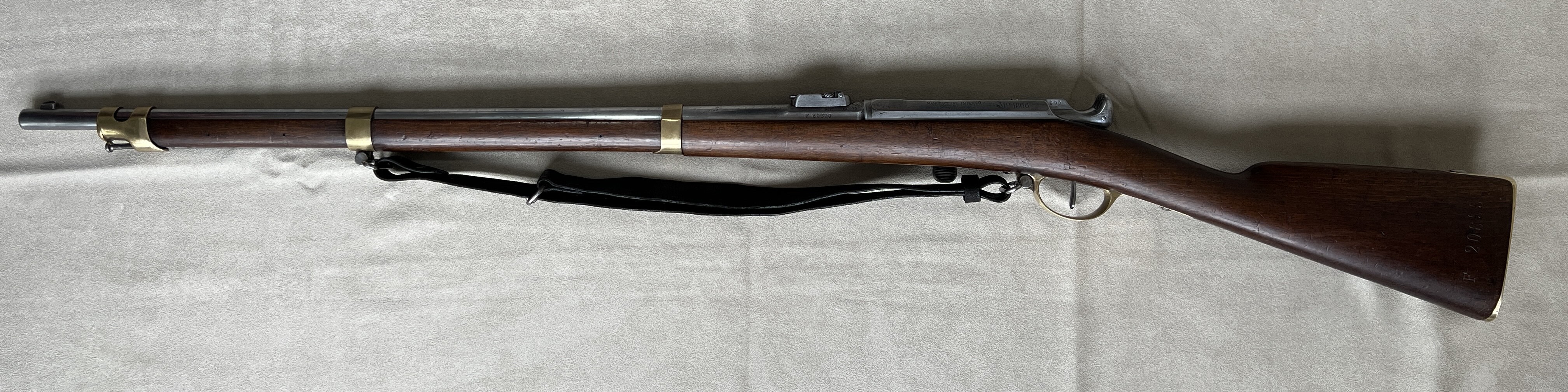 Ich verkaufe mein Chassepot Mle 1866 der Kavallerie von 1870. Das Gewehr ist nummerngleich, bis auf den Putzstab und das Bajonett. Alles funktioniert einwandfrei, die Nadel ist intakt und die Züge des Laufes sehen dem Alter entsprechend noch sehr gut aus. Das Verschlussstück wurde kürzlich gereinigt und neu gefettet. Der Lederriemen wurde mit Lederfett behandelt und scheint schon recht alt zu sein, jedoch weiß ich nicht ob er original ist.