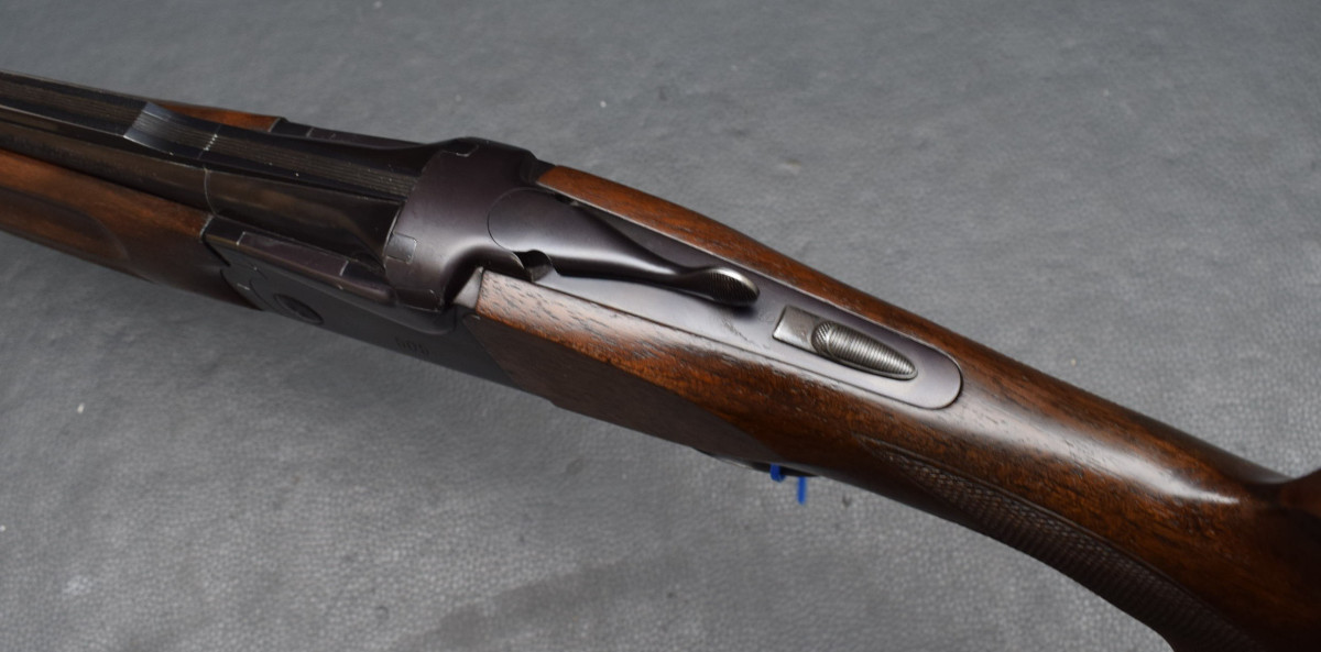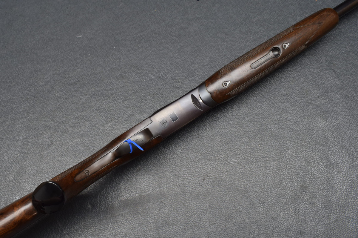 brünierte Stahlbasküle,Einabzug mit Umschalter, heller, Brünierter Stahlabzugsbügel, Sicherungsschieber auf dem Kolbenhals. Nußbaumschaft ohne Backe, mit Gummischaftkappe. Läufe sehr gut, Verschluß dicht, Brünierung 97%, Gebrauchtwaffe gut