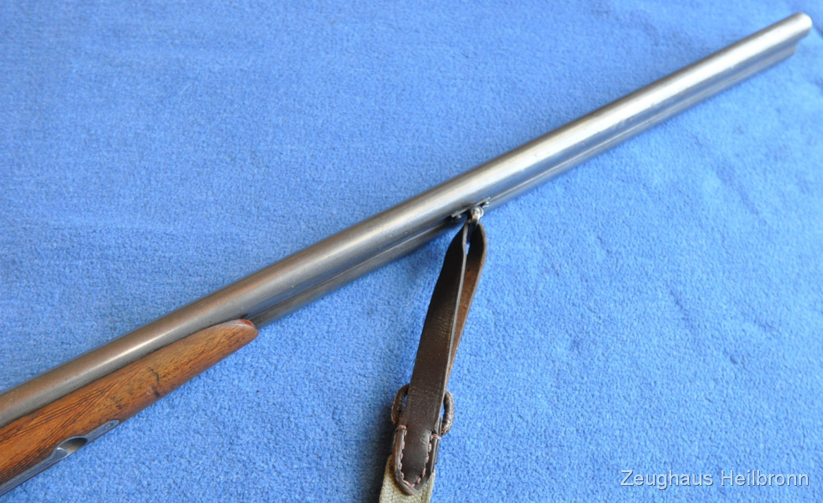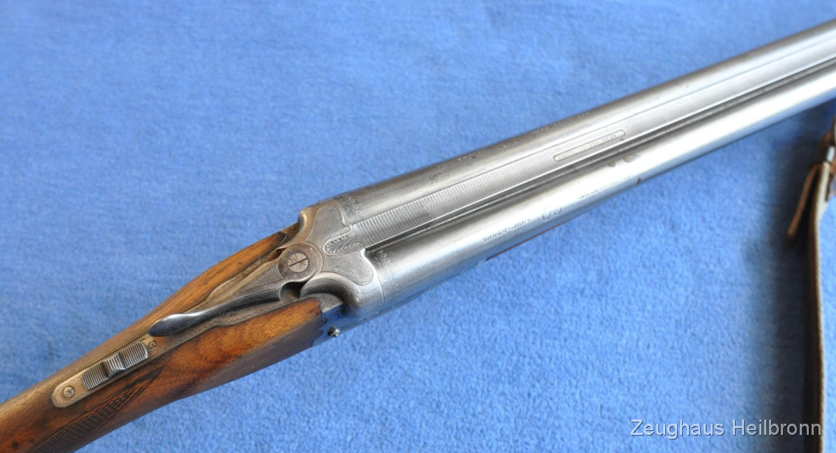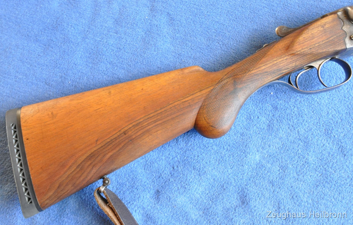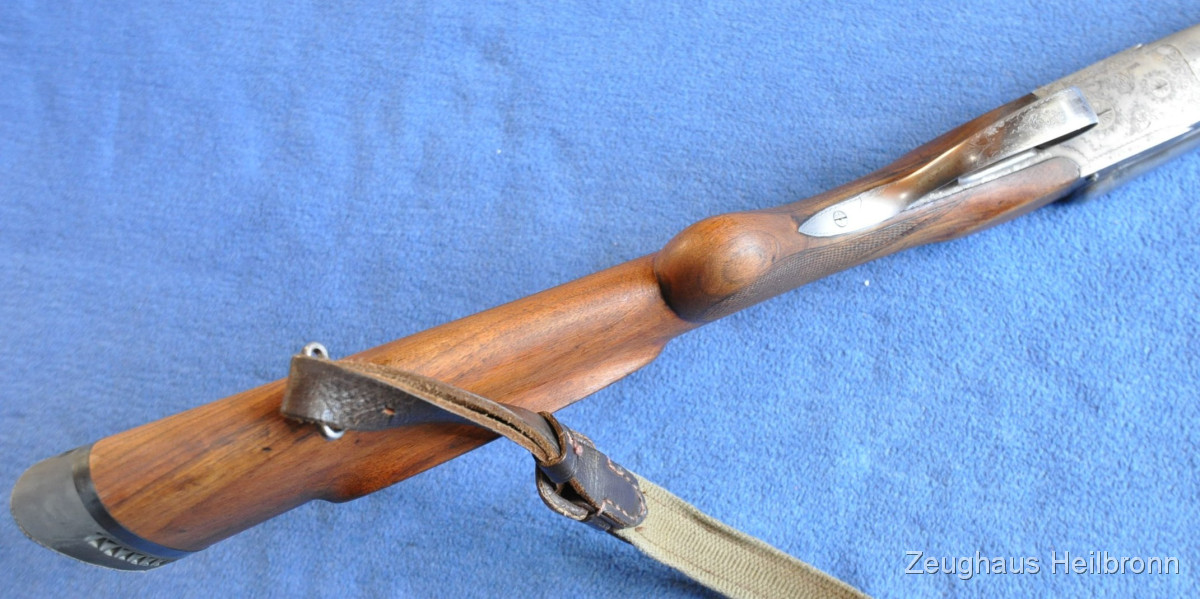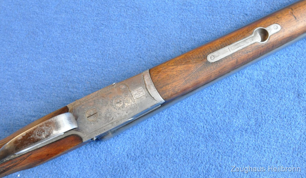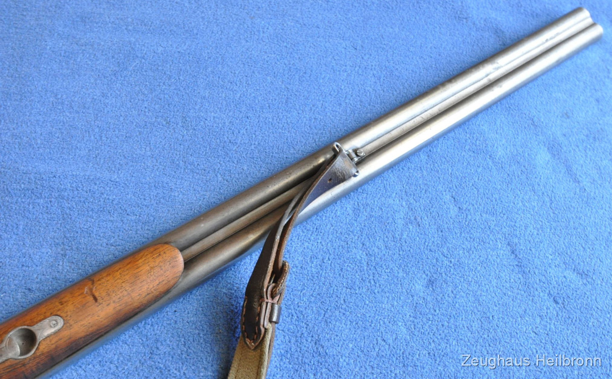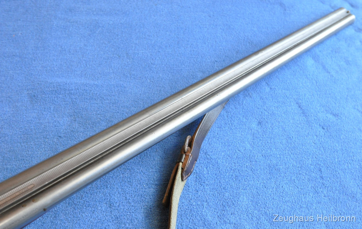 Waffe in einem gebrauchten Zustand, System dicht, Läufe blank. Systemkasten mit Gravur, Signalstifte.